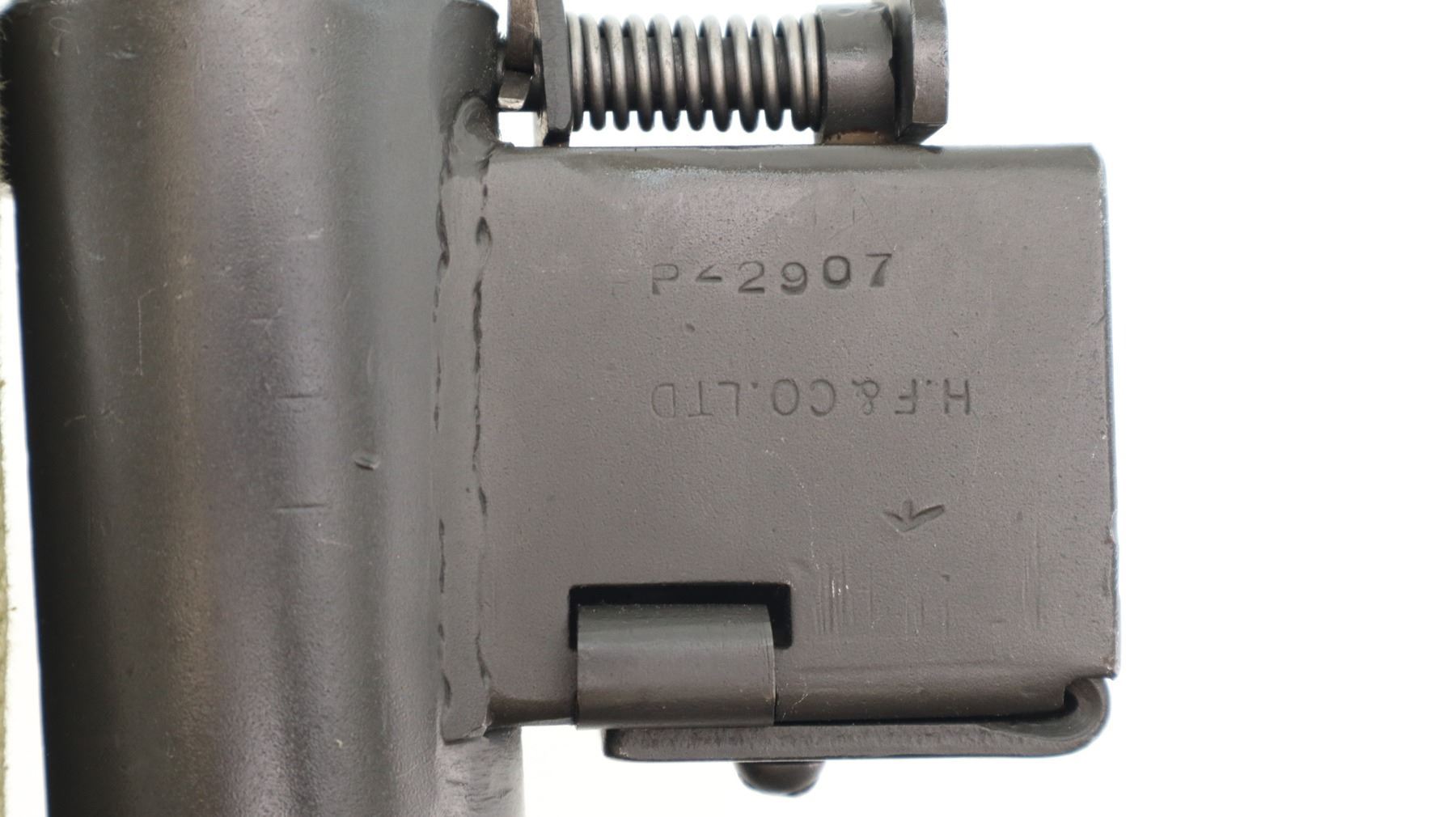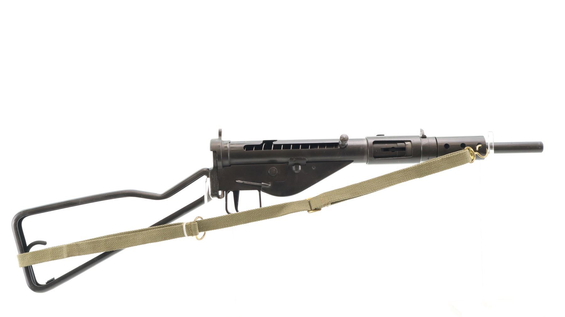 7/10, 12-3 C/A. BRITISH STEN. MODEL: MKII SMG. CALIBER: 9MM LUGER. COMES WITH MAGAZINE, CLEANING ROD. 12-3 COVERTED AUTO PROHIBITED CLASS, THIS ITEM MAY BE CALLED IN FOR A TECHNICAL INSPECTION WHICH WILL DELAY THE TRANSFER. IF YOU DON'T HAVE THIS CLASS OF LICENSE AND WOULD LIKE THIS ITEM DEACTIVATED, IT CAN BE DONE FOR AN ADDITIONAL $250.00 FEE. BORE IS FAIR, WORN, LIGHT PITTING. MANUFACTURED BY H.F & CO LTD. BLADE FRONT SIGHT, FIXED REAR PEEP SIGHT, BLACK PARKERIZED METAL FINISH, VENTILATED BARREL SHROUD, LOOP TYPE BUTT STOCK, HAS A CANVAS AND BRASS SLING ATTACHED. METAL FINISH SHOWS SOME SCRATCHES, HANDLING MARKS AND WEAR. ACTION: 12-3 CONVERTED AUTOMATIC. BARREL LENGTH: 195MM. SERIAL # 10449. CONDITION: 7/10. CLASS: CANADIAN 12-3 CONVERTED AUTO PROHIBITED CLASS. CLASS: CANADIAN 12-3 CONVERTED AUTO PROHIBITED CLASS