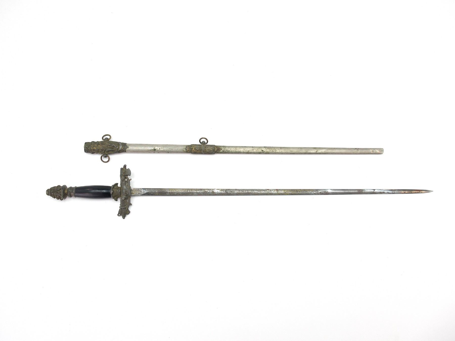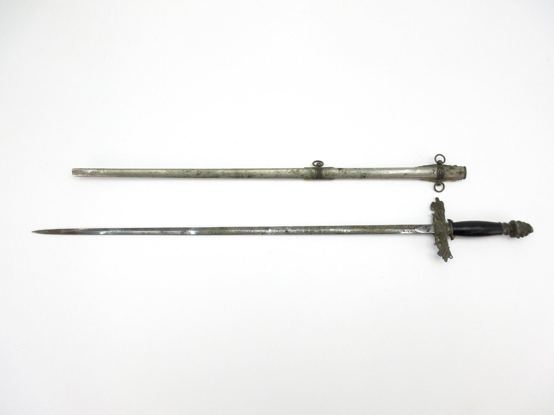 (1) STRAIGHT THIN DOUBLE-EDGED SWORD, MARKED: "W. C., MORRISON, TORONTO CANADA", BLADE ACID ETCHED: "C. R. WILLIS" WITH VARIOUS DECORATIVE ETCHINGS, OTHER-SIDE HAS VARIOUS DECORATIVE ACID ETCHINGS, ORNATE BRASS CROSS-GUARD WHICH IS LOOSE, BLACK GRIP, ORNATE TENT SHAPED BRASS POMMEL WHICH IS LOOSE, NO VISIBLE MARKINGS, STEEL SCABBARD WITH VARIOUS DECORATIVE BRASS PIECES, THREE HANGERS, TIP BROKEN / CUT, NO VISIBLE MARKINGS, SHOWS AGE / WEAR, BLADE APPROX. 28.5" & OAL APPROX. 35 7/8". SEE PHOTOS.