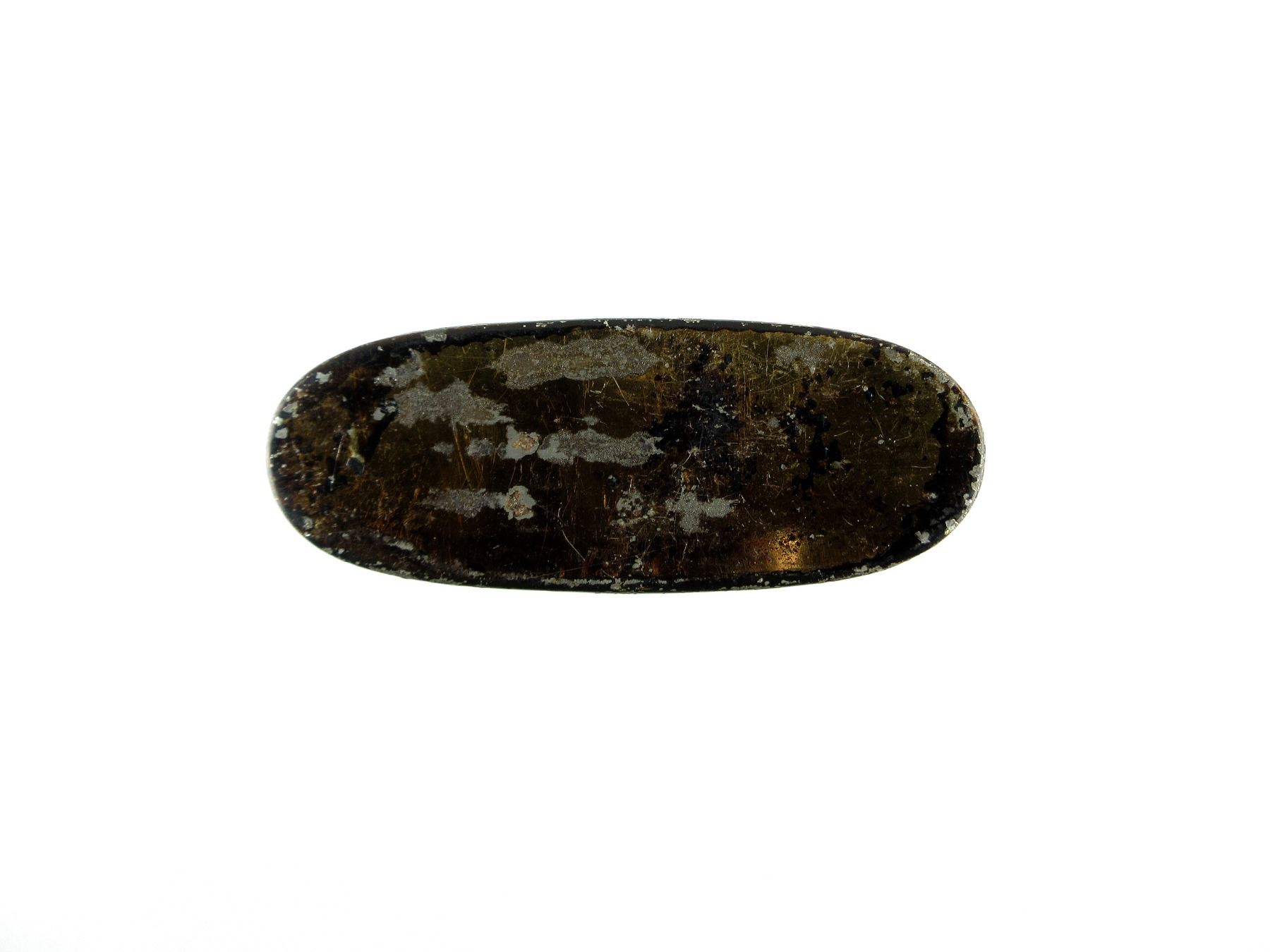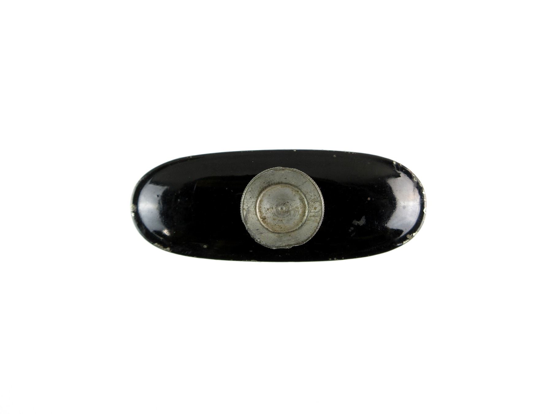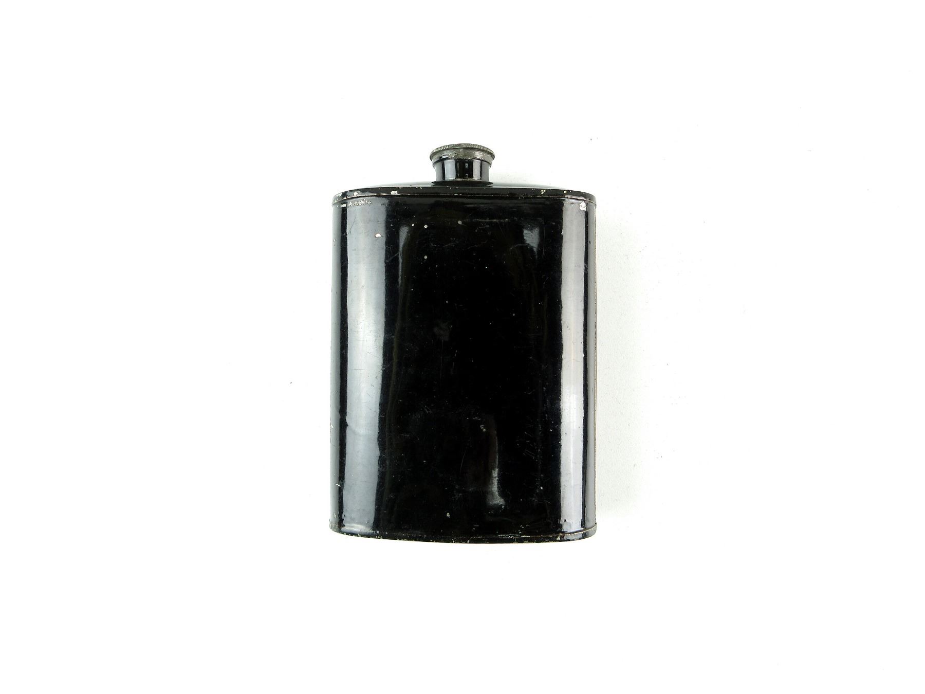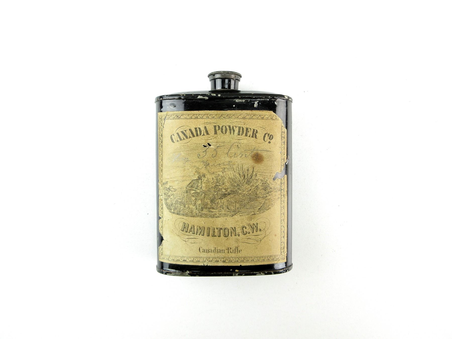 (1) METAL BLACK PAINTED BLACK POWDER TIN WITH CAP, MARKED: "CANADA POWDER CO., HAMILTON, C.W., CANADIAN RIFLE", CONSIGNOR STATES: "1854 TO 1862" & OAL APPROX. 4.75". SEE PHOTOS.