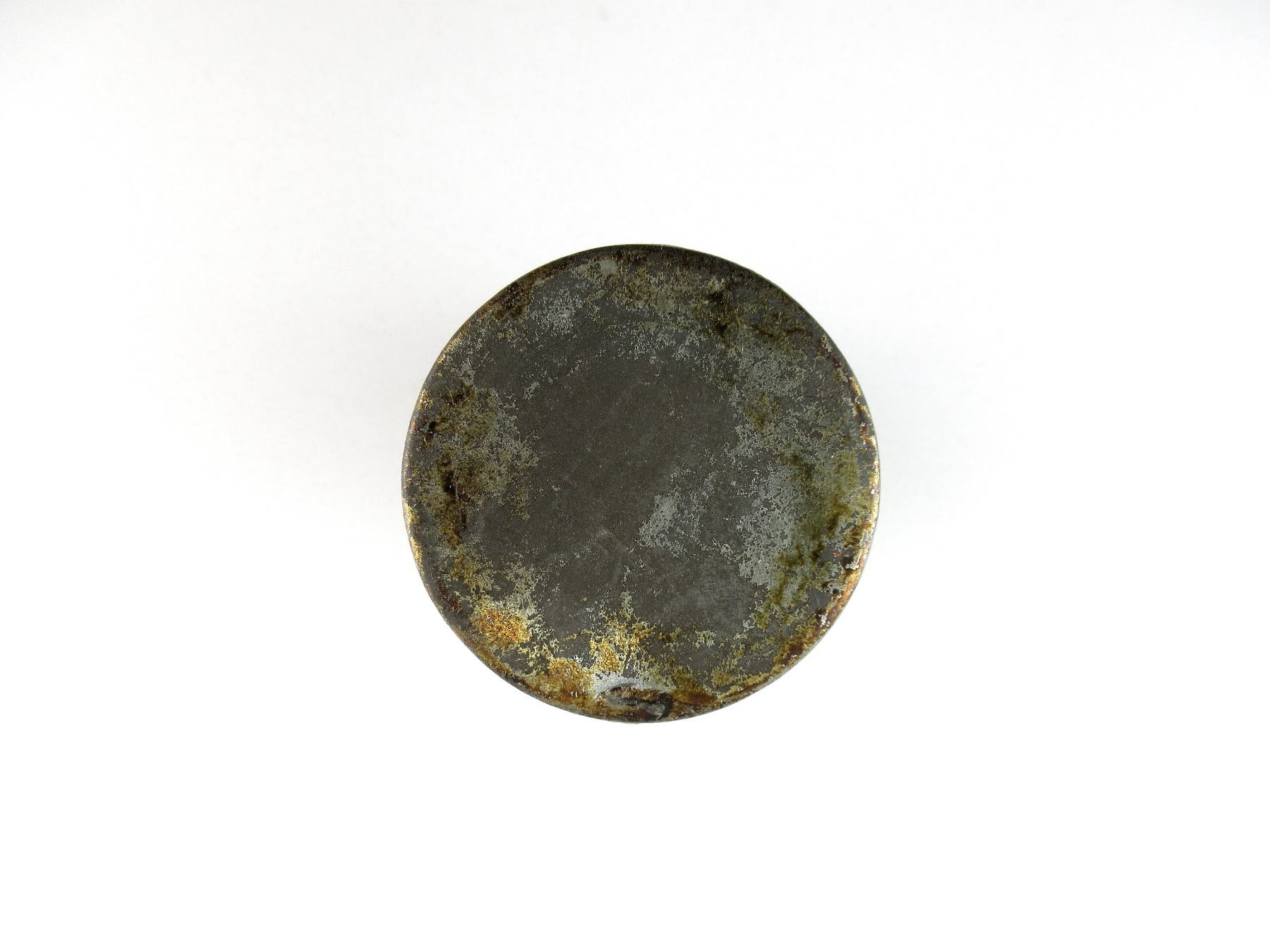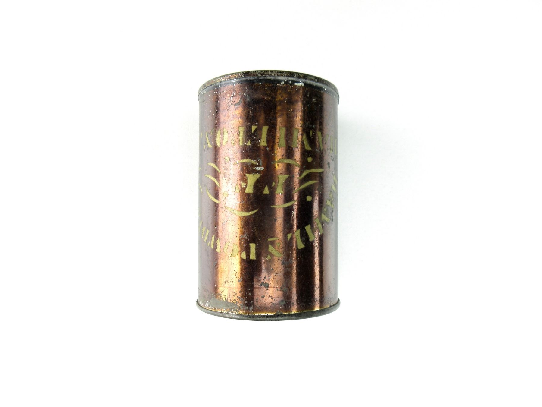 (1) METAL BROWN COLOURED BLACK POWDER TIN WITH CAP, MARKED: "HAMIL N POWDER CO., FF, HAMILTON, C.W.", CONSIGNOR STATES: "1862 TO 1867", OAL APPROX. 3 3/8". SEE PHOTOS.