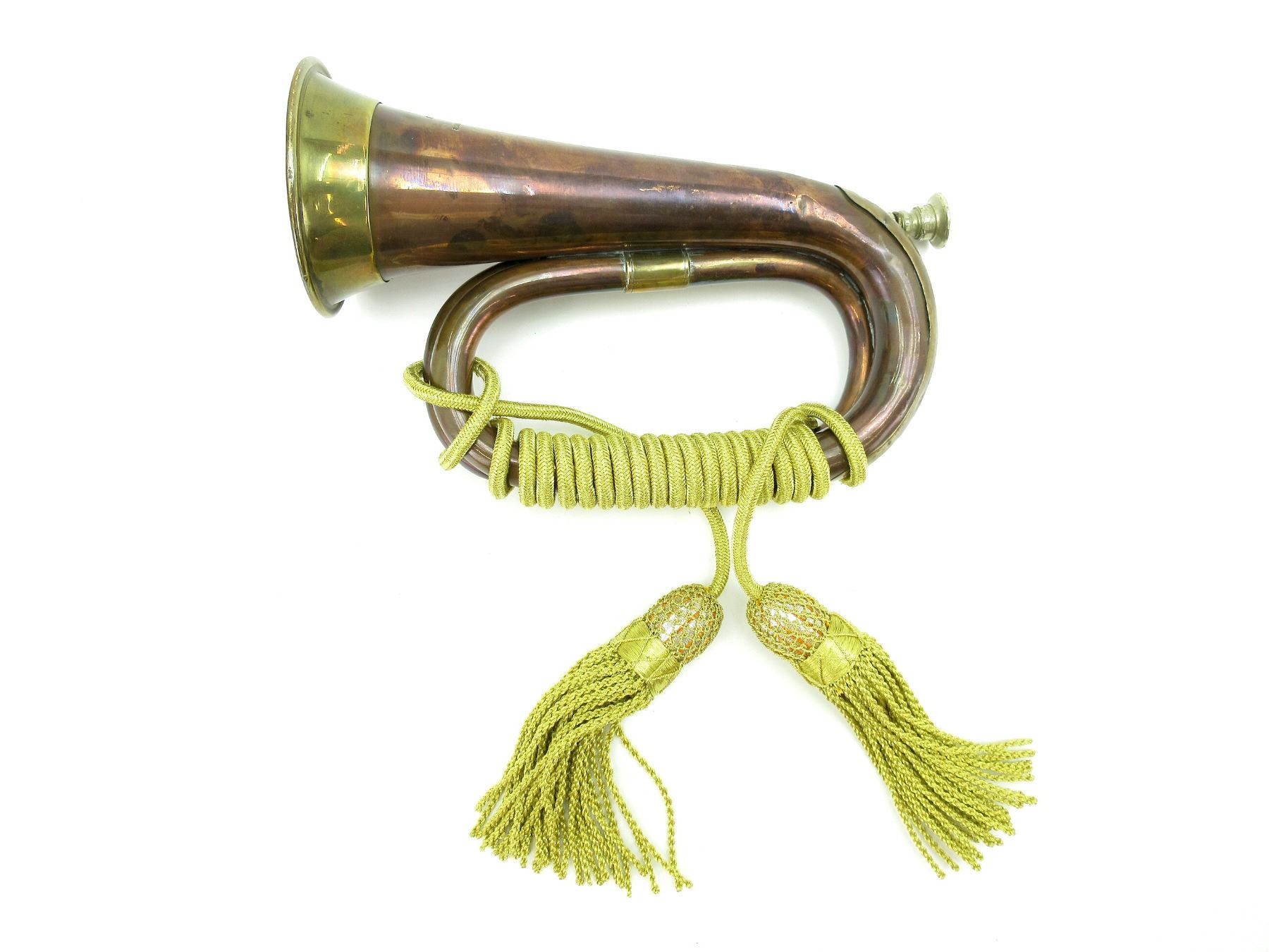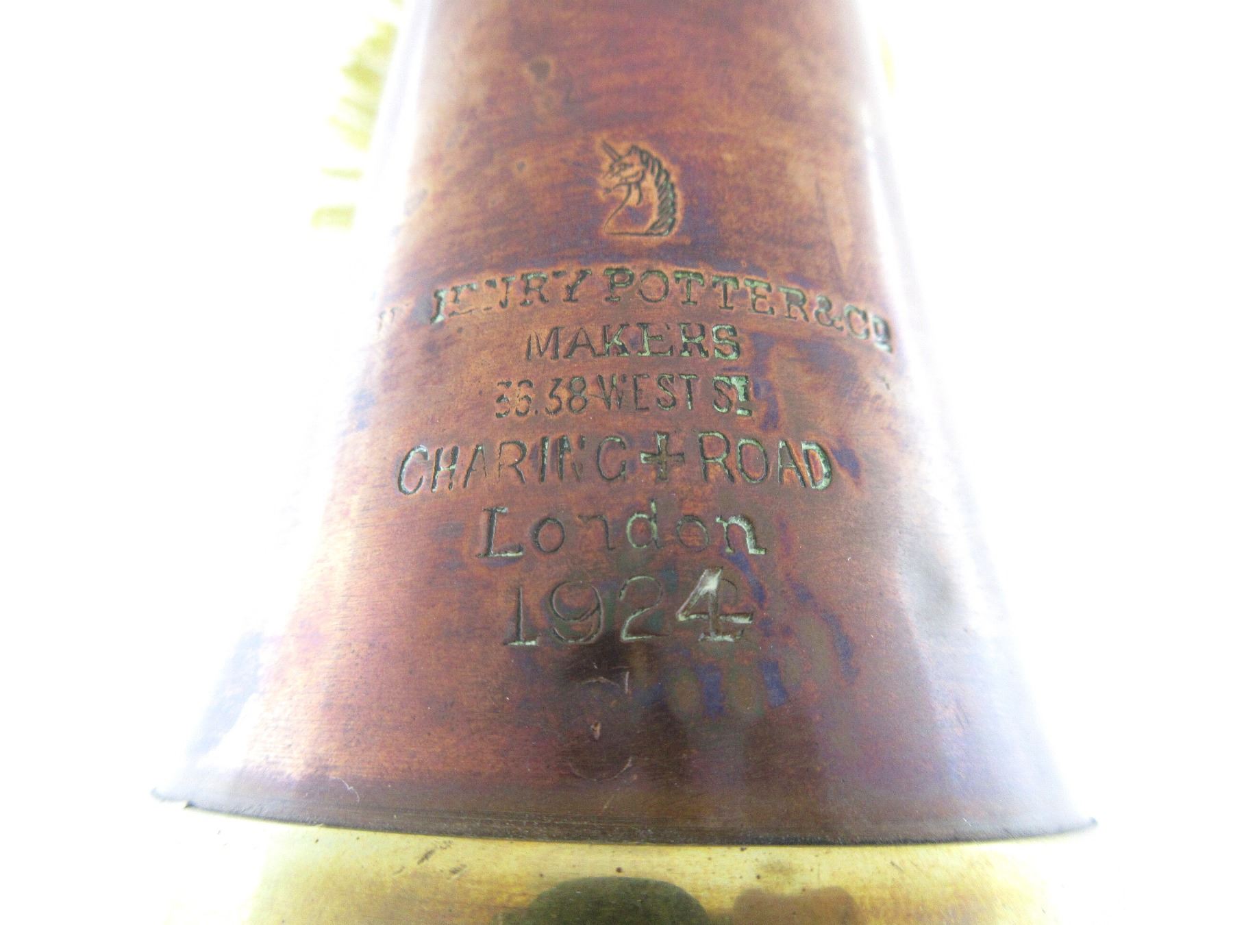 (1) BRASS / COPPER BUGLE WITH GOLD COLOURED WIRE WRAPPED CORD WITH TASSELS, BUGLE MARKED: UNICORN HEAD OVER "? HENRY POTTER & CO., MAKERS, 36.38 WEST ST, CHARING + ROAD, LONDON, 1924" WITH POSSIBLE PARTIAL C-BROAD ARROW, MOUTH PIECE MARKED: "POTTER LONDON" WITH C-BROAD ARROW, OAL APPROX. 11.25". SEE PHOTOS.