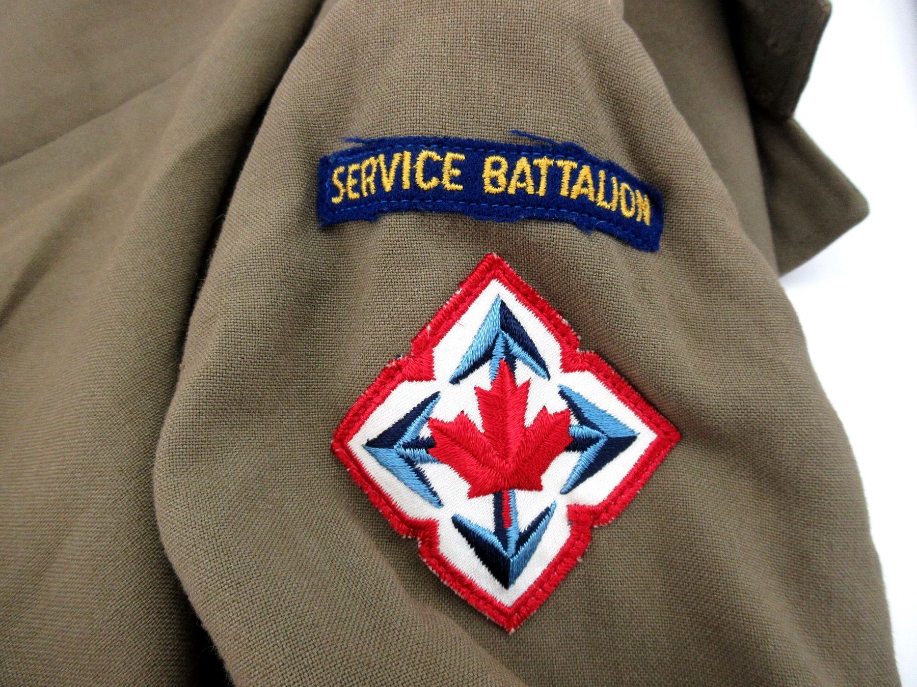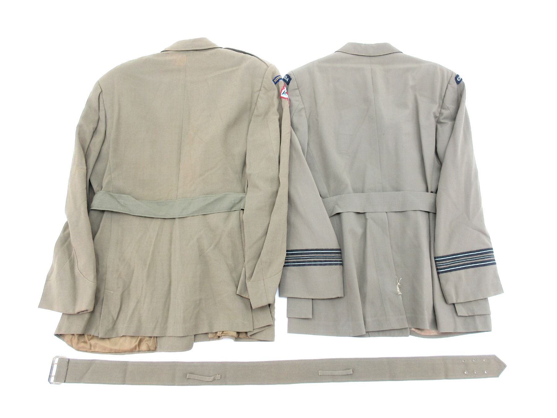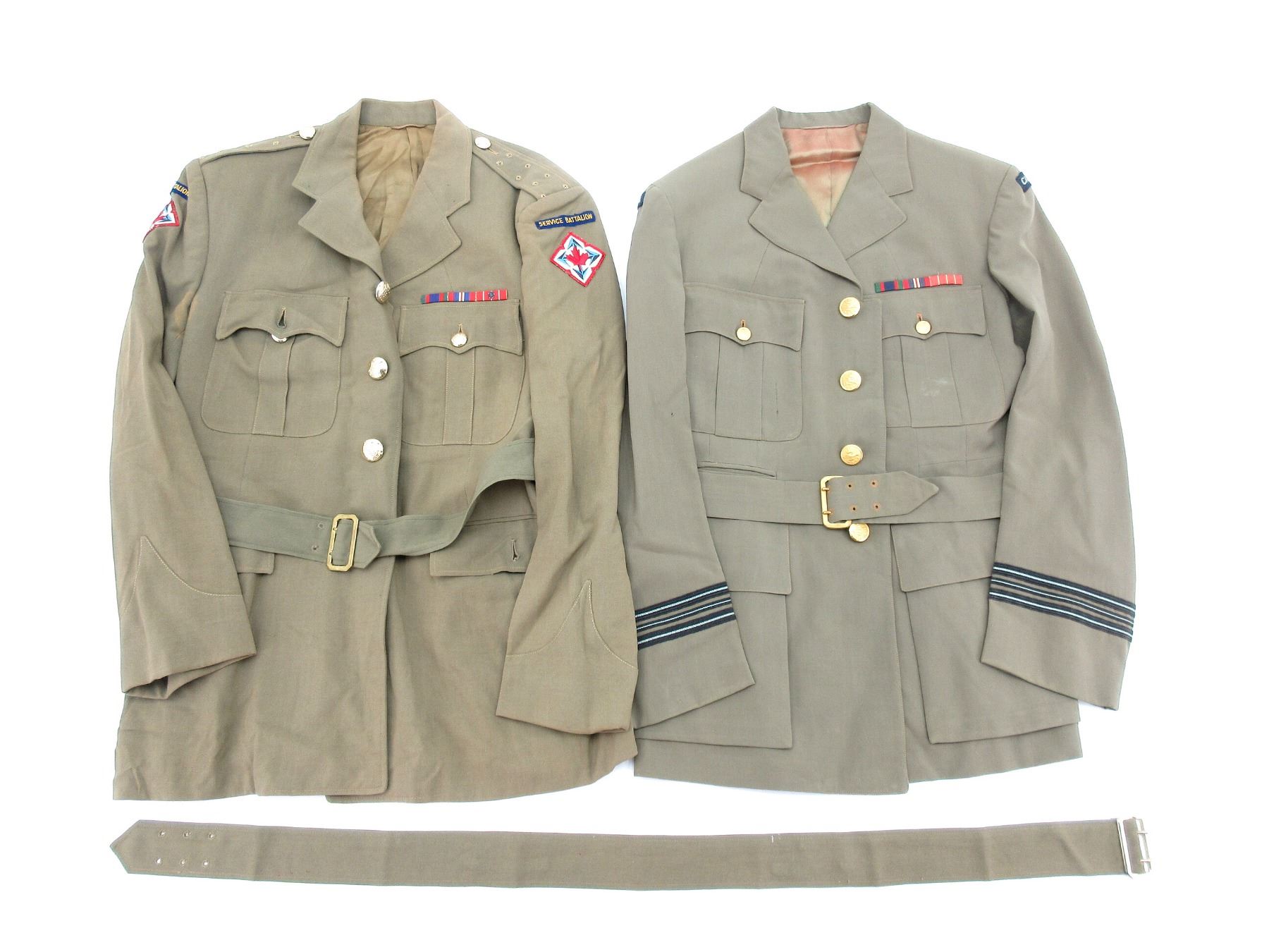 LOT INCLUDES; (1) 1950'S RCAF KHAKI SUMMER TUNIC WITH WAIST BELT, MARKED: "THE HOUSE OF HOBBERLIN HAMILTON" & "MR. S/L J GEARY, DATE 5-25-56" ETC., CANADA SHOULDER BADGES, RIBBON BAR (CANADIAN VOLUNTEER SERVICE MEDAL, 1939-1945 WAR MEDAL, CANADIAN FORCES' DECORATION MEDAL), SQUADRON LEADER RANK, FLY-FRONT, KING'S CROWN BUTTONS, SHOULDER WIDTH APPROX. 17" & (1) 1960'S RCOC KHAKI SUMMER TUNIC WITH WAIST BELT, MARKED: "SCOTT UNIFORM CO., OCTOBER 1964, SIZE N 13, HEIGHT 67.4 TO 69.6, BREAST 41" TO 42" "ETC., SERVICE BATTALION SHOULDER BADGES, MOBILE COMMAND SHOULDER BADGES, RIBBON BAR (CANADIAN VOLUNTEER SERVICE MEDAL, 1939-1945 WAR MEDAL, CANADIAN FORCES' DECORATION MEDAL WITH ROSET), FLY-FRONT, QUEEN'S CROWN RCOC BUTTONS. SEE PHOTOS.