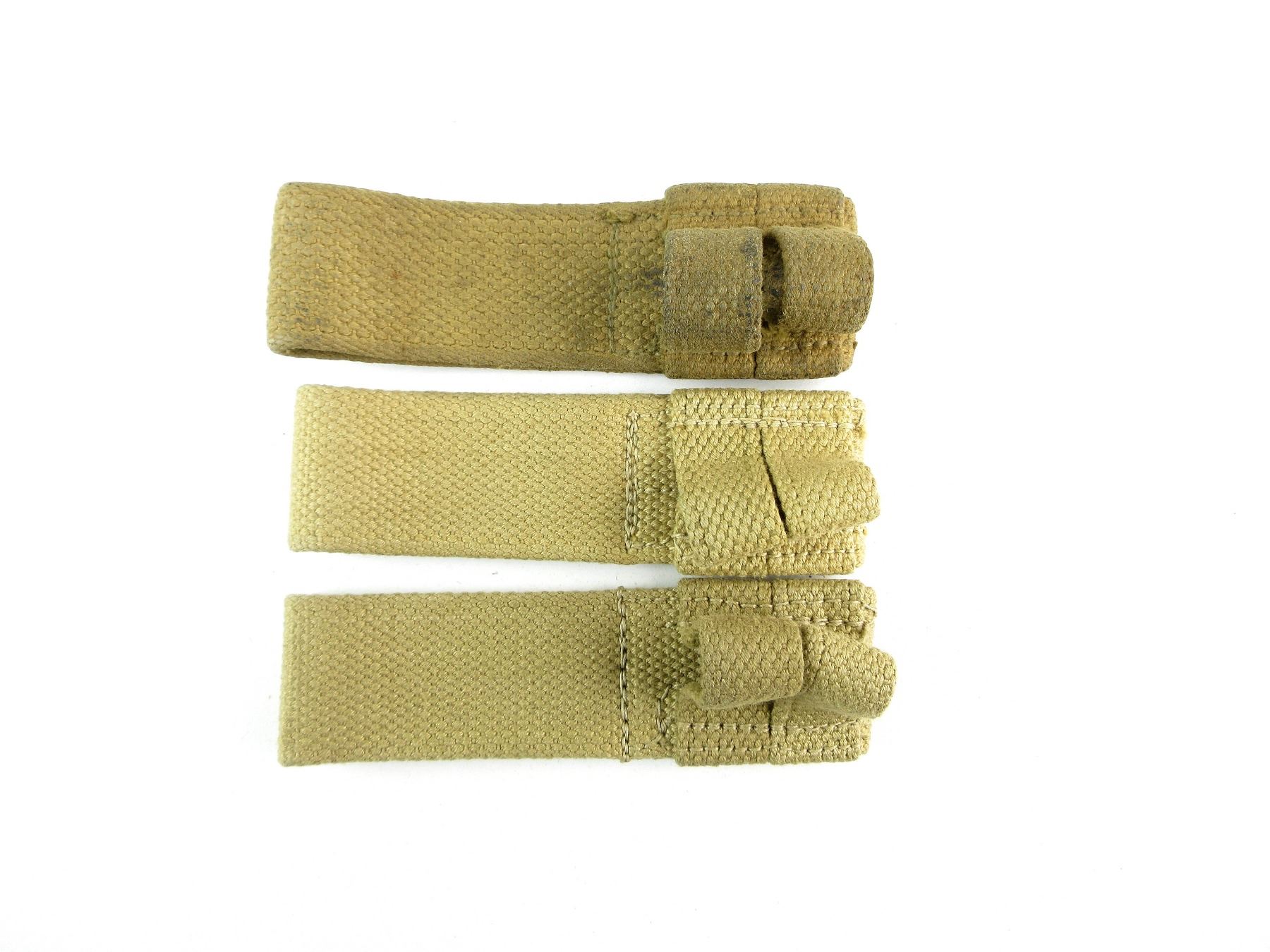 LOT INCLUDES; (3) TAN P37 WEB CANVAS BAYONET FROGS (NO BAYONET), TWO MARKED: "T.I.L. 1955" WITH MAPLE LEAF PROOF MARK, OTHER ONE HAS FAINT / UN-CLEAR MARKINGS, OALS APPROX. 5 1/8" & 5.25". SEE PHOTOS.
