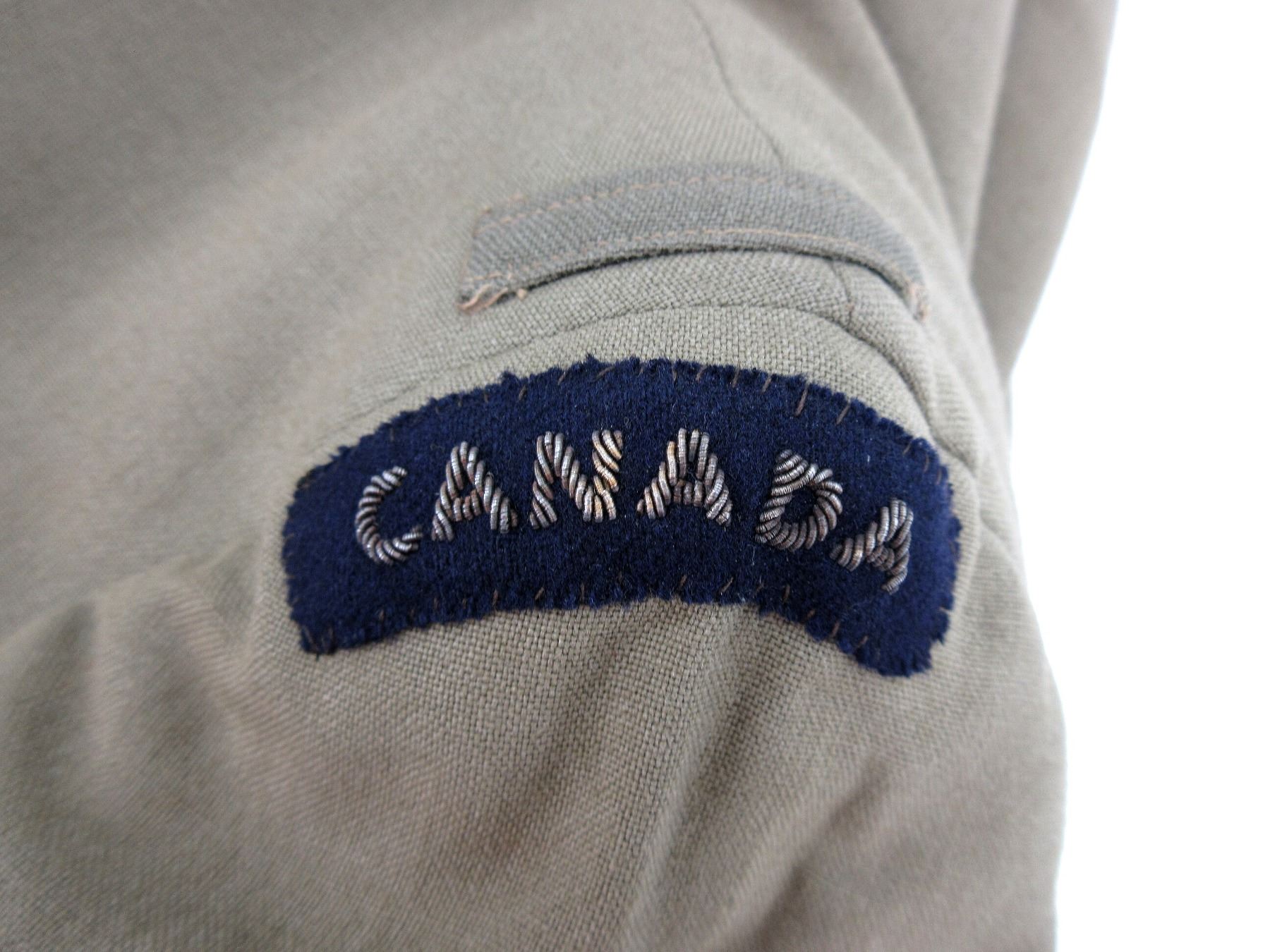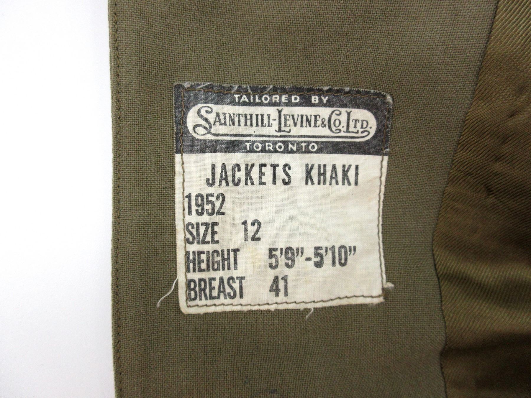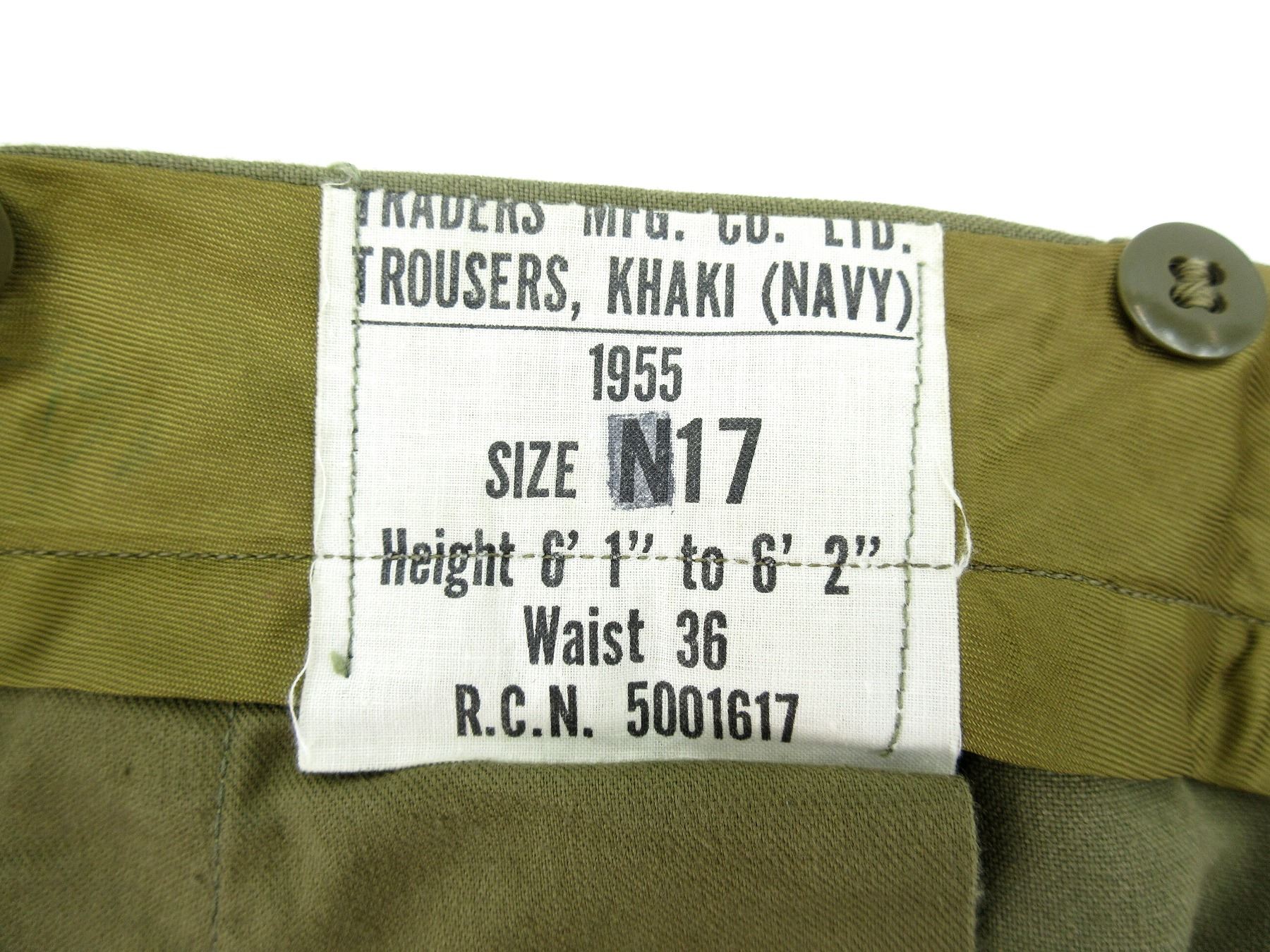 LOT INCLUDES; (1) KHAKI SUMMER TUNIC, MARKED: "SAINTHILL-LEVINE & CO. LTD., TORONTO, JACKETS KHAKI, 1952, SIZE 12, HEIGHT 5'9"-5'10", BREAST 41", WIRE CANADA SHOULDER BADGES, FLY-FRONT, QUEEN'S CROWN BUTTONS, (1) PAIR OF KHAKI SUMMER PANTS, MARKED: "TROUSERS KHAKI (NAVAL), SIZE NO. 14, HEIGHT 5'11" TO 6'0", WAIST 35", MASTER CRAFT UNIFORM CO., ?????, 1952", ZIPPERED-FLY (WORKS) & (1) PAIR OF KHAKI SUMMER PANTS, MARKED: "TRADERS MFG. CO. LTD., TROUSERS, KHAKI (NAVY), 1955, SIZE N17, HEIGHT 6'1" TO 6'2", WAIST 36, R.C.N." ETC., ZIPPERED-FLY (WORKS). SEE PHOTOS.