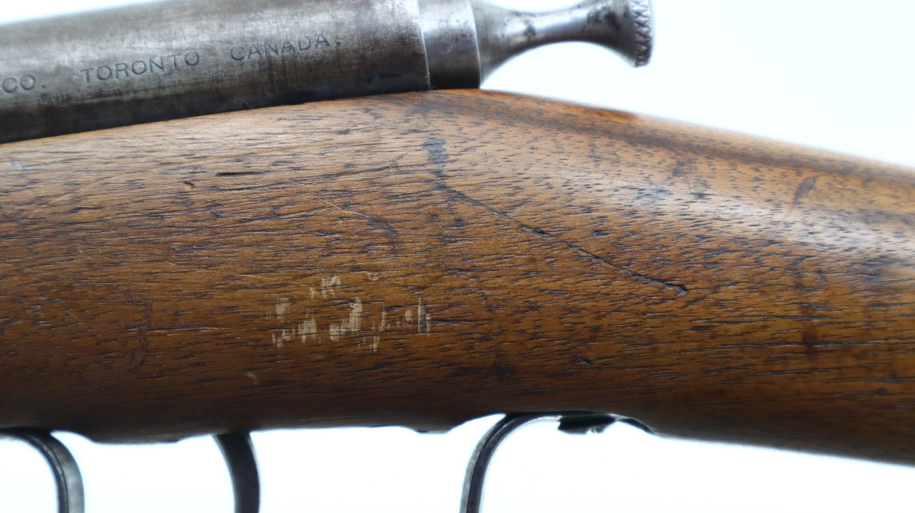 2+/10. COOEY. MODEL: CANUCK JUNIOR. CALIBER: 22 LR. BORE IS GOOD, SLIGHT WEAR. BLADE FRONT SIGHT, U NOTCHED REAR SIGHT, CHECKERED FLAT BOLT HANDLE. ONE PIECE SMOOTH WOOD STOCK, STRAIGHT GRIP, SMOOTH STEEL BUTT PLATE. METAL FINISH TURNING SILVER GREY, WITH PITTING, LIGHT RUST SPOTS, HANDLING MARKS AND WEAR. STOCK SHOWS MARKS, SCRATCHES AND WEAR. ACTION: BOLT ACTION RIFLE. BARREL LENGTH: 18". SERIAL # NA. CLASS: CANADIAN NON RESTRICTED CLASS. CONDITION:2+/10