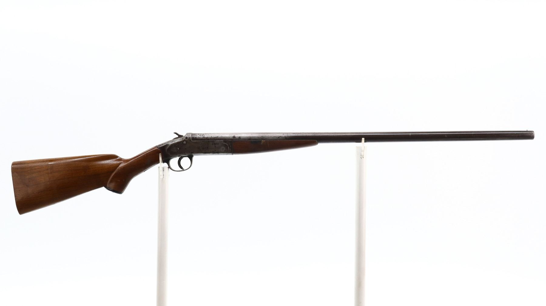 2/10, IVER JOHNSON, MODEL: SINGLE SHOT, CALIBER:12 G X 2 1/2", BORE IS FAIR, PITTED. FIXED IM CHOKE. BRASS BEAD, ROUND BARREL LOOSE ON FACE, CHECKERED SPUR HAMMER, EJECTOR, TRIGGER HAS A BLADE IN THE CENTER IT RELEASES THE HAMMER AND ALSO OPENS THE ACTION WHEN PULLED A SECOND TIME. TWO PIECE SMOOTH WOOD STOCKS, PISTOL GRIP, MISSING BUTT PLATE, STOCK CHIPPED, GRIP CAP. METAL FINISH TURNING BROWN, SILVER GREY WITH PITTING, RUST, HANDLING MARKS AND WEAR. STOCKS SHOW SMALL CRACKS, HANDLING MARKS AND WEAR. , ACTION: HINGED SINGLE SHOT SHOTGUN, BARREL LENGTH: 30", SERIAL # 1266, CONDITION: 2/10, CLASS: CANADIAN NON RESTRICTED