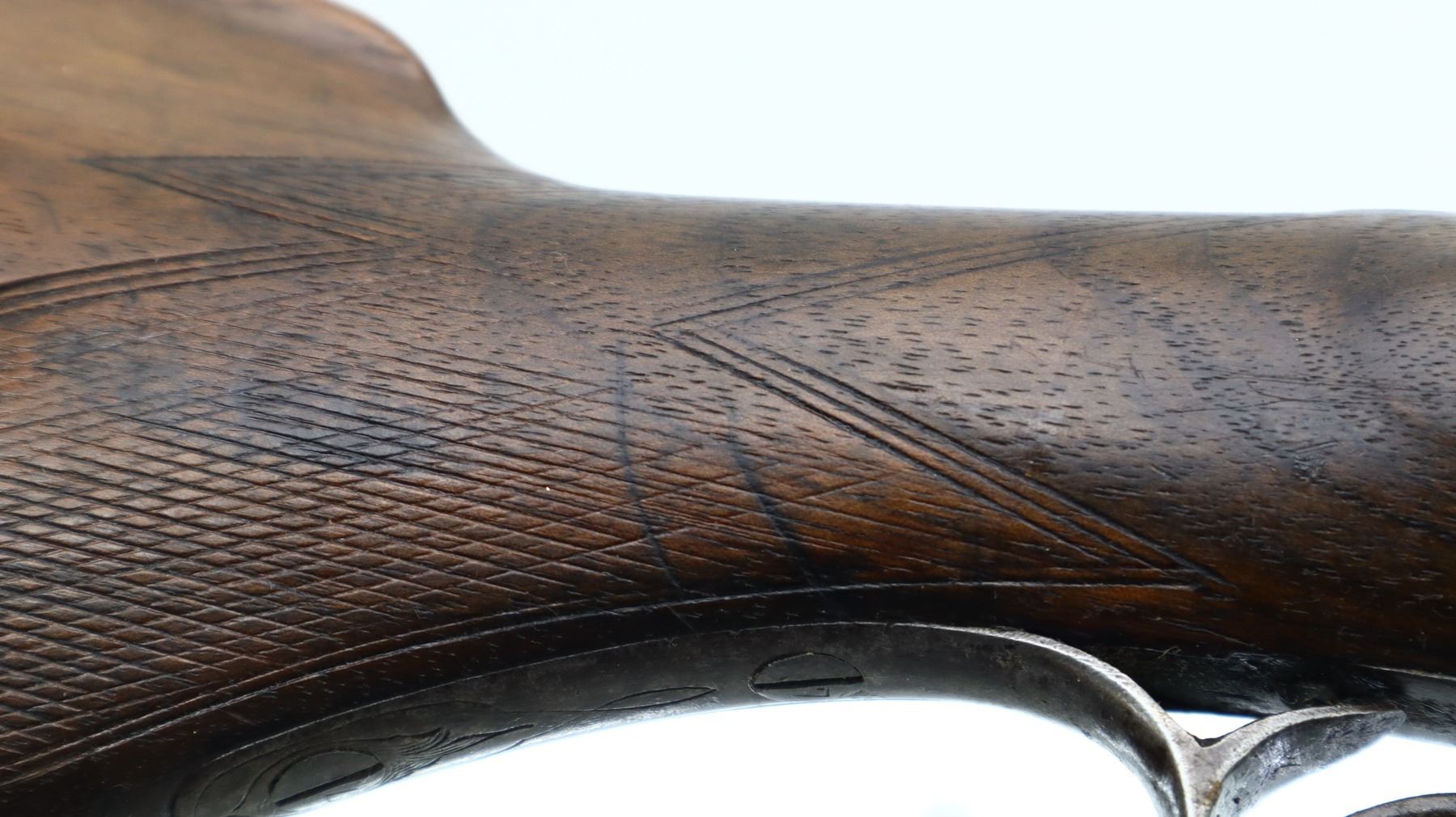 2+/10. WM PARKHURST. MODEL: SIDE BY SIDE HAMMERGUN. CALIBER: 16 G X 2 5/8". COMES WITH CUSTOM GUN REST. BORES ARE FAIR, PITTED. FIXED CYLINDER CHOKES. MISSING FIRING PINS. CUSTOM SILVER BEAD. DAMASCUS BARRELS, LOOSE ON FACE. ENGRAVED RECEIVER, AND SIDE LOCKS WITH CHECKERED SPUR HAMMERS THAT FUNCTION, DOUBLE TRIGGERS. TWO PIECE WOOD STOCKS, CHECKERED FOREARM THAT IS LOOSE, CHECKERED PISTOL GRIP, THAT IS CHIPPED BEHIND THE RECEIVER, CHECKERED BLACK POLYMER BUTT PLATE, CHIPPED AT TOE, VANITY PLATE. METAL FINISH TURNING BROWN, WITH PITTING, LIGHT RUST SPECKLES, HANDLING MARKS AND WEAR, STOCK SHOWS MARKS, SCRATCHES AND WEAR. ACTION: HINGED SIDE BY SIDE SHOTGUN. BARREL LENGTH: 29.75". SERIAL: 7086. CONDITION:2+/10. CLASS: CANADIAN NON RESTRICTED