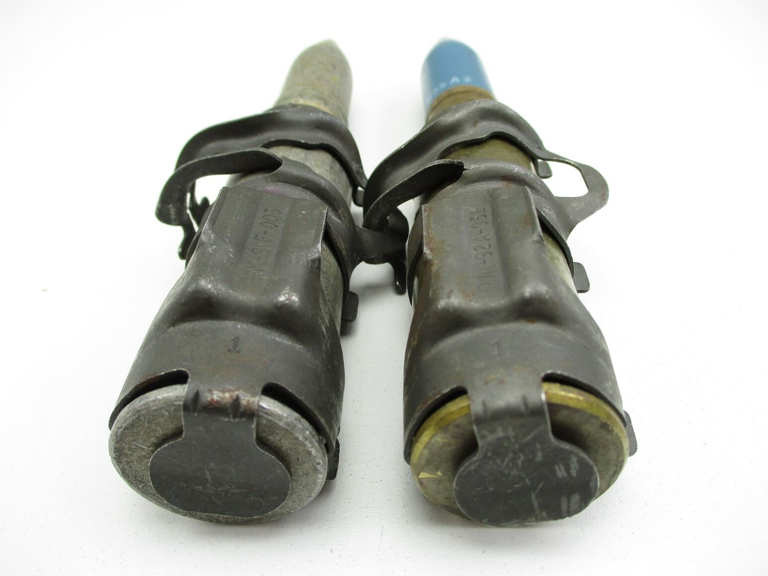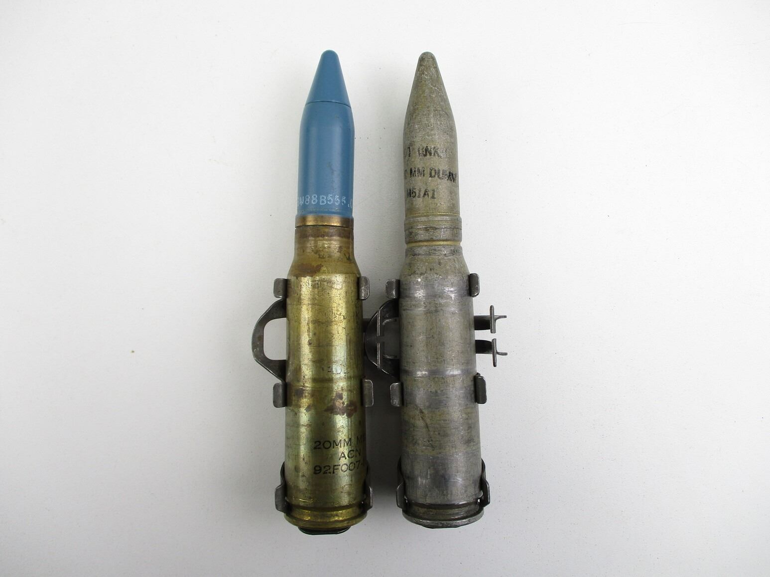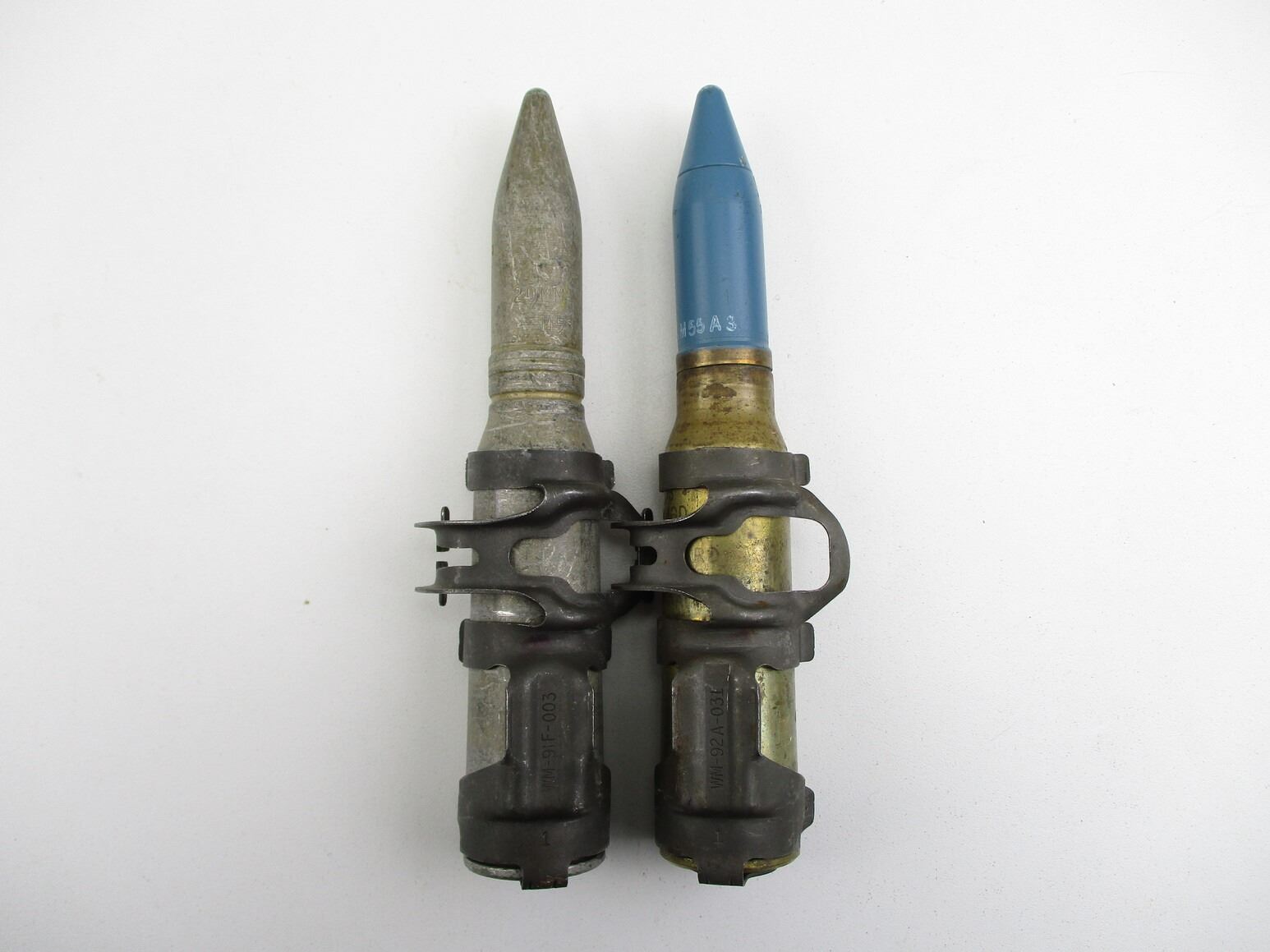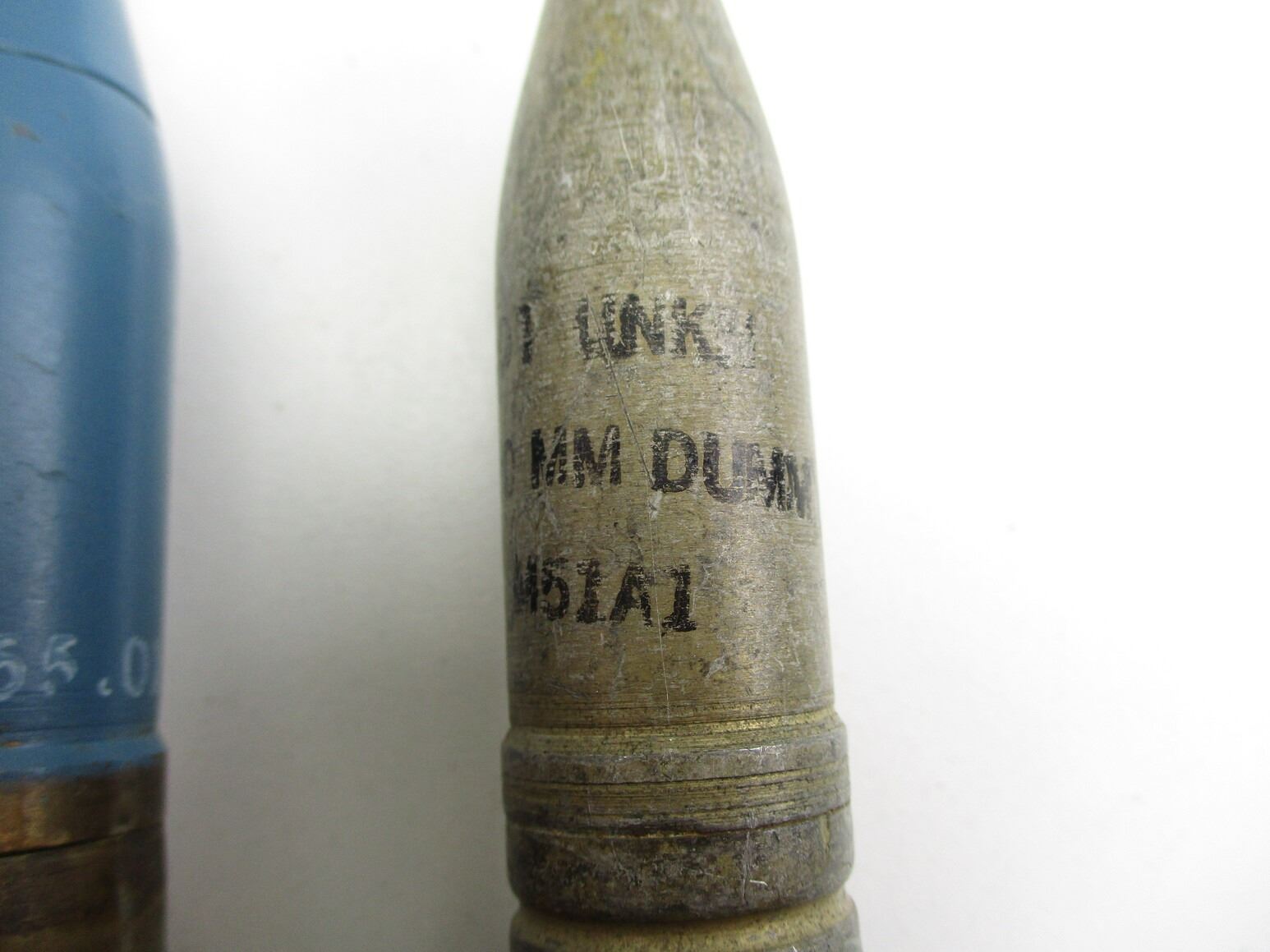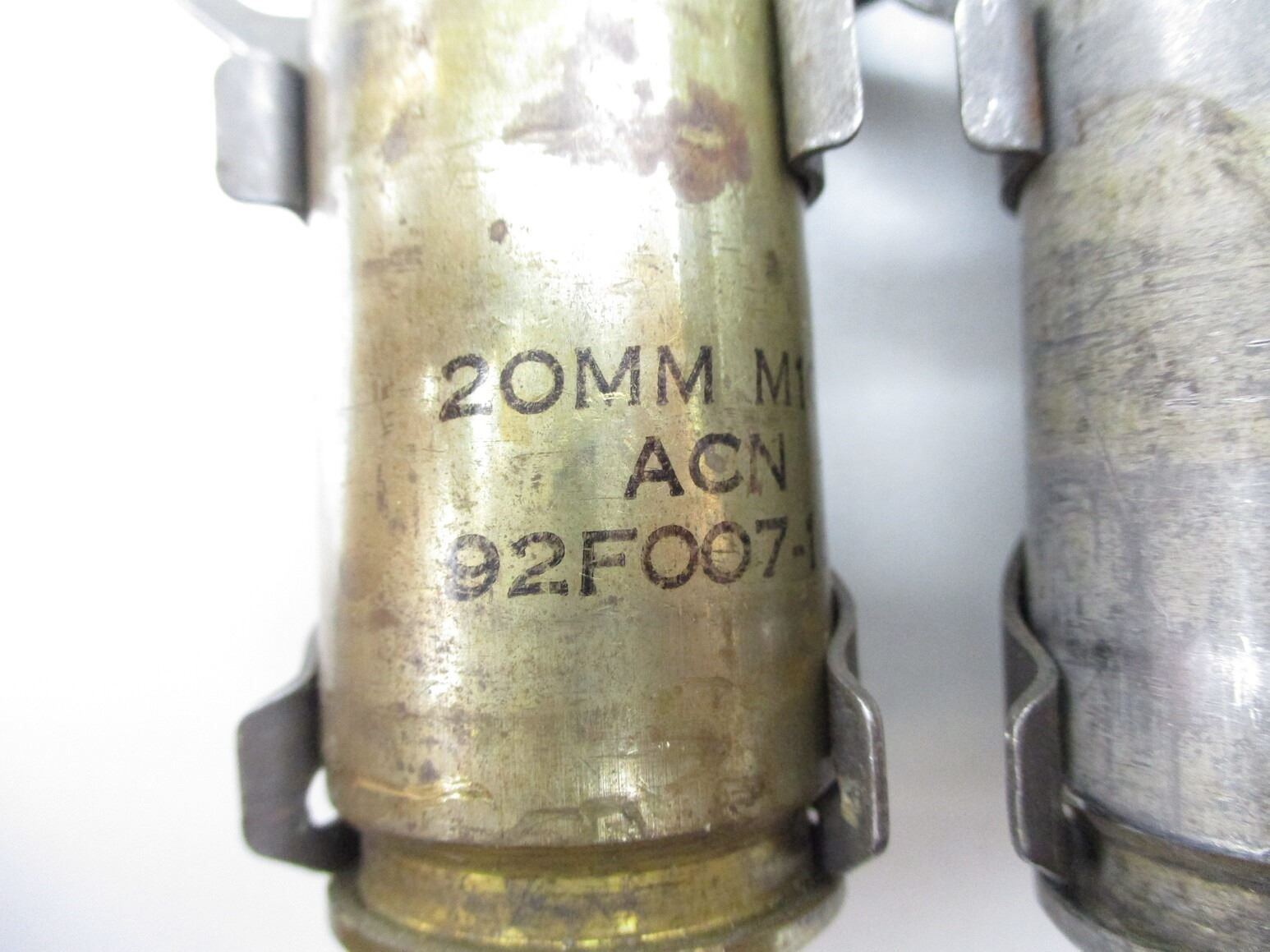 20MM X 102MM CANNON ROUND INERT LOT, LOT INCLUDES; (1) STEEL DUMMY ROUND & (1) BRASS CASE WITH BLUE PRACTICE PROJECTILE & COPPER DRIVING BAND, WITH TWO LINKS, 1 1/8" DIA. & OAL APPROX. 6 5/8". SEE PHOTOS., THESE CAN ONLY BE SHIPPED BY CORPORATE UPS COVERED AREAS. PLEASE GO TO LOT 0 IN THE AMMUNITION SESSION, TO SEE IF YOUR POSTAL CODE IS A VALID AREA. THESE CAN NOT BE SHIPPED TO THE USA, OR INTERNATIONALLY. NO REFUNDS WILL BE ISSUED, OR BIDS RETRACTED.
