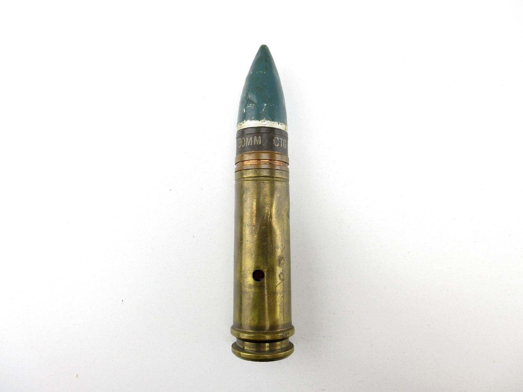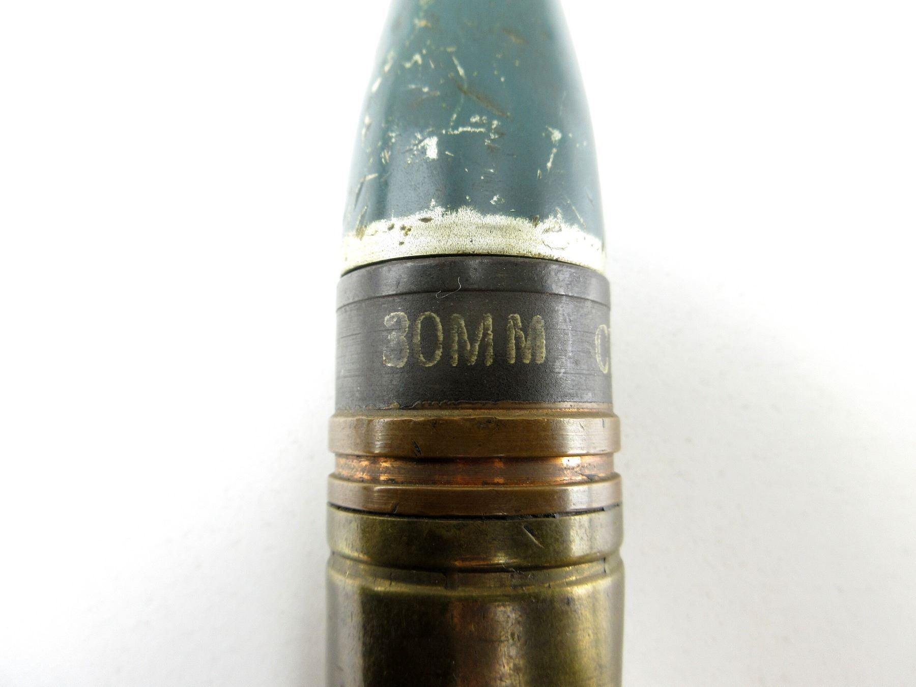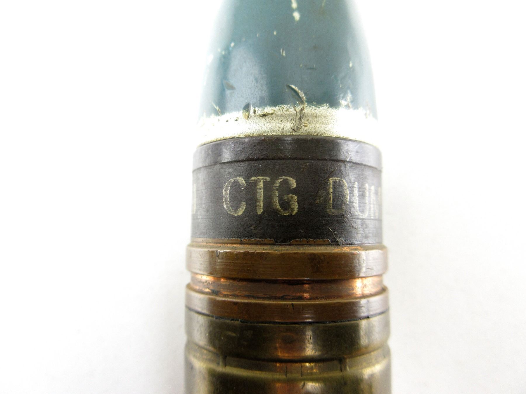 (1) BRASS CASE WITH GREEN PAINTED STEEL PROJECTILE, COPPER BAND, BAND MARKED: "30MM CTG DUMMY", APPROX. 1.5" DIA. & OAL APPROX. 7". SEE PHOTOS.