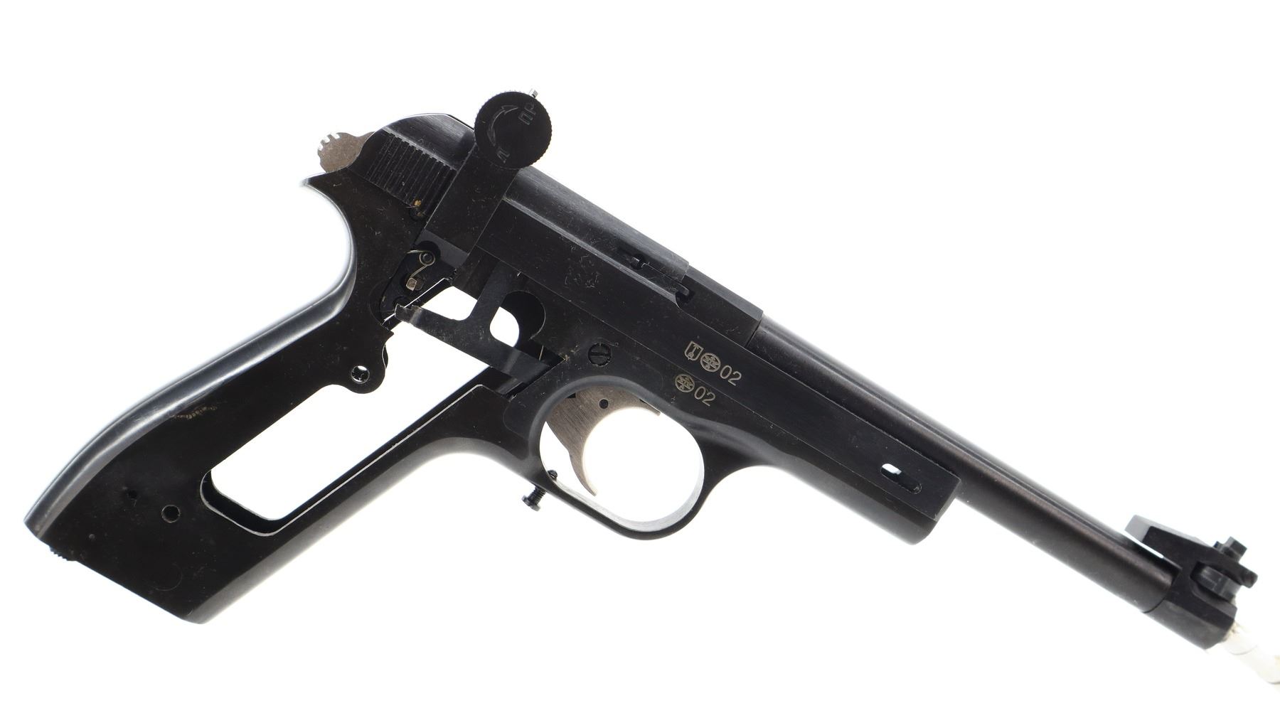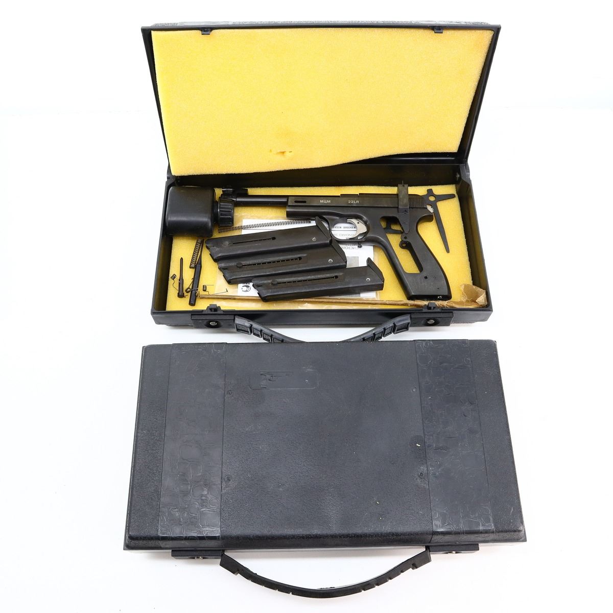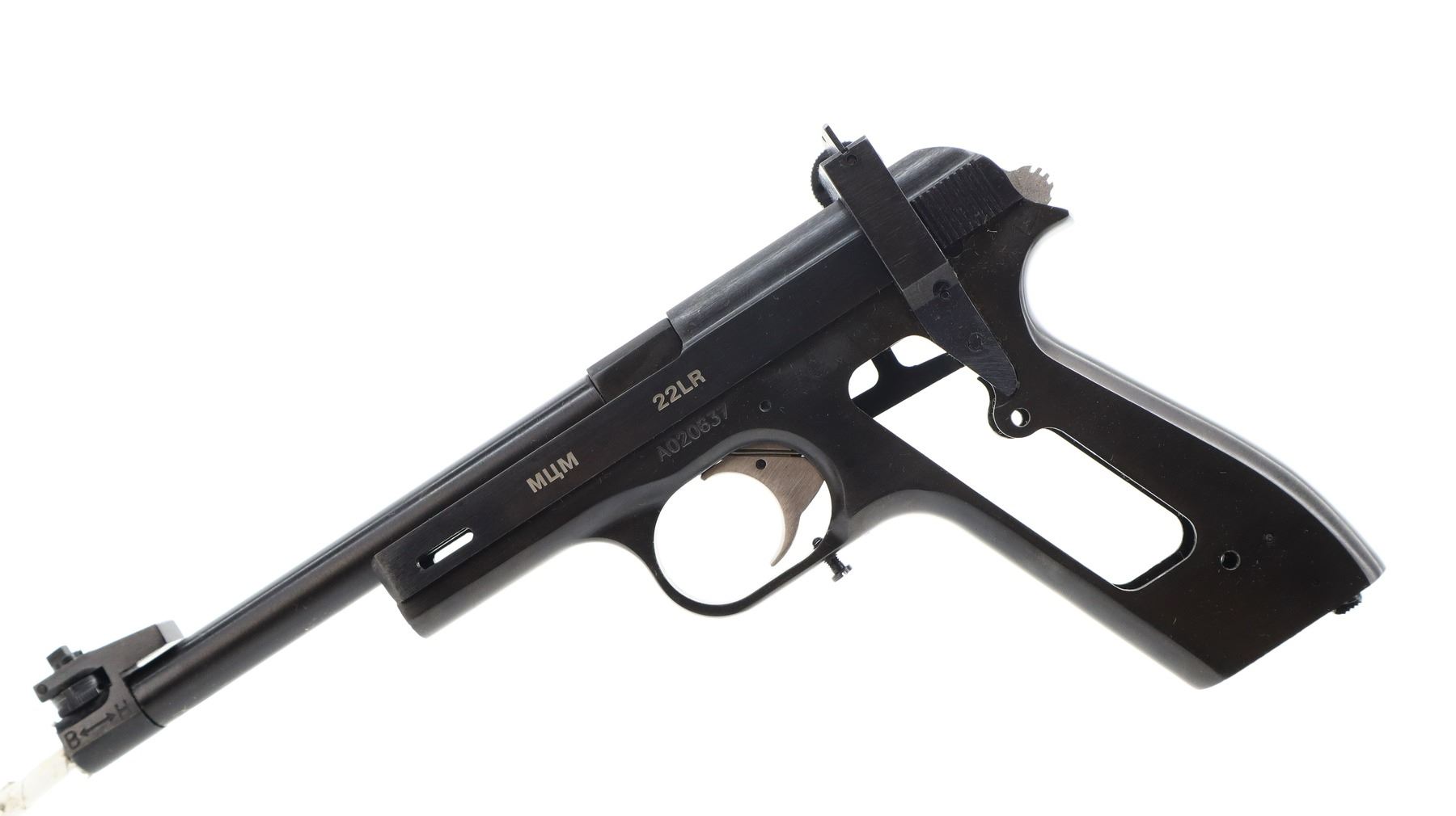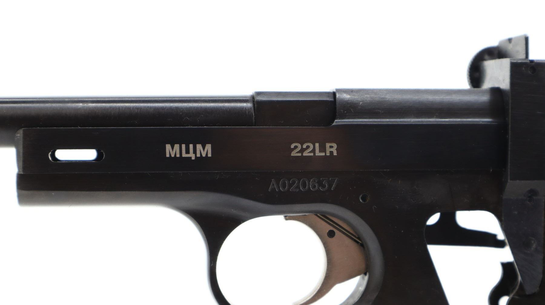 5/10, IZHMECH, MODEL: MCM, CALIBER: 22 LR, COMES WITH 2 CASES, 2 MAGAZINES, MANUAL, BORE IS EXCELLENT. THIS PISTOL IS NOT COMPLETE, MISSING SOME SLIDE PARTS, GRIPS AND SCREWS, POSSIBLY OTHER INTERNAL COMPONENTS. ADJUSTABLE POST FRONT SIGHT WITH RAMP, ADJUSTABLE U NOTCHED REAR SIGHT, BLUED FINISH, GROOVED ROUND HAMMER AND SMOOTH TRIGGER, HEEL MAG RELEASE. METAL FINISH SHOWS SOME SCRATCHES, HANDLING MARKS AND WEAR. BARREL LENGTH: 150MM, SERIAL # A020637, CONDITION: 5/10, ACTION: SEMI AUTOMATIC PISTOL, CLASS: CANADIAN RESTRICTED