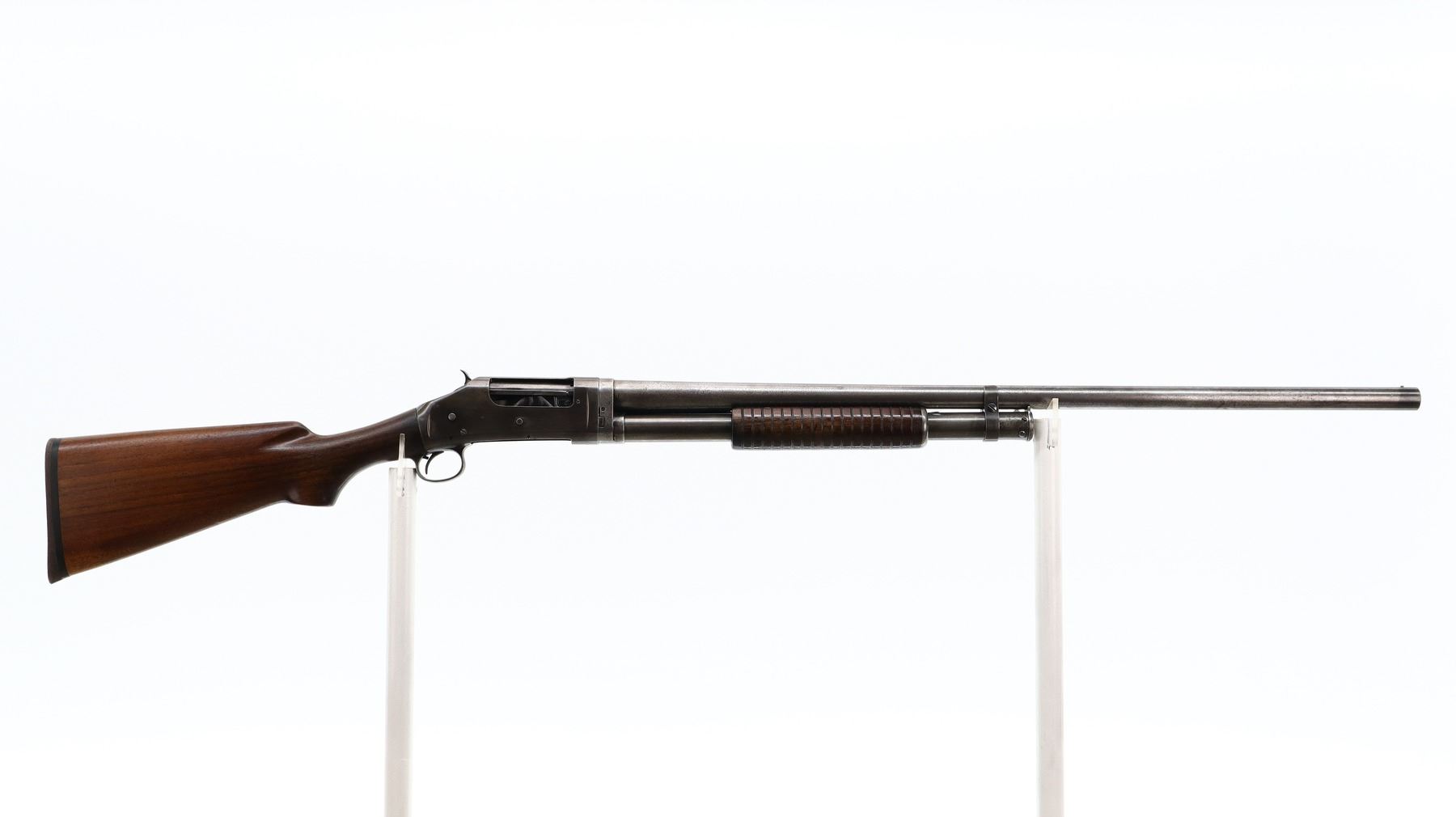 5/10, WINCHESTER, MODEL: 97, CALIBER: 12 G X 2 3/4", BORE IS VERY GOOD, SHINY. FIXED FULL CHOKE. MANUFACTURED 1942. SILVER BEAD, ROUND BARREL, CHECKERED SPUR HAMMER. TWO PIECE WOOD STOCKS, GROOVED FOREND, PISTOL GRIP, BROWN RUBBER RECOIL PAD. METAL FINISH TURNING SILVER GREY WITH PITTING, HANDLING MARKS AND WEAR. STOCKS SHOW DINGS, SCRATCHES AND WEAR. ACTION: PUMP ACTION SHOTGUN, BARREL LENGTH: 30", SERIAL # 897387, CONDITION: 5/10, CLASS: CANADIAN NON RESTRICTED CLASS, PAL REQUIRED