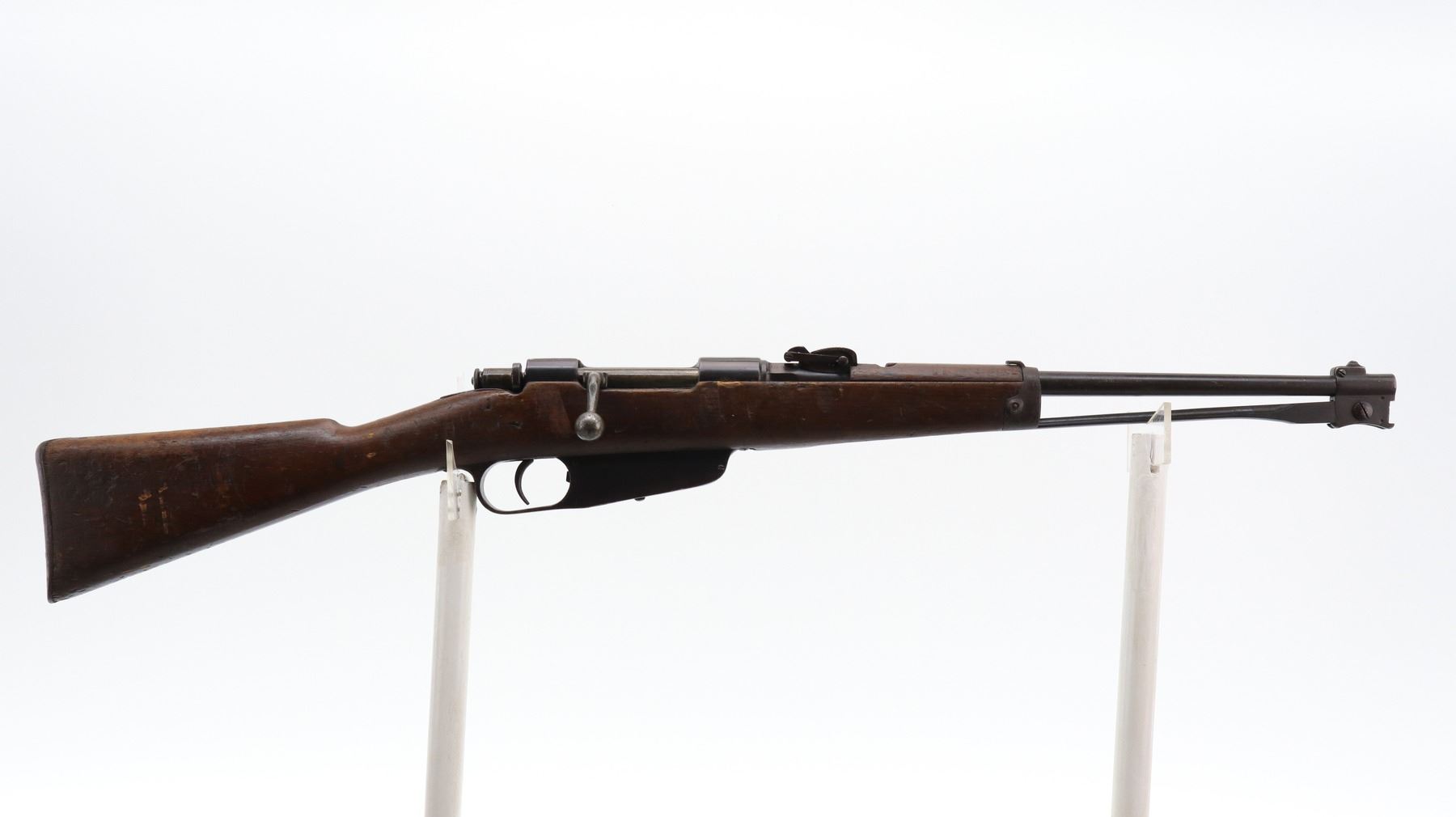 6/10. ITALIAN CARCANO. MODEL: M91/38 CAVALRY CARBINE. CALIBER: 6.5 X 52 CARCANO. BORE IS GOOD, SLIGHT PITTING. MANUFACTURED BY GARDONE VALTROMP 1936. BLADE FRONT SIGHT WITH RAMP, ADJUSTABLE U NOTCHED REAR SIGHT WHICH IS LOOSE, SILVER BOLT WITH TURNED DOWN HANDLE. TWO PIECE SMOOTH FULL MILITARY WOOD STOCKS, STRAIGHT GRIP, SMOOTH STEEL BUTT PLATE WITH TRAP, SLING SWIVELS, ATTACHED FOLDING TRIANGULAR BAYONET. METAL FINISH TURNING BROWN WITH LIGHT RUST SPECKLES, SCRATCHES, HANDLING MARKS AND WEAR. STOCKS SHOW SOME MARKS, SCRATCHES AND WEAR. ACTION: BOLT ACTION RIFLE. BARREL LENGTH: 17.5". SERIAL: F6392. CONDITION:6/10. CLASS: CANADIAN NON RESTRICTED