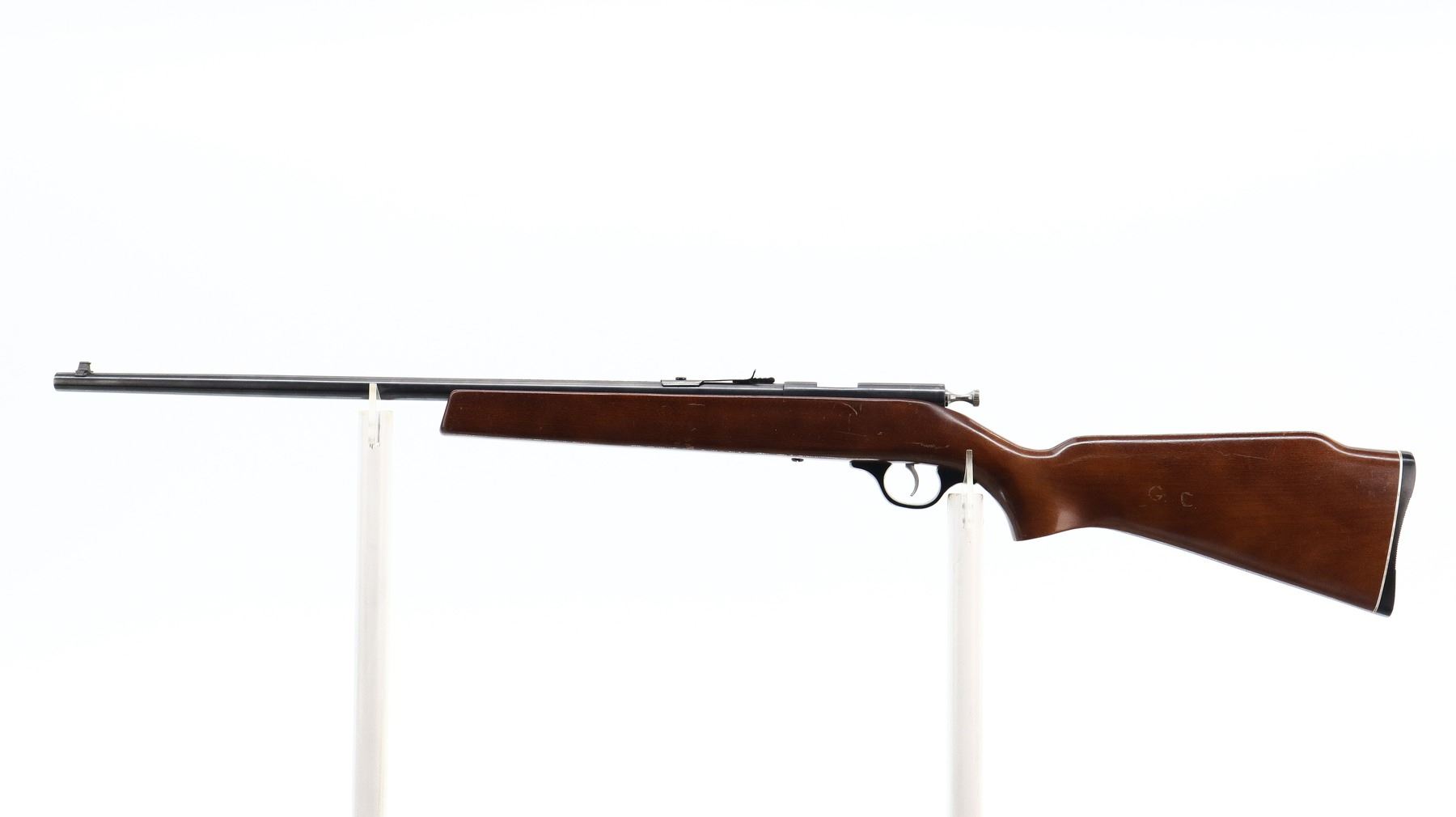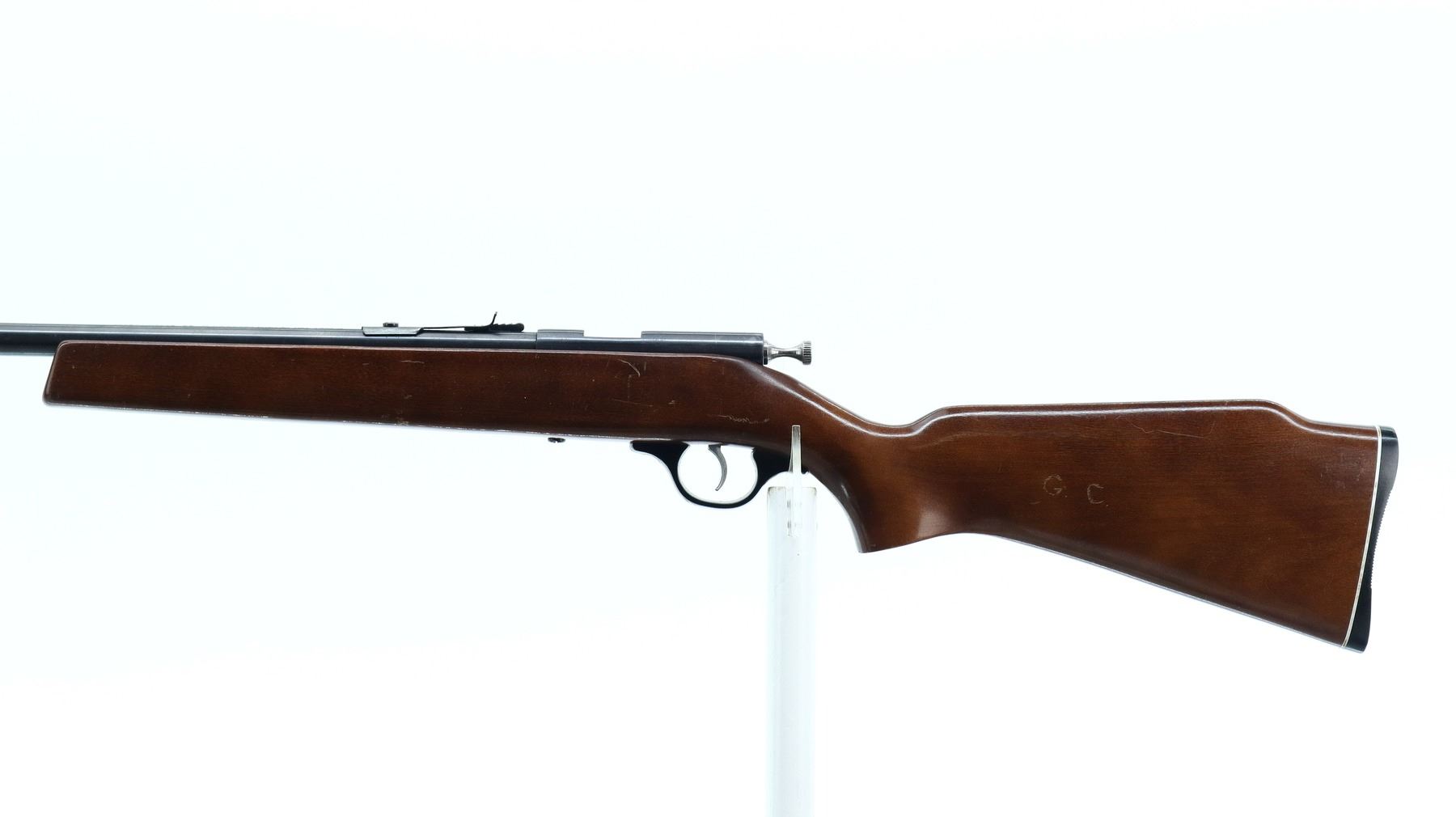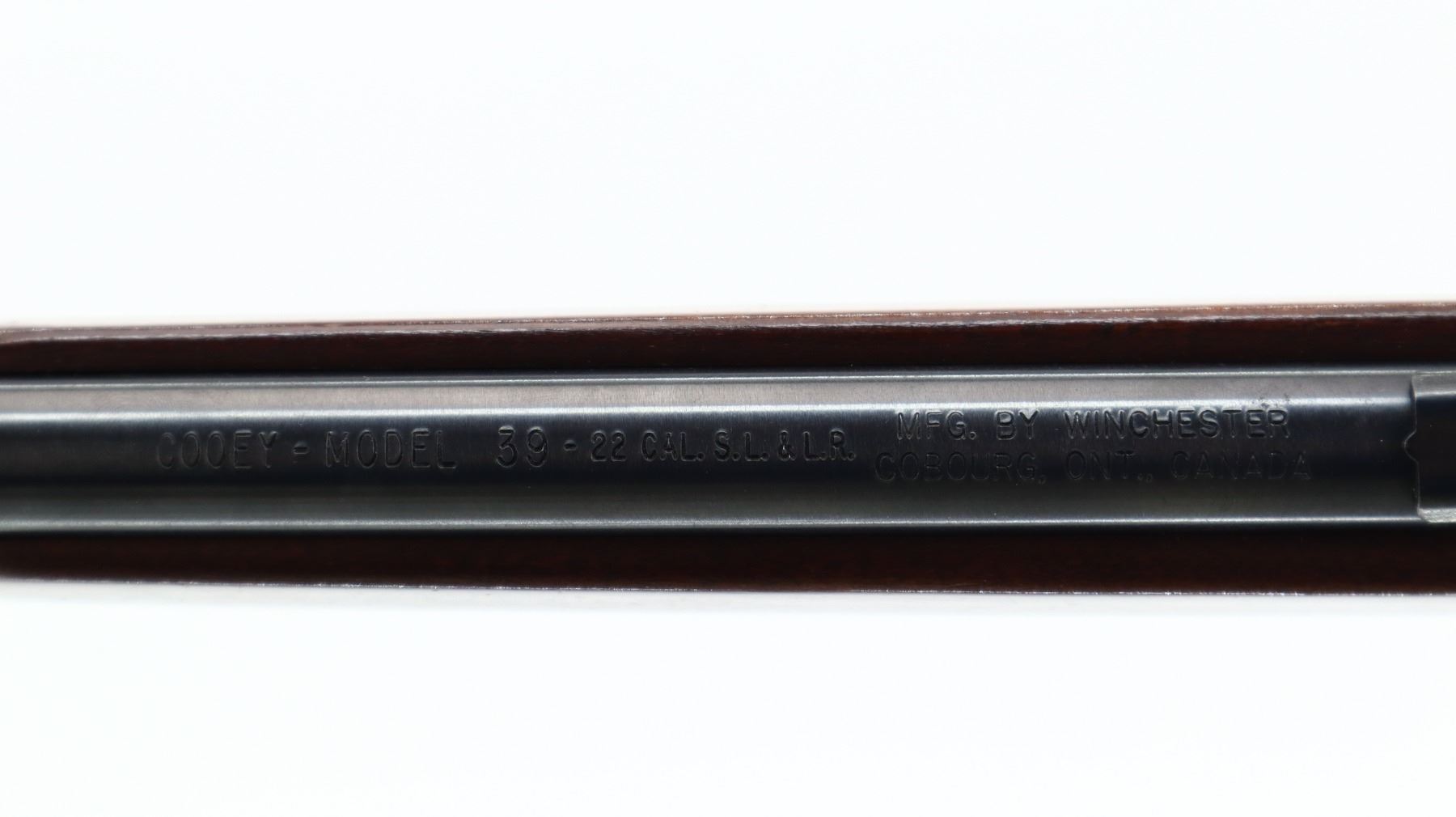 7/10, COOEY, MODEL: 39, CALIBER: 22 LR, BORE IS VERY GOOD. BLADE FRONT SIGHT, ADJUSTABLE U NOTCHED REAR SIGHT, BLUED FINISH, SILVER BOLT. ONE PIECE SMOOTH WOOD STOCK, PISTOL GRIP, GROOVED BLACK POLYMER BUTT PLATE. METAL FINISH SHOWS SCRATCHES, HANDLING MARKS AND WEAR. STOCK SHOWS DINGS, SCRATCHES AND WEAR., ACTION: BOLT ACTION RIFLE, BARREL LENGTH: 22", SERIAL # NA, CONDITION: 7/10, CLASS: CANADIAN NON RESTRICTED CLASS, PAL REQUIRED