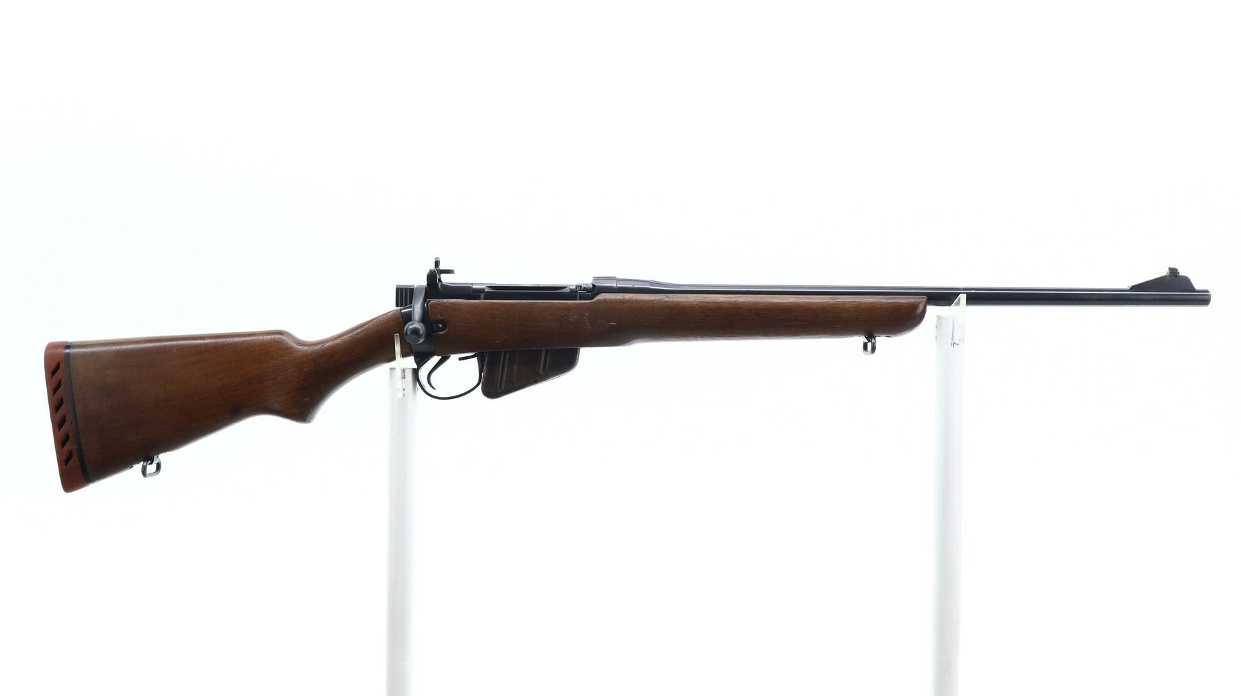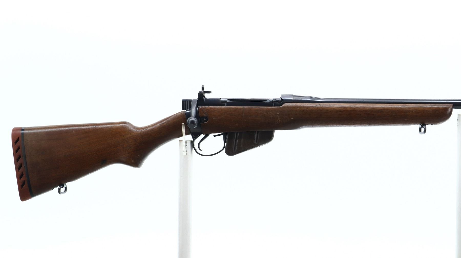 7/10, LEE ENFIELD, MODEL: EAL B MODEL 2ND PRODUCTION CIVILIAN, CALIBER:303 BR, COMES WITH MAGAZINE, BORE IS VERY GOOD. BLADE FRONT SIGHT WITH RAMP, RECEIVER BRIDGE REMOVED, TWO POSITION L FLIP REAR PEEP SIGHT, BLUED FINISH. TWO PIECE SMOOTH WOOD STOCKS, PISTOL GRIP, JOSTOM RED VENTED RUBBER RECOIL PAD, SLING SWIVELS. METAL FINISH SHOWS SOME SCRATCHES, HANDLING MARKS AND WEAR. STOCKS SHOW SOME MARKS, SCRATCHES AND WEAR. , ACTION: BOLT ACTION RIFLE, BARREL LENGTH: 21.25", SERIAL # 3444, CONDITION: 7/10, CLASS: CANADIAN NON RESTRICTED