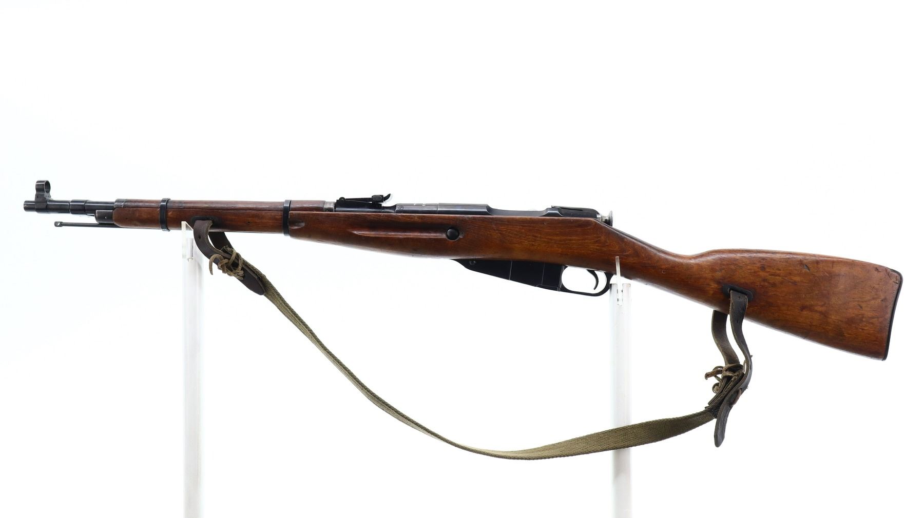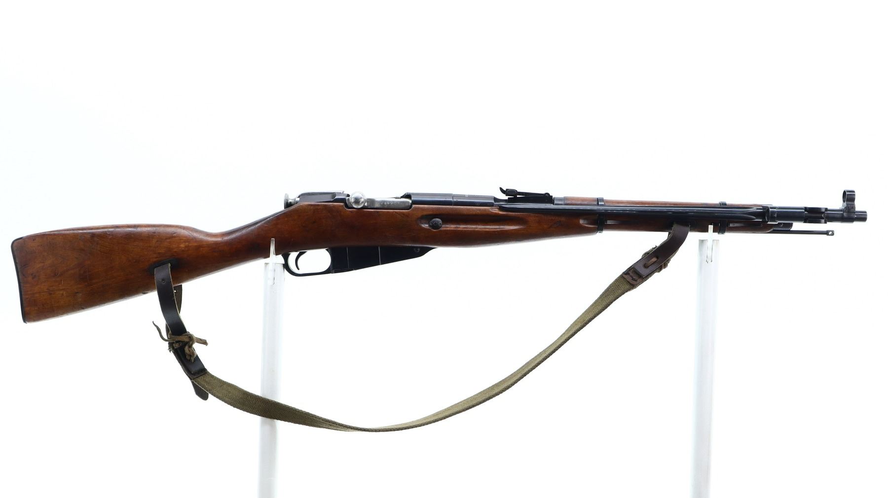 7+/10, RUSSIAN MOSIN NAGANT, MODEL: M44 CARBINE, CALIBER: 7.62 X 54R, BORE IS EXCELLENT. MANUFACTURED BY IZHEVSK 1947, VISIBLE SERIAL NUMBERS MATCH, THEY CYRILLIC PREFIXES. POST FRONT SIGHT WITH HOOD AND RAMP, ADJUSTABLE U NOTCHED REAR SIGHT, ROUND RECEIVER, SILVER BOLT WITH STRAIGHT HANDLE. TWO PIECE FULL MILITARY STOCKS, FINGER GROOVED FOREND, STRAIGHT GRIP, SMOOTH STEEL BUTT PLATE, PARTIAL MARKINGS ON RIGHT SIDE OF STOCK, SLING SLOTS WITH CANVAS AND LEATHER MILITARY SLING, CLEANING ROD, ATTACHED FOLDING CRUCIFORM BAYONET. METAL FINISH SHOWS SCRATCHES, HANDLING MARKS AND WEAR. STOCKS SHOW SOME DINGS, SCRATCHES AND WEAR. ACTION: BOLT ACTION RIFLE, BARREL LENGTH: 20", SERIAL # C4892, CONDITION: 7+/10, CLASS: CANADIAN NON RESTRICTED CLASS, PAL REQUIRED