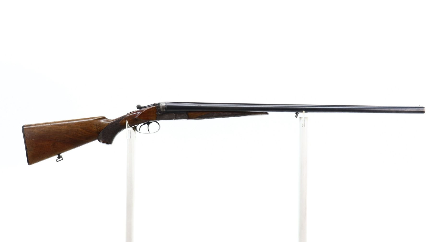 7/10, SIMSON SUHL, MODEL: SIDE BY SIDE, CALIBER: 12 G X 2 3/4", BORES ARE GOOD. FIXED FULL CHOKES. BRASS BEAD, BLUED BARRELS WITH RAISED RIB, COLOUR CASE HARDENED RECEIVER WITH SCROLL ENGRAVING, AUTOMATIC SAFETY, EXTRACTOR, COCKING INDICATORS, DOUBLE TRIGGERS. TWO PIECE WOOD STOCKS, CHECKERED FOREARM AND PISTOL GRIP, CHEEK REST, CHECKERED BLACK POLYMER BUTT PLATE, GRIP CAP, SLING SWIVELS. METAL FINISH SHOWS SOME SCRATCHES, HANDLING MARKS AND WEAR. STOCKS SHOW SOME DINGS, SCRATCHES AND WEAR. ACTION: HINGED SIDE BY SIDE SHOTGUN, BARREL LENGTH: 28.25", SERIAL # 212012, CONDITION: 7/10, CLASS: CANADIAN NON RESTRICTED CLASS, PAL REQUIRED