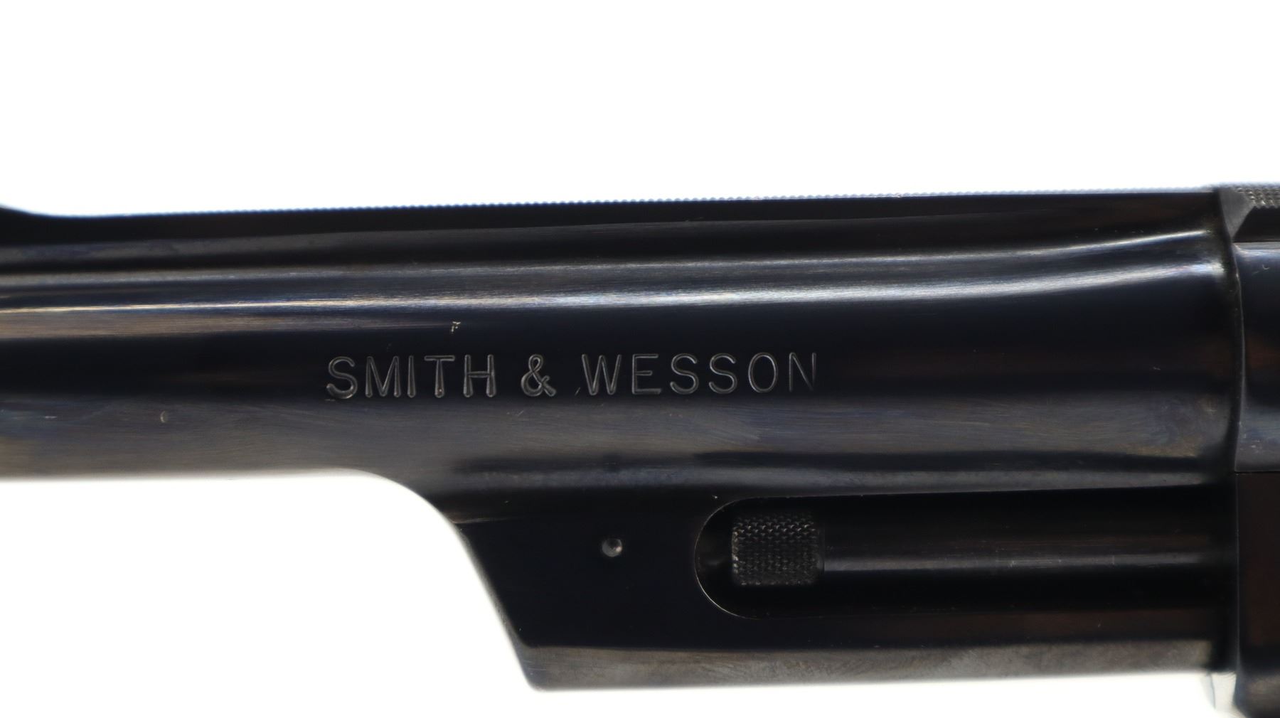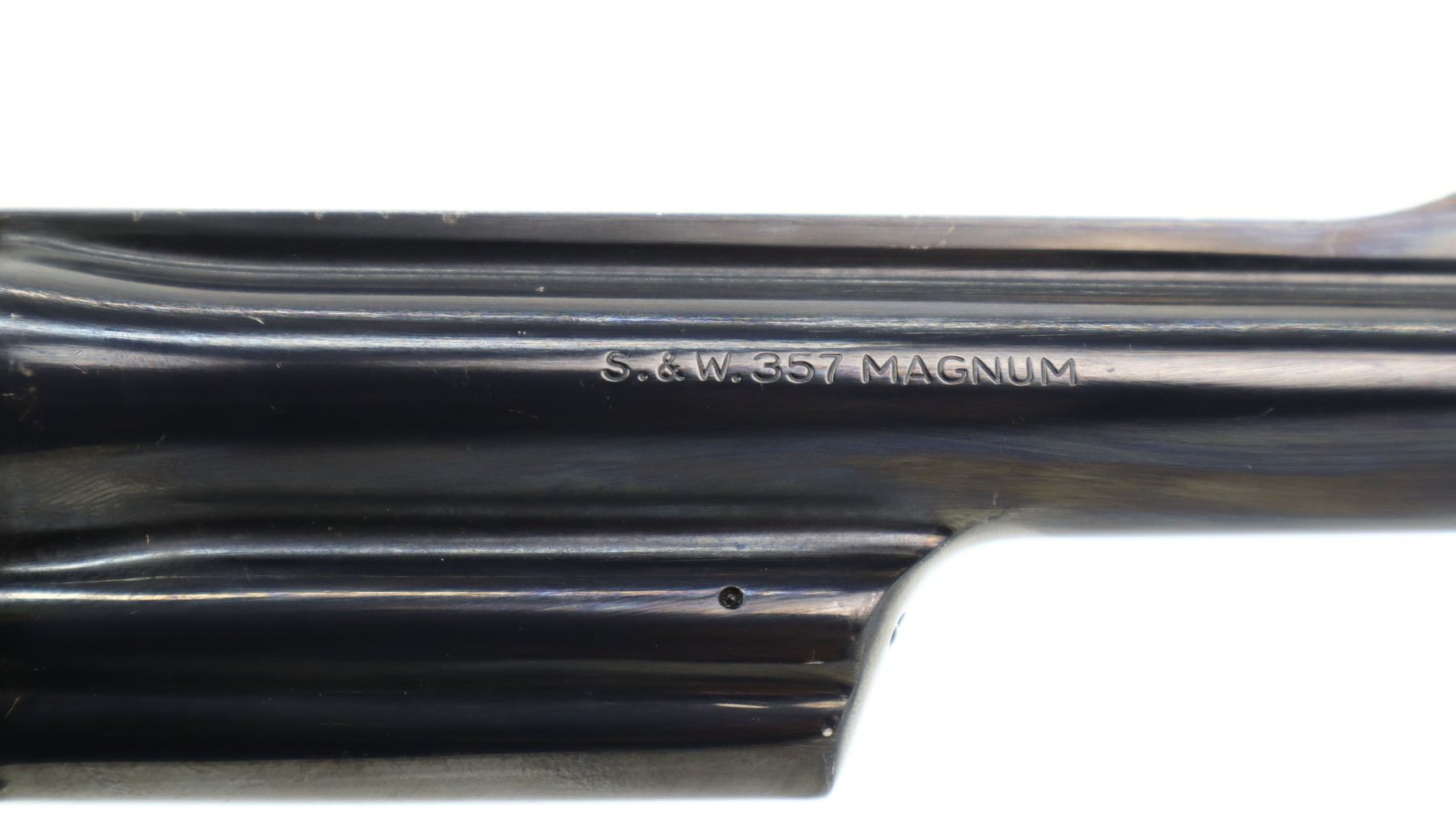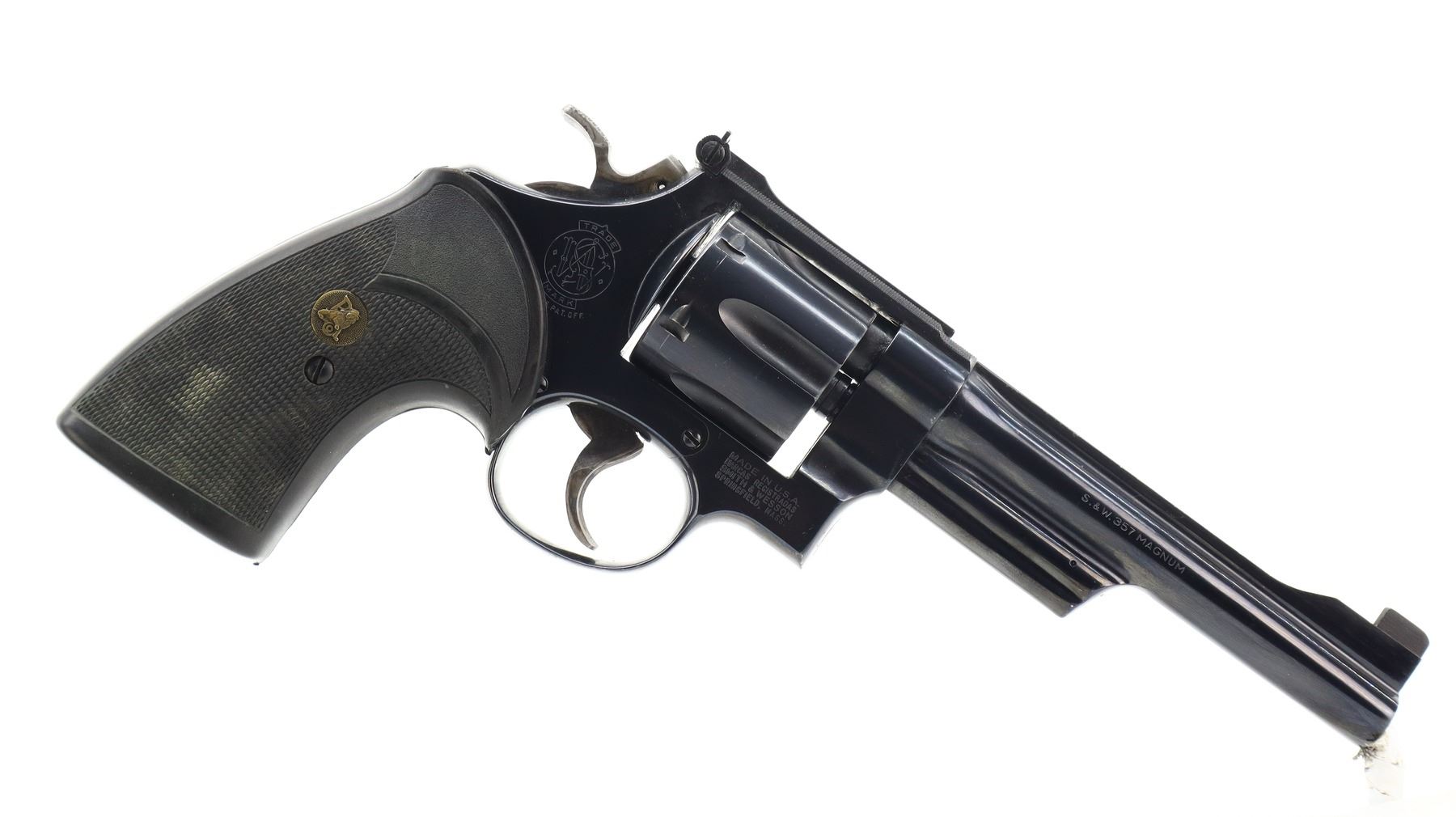 7+/10, SMITH & WESSON, MODEL: 27-3, CALIBER: 357 MAG, BORE IS EXCELLENT. FUNCTIONS MECHANICALLY AS DESIGNED. BLADE FRONT SIGHT WITH RAMP, ADJUSTABLE U NOTCHED REAR SIGHT, POLISH BLUED FINISH, COLOUR CASE HARDENED CHECKERED WIDE SPURR HAMMER AND GROOVED TRIGGER. ONE PIECE CHECKERED BLACK RUBBER GRIP WITH PACHMAYR MEDALLIONS, BARREL HAS HALF UNDERLUG. METAL FINISH SHOWS SOME SCRATCHES, HANDLING MARKS AND WEAR. GRIPS SHOW SOME MARKS AND SCRATCHES. BARREL LENGTH: 150MM, SERIAL # AVC8405, CONDITION: 7+/10, ACTION: REVOLVER, CLASS: CANADIAN RESTRICTED