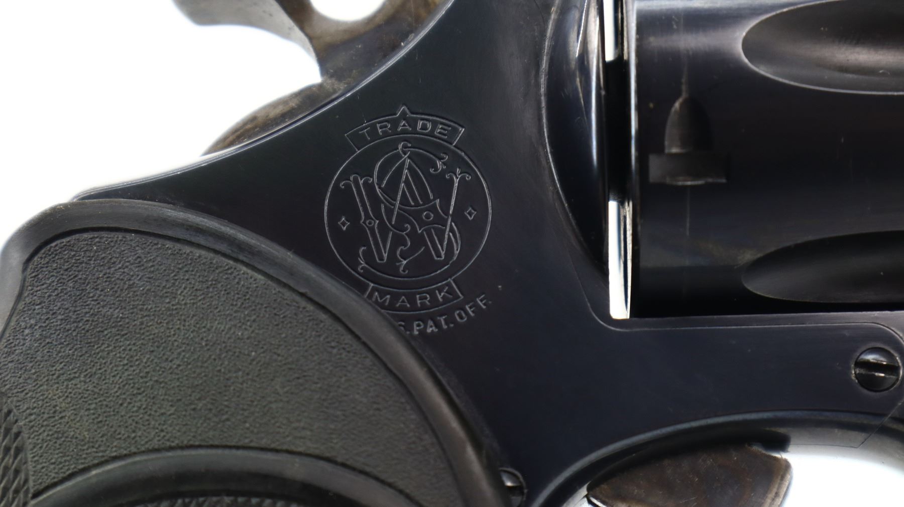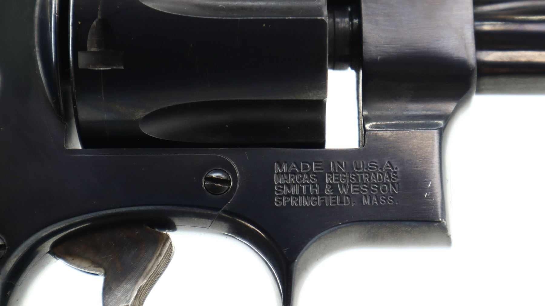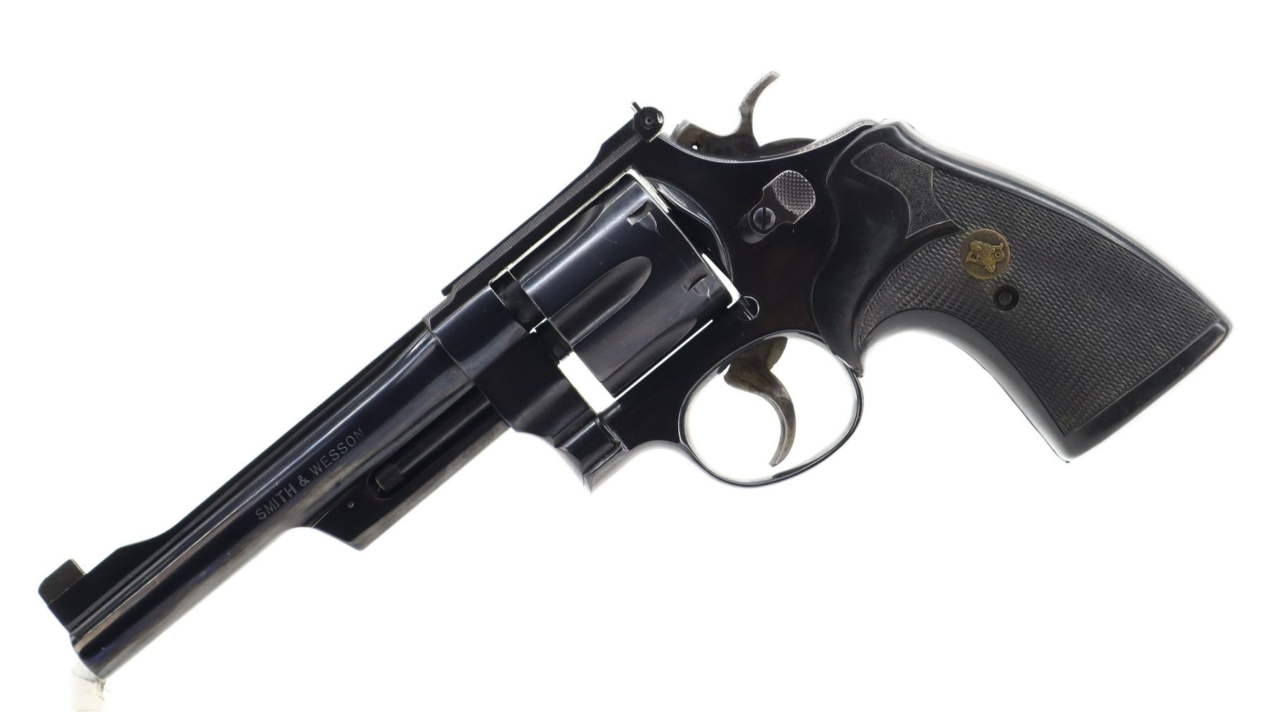 7+/10, SMITH & WESSON, MODEL: 27-3, CALIBER: 357 MAG, BORE IS EXCELLENT. FUNCTIONS MECHANICALLY AS DESIGNED. BLADE FRONT SIGHT WITH RAMP, ADJUSTABLE U NOTCHED REAR SIGHT, POLISH BLUED FINISH, COLOUR CASE HARDENED CHECKERED WIDE SPURR HAMMER AND GROOVED TRIGGER. ONE PIECE CHECKERED BLACK RUBBER GRIP WITH PACHMAYR MEDALLIONS, BARREL HAS HALF UNDERLUG. METAL FINISH SHOWS SOME SCRATCHES, HANDLING MARKS AND WEAR. GRIPS SHOW SOME MARKS AND SCRATCHES. BARREL LENGTH: 150MM, SERIAL # AVC8405, CONDITION: 7+/10, ACTION: REVOLVER, CLASS: CANADIAN RESTRICTED