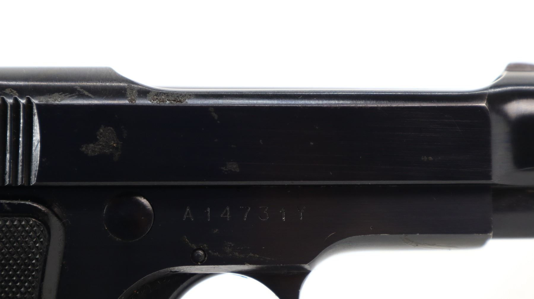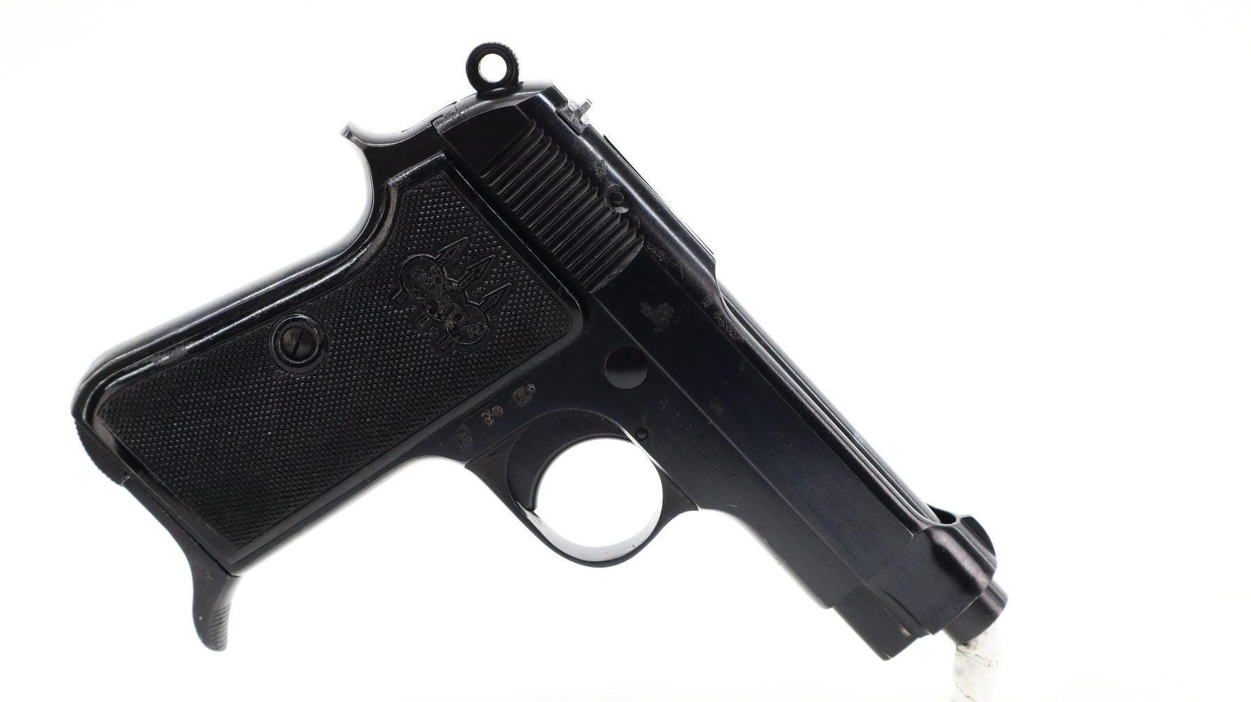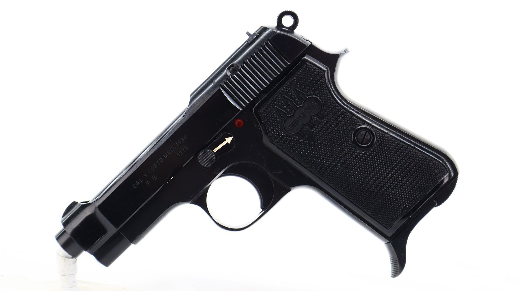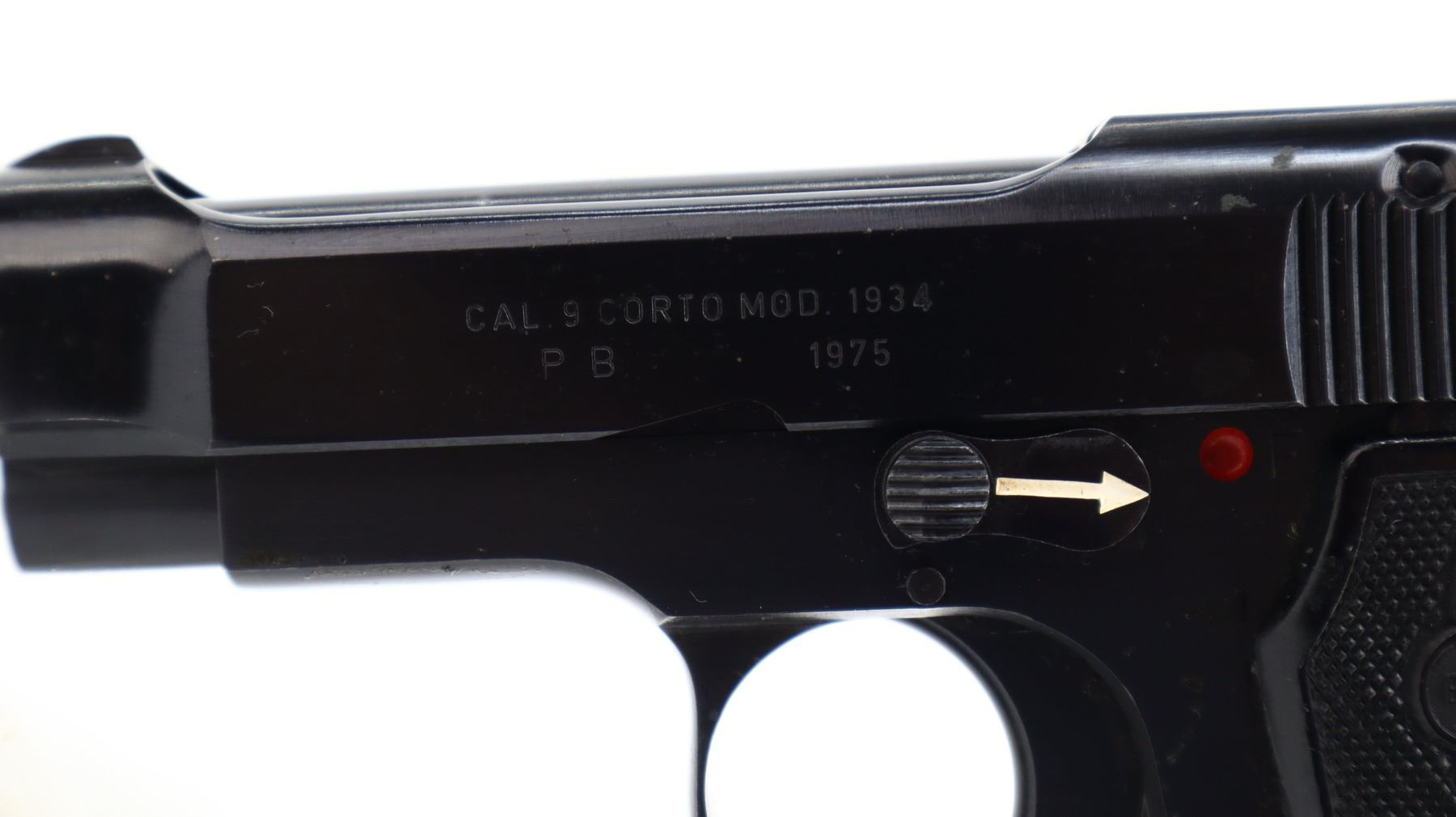 8+/10, BERETTA, MODEL: 1934, CALIBER: 9MM KURZ, COMES WITH CASE, MAGAZINE, BORE IS EXCELLENT. BLADE FRONT SIGHT, U NOTCHED REAR SIGHT, BLUED FINISH, GROOVED ROUND HAMMER AND SMOOTH TRIGGER, HEEL MAG RELEASE. TWO PIECE CHECKERED BLACK POLYMER GRIPS WITH BERETTA LOGO. METAL FINISH SHOWS SOME SCRATCHES AND HANDLING MARKS. GRIPS SHOW SOME SLIGHT MARKS. BARREL LENGTH: 85MM, SERIAL # A14731Y, CONDITION: 8+/10, ACTION: SEMI AUTOMATIC PISTOL, CLASS: CANADIAN 12-6 PROHIBITED