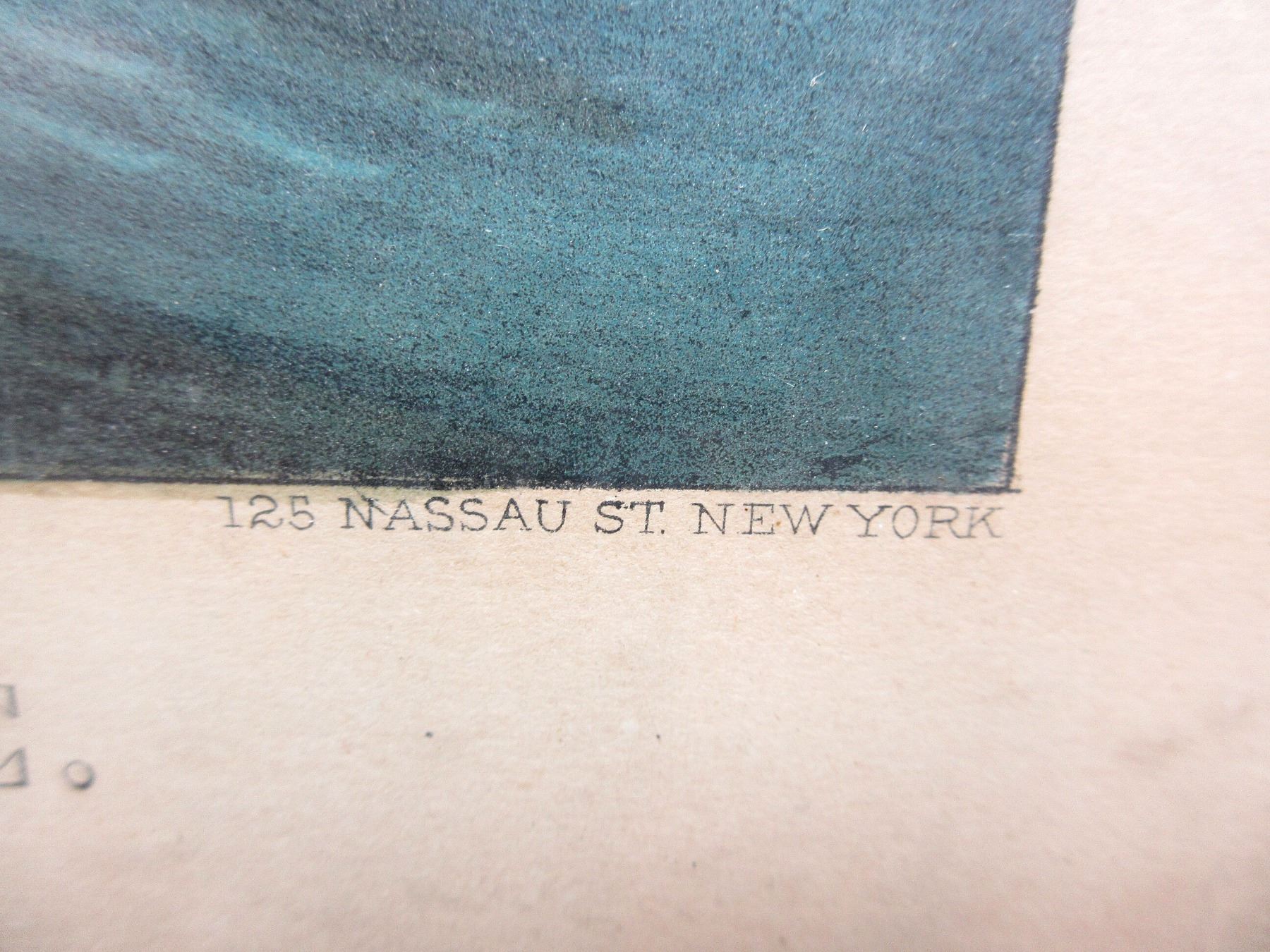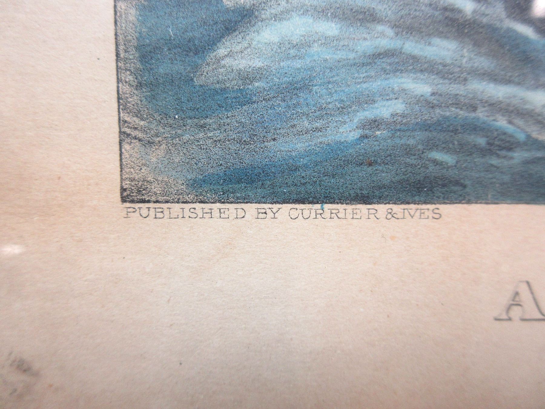 (1) PRINT MARKED: "PUBLISHED BY CURRIER & IVES, 125 NASSAU ST. NEW YORK", NO VISIBLE SIGNATURE OR ARTIST'S NAME, IN WOODEN FRAME, UNDER GLASS, FRAME APPROX. 19 3/8" X 15.5". SEE PHOTOS. *NO GUARANTEE ON GLASS FOR SHIPPING*
