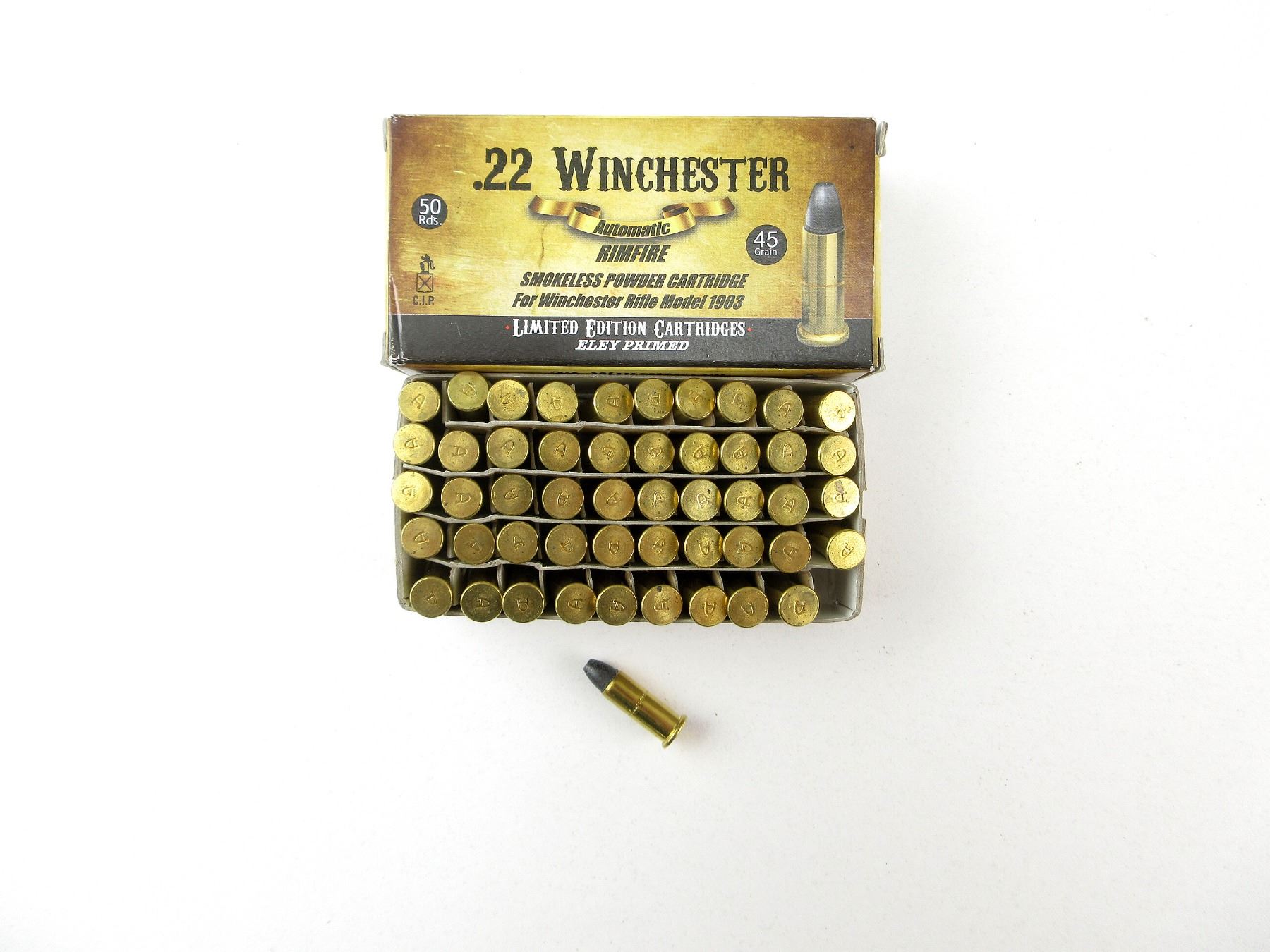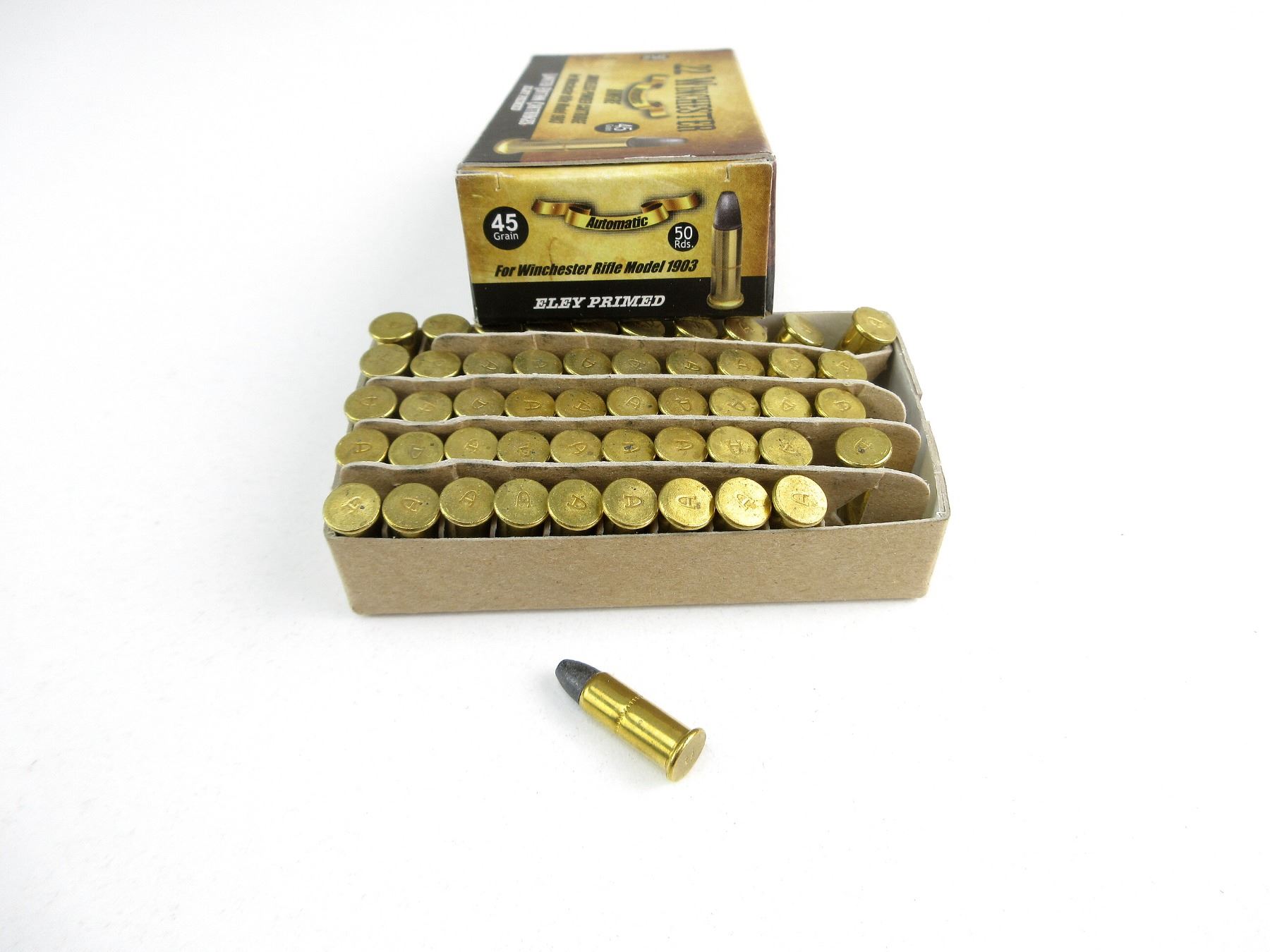 LOT INCLUDES; APPROX. (50) RNDS, 45 RGNS (STATED ON BOX NOT CONFIRMED), ELEY PRIMED, FOR WINCHESTER RIFLE MODEL 1903.