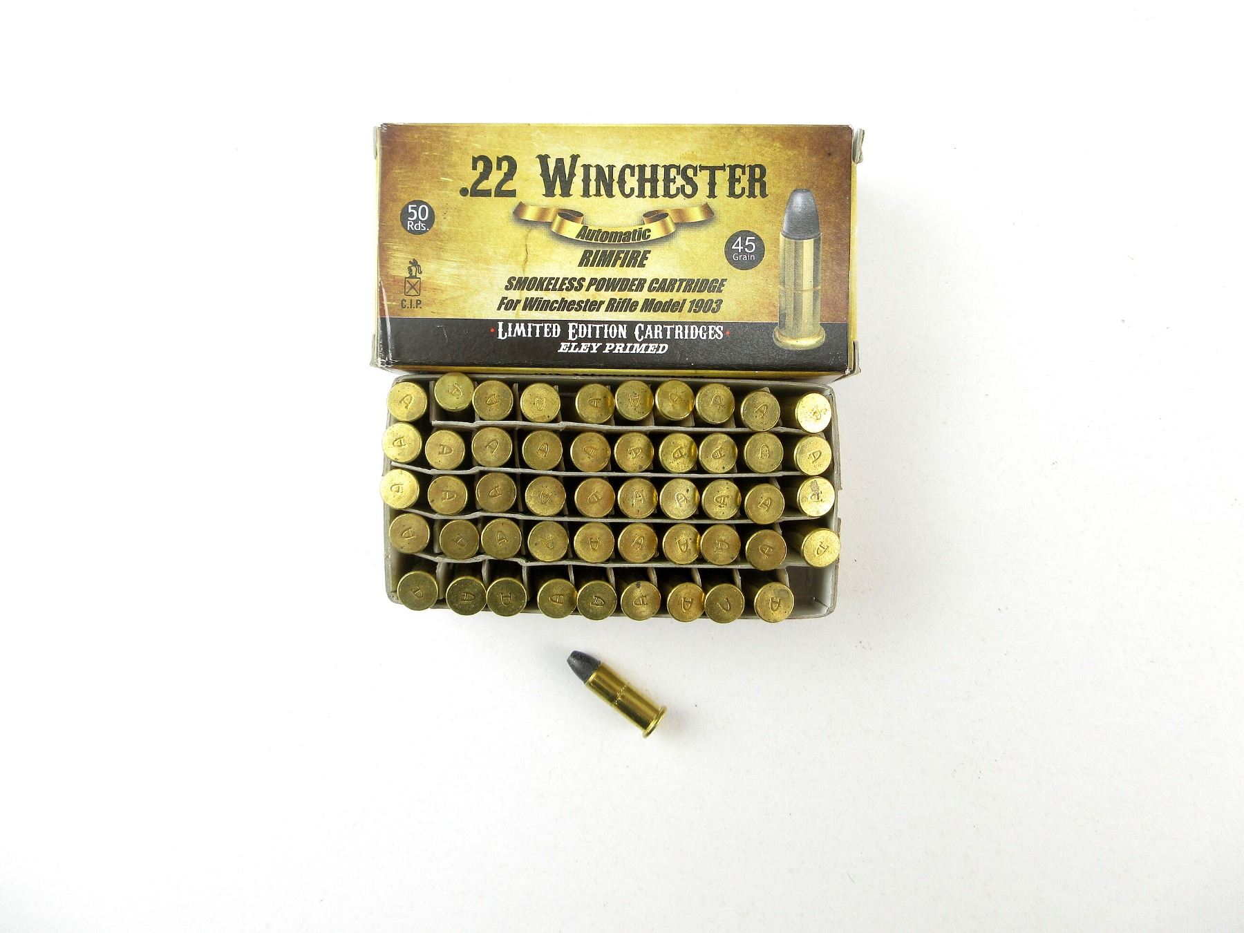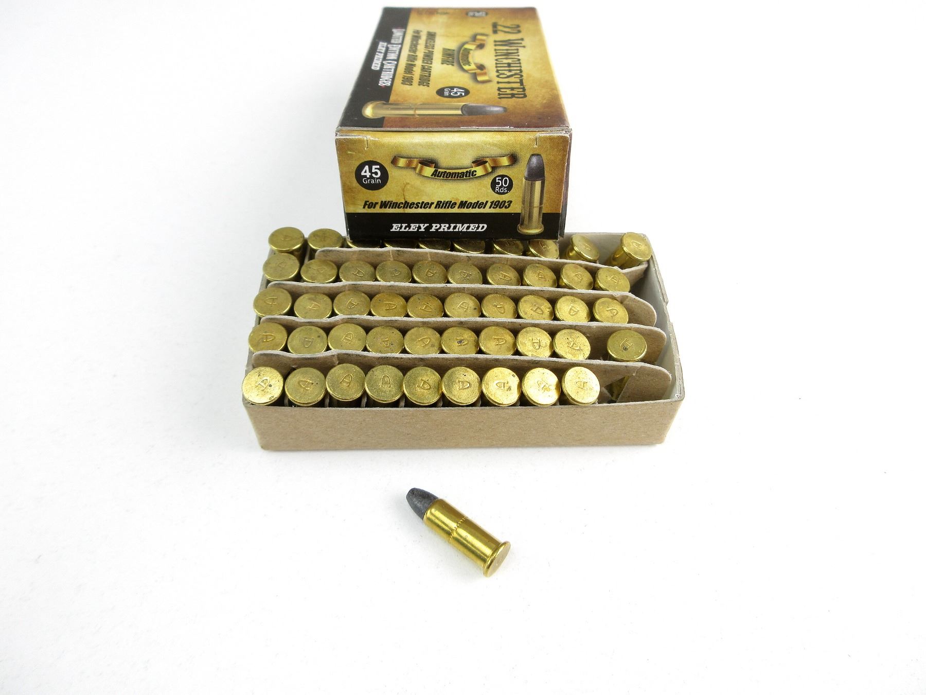 LOT INCLUDES; APPROX. (50) RNDS, 45 RGNS (STATED ON BOX NOT CONFIRMED), ELEY PRIMED, FOR WINCHESTER RIFLE MODEL 1903.