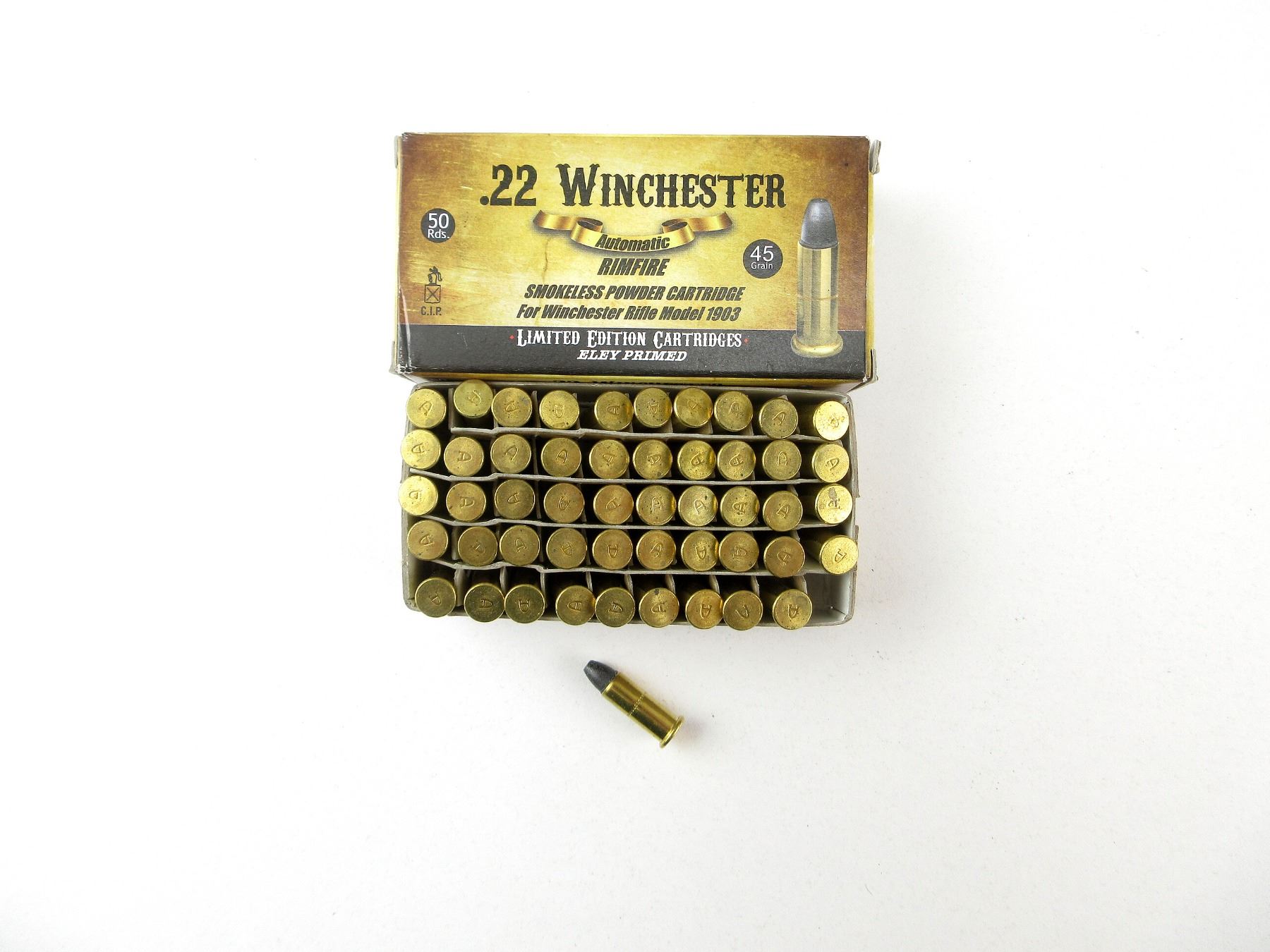 LOT INCLUDES; APPROX. (50) RNDS, 45 RGNS (STATED ON BOX NOT CONFIRMED), ELEY PRIMED, FOR WINCHESTER RIFLE MODEL 1903.