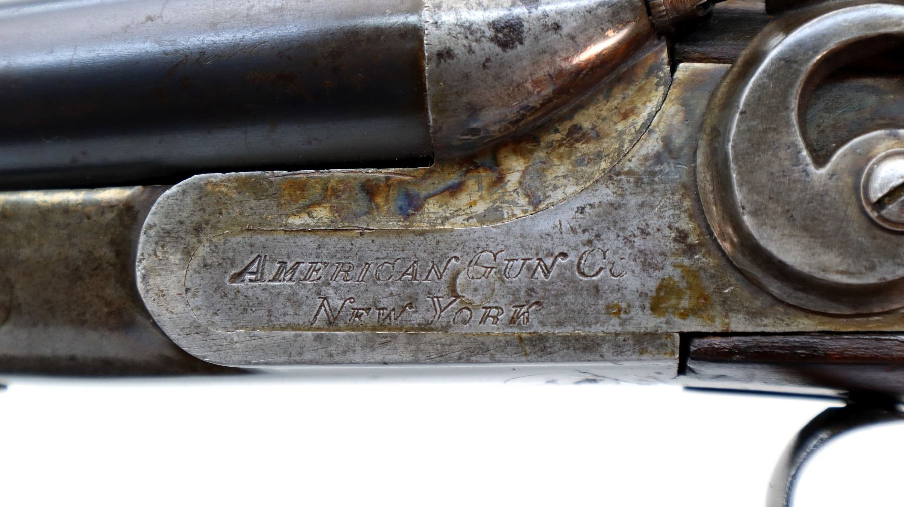 Main Description: Brass bead, blued barrels with raised rib, silver receiver with side locks and checkered spur hammers that function, extractor, double triggers. Two piece wood stocks, checkered forearm which is loose, checkered pistol grip and black polymer butt plate, stock is chipped, cracked and broken through wrist
