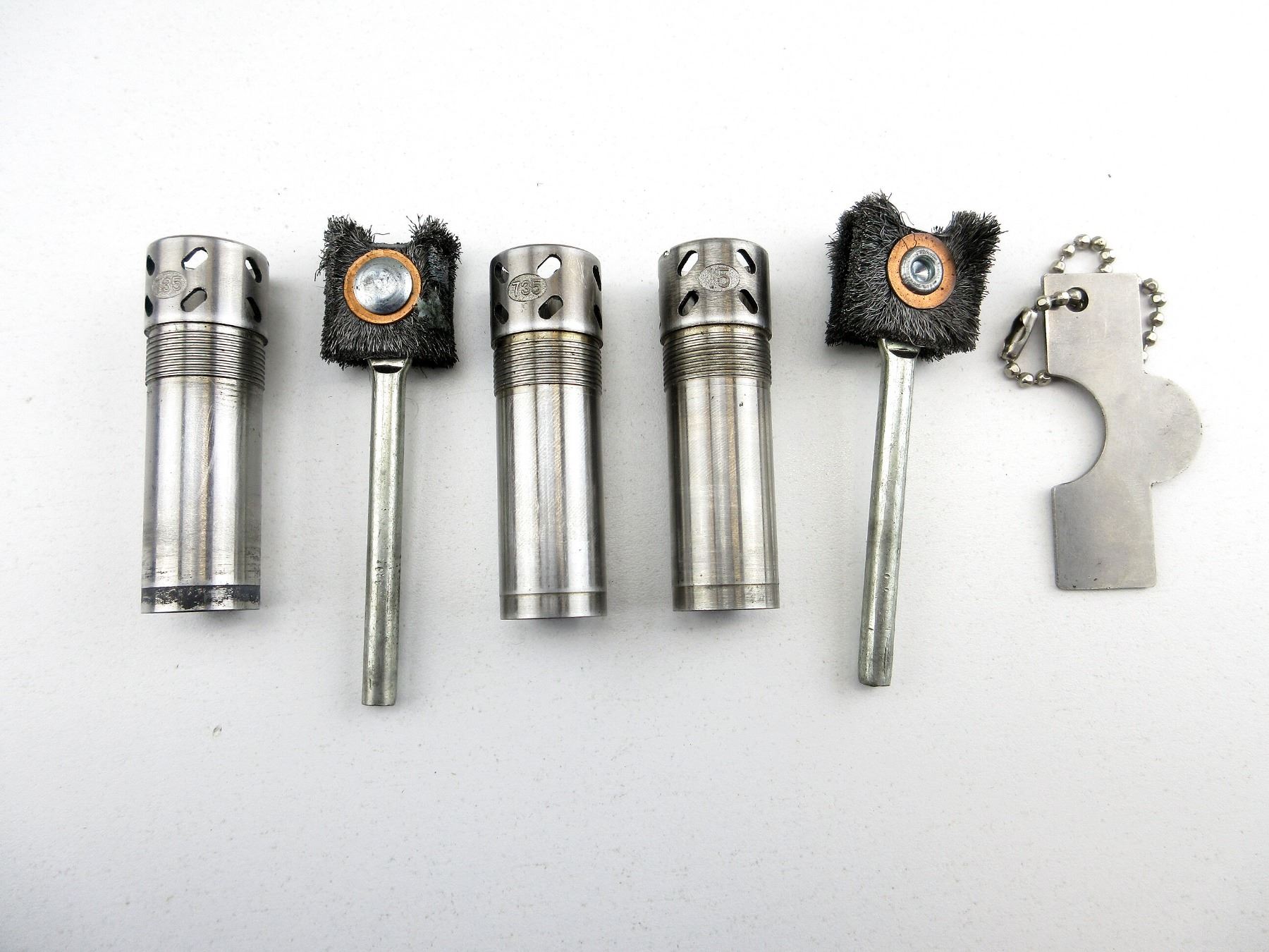 LOT INCLUDES; (1) 12 G. CYLINDER CHOKE MARKED: "0", (1) 12 G. IMP. CYL. CHOKE MARKED: "10", (1) 12 G. LIGHT MOD. CHOKE MARKED: "15", (1) TOOL & (2) ASSORTED SQUARE TRIM BRUSHES. MAY REQUIRE FITTING. SEE PHOTOS.