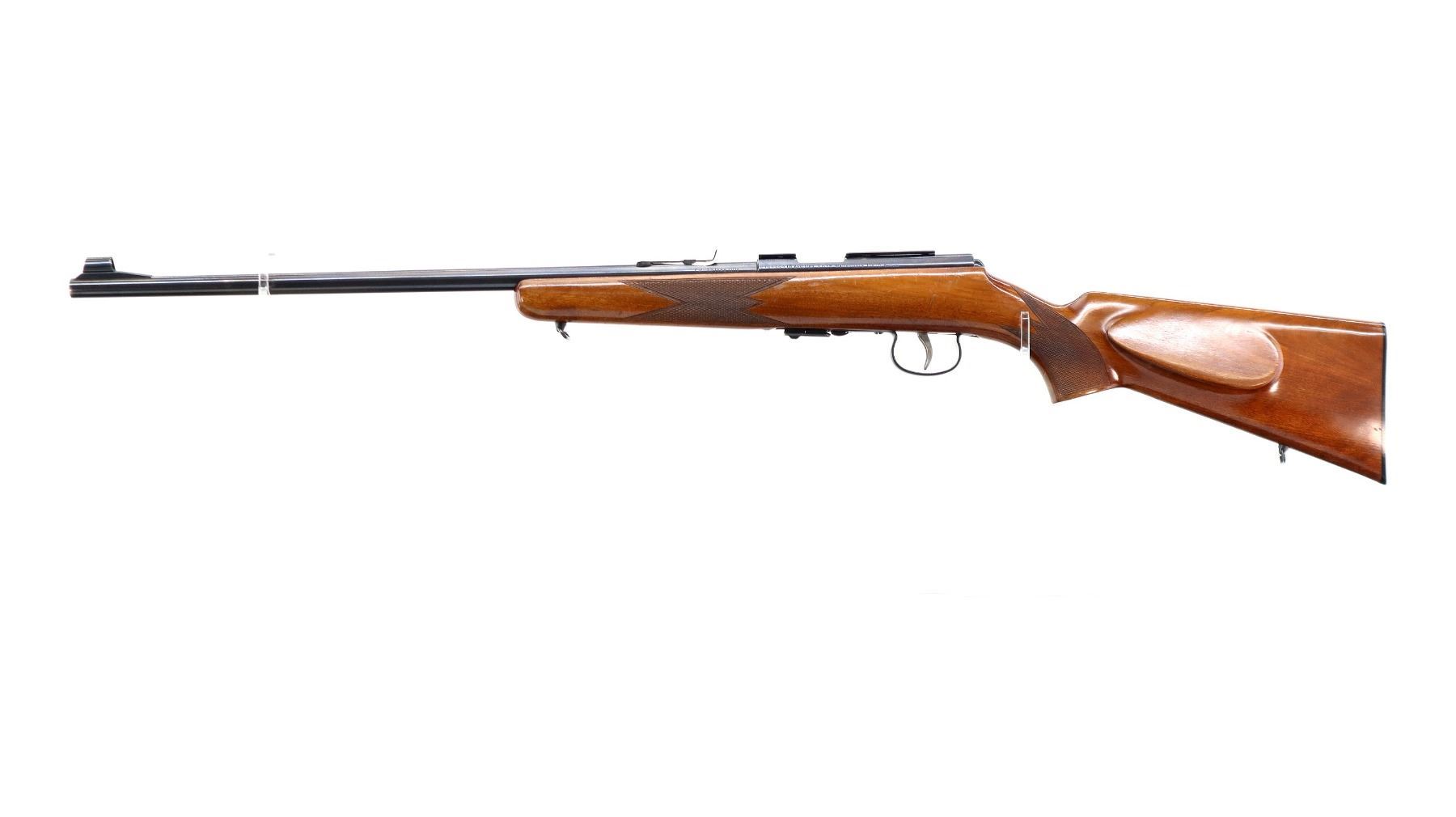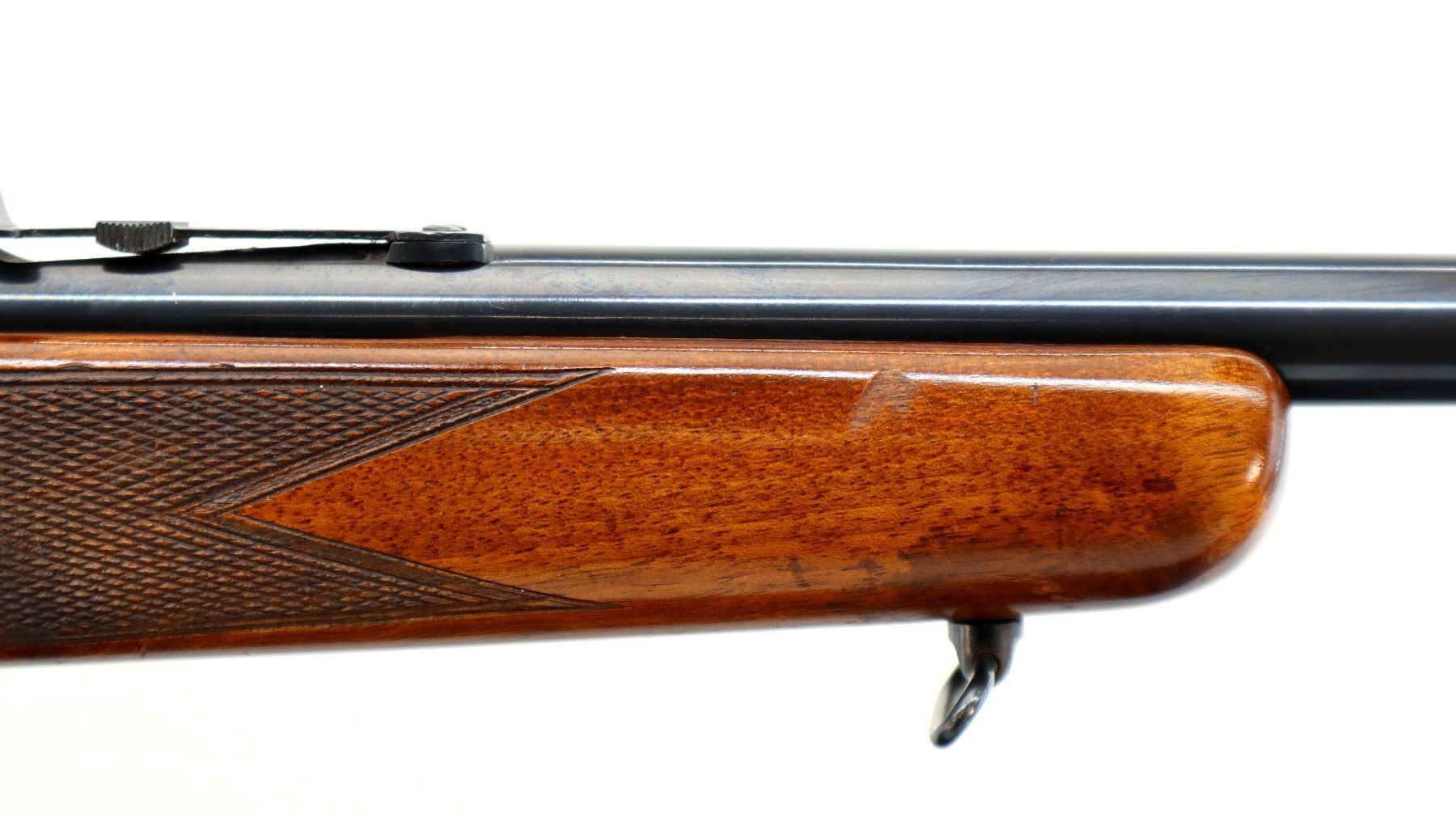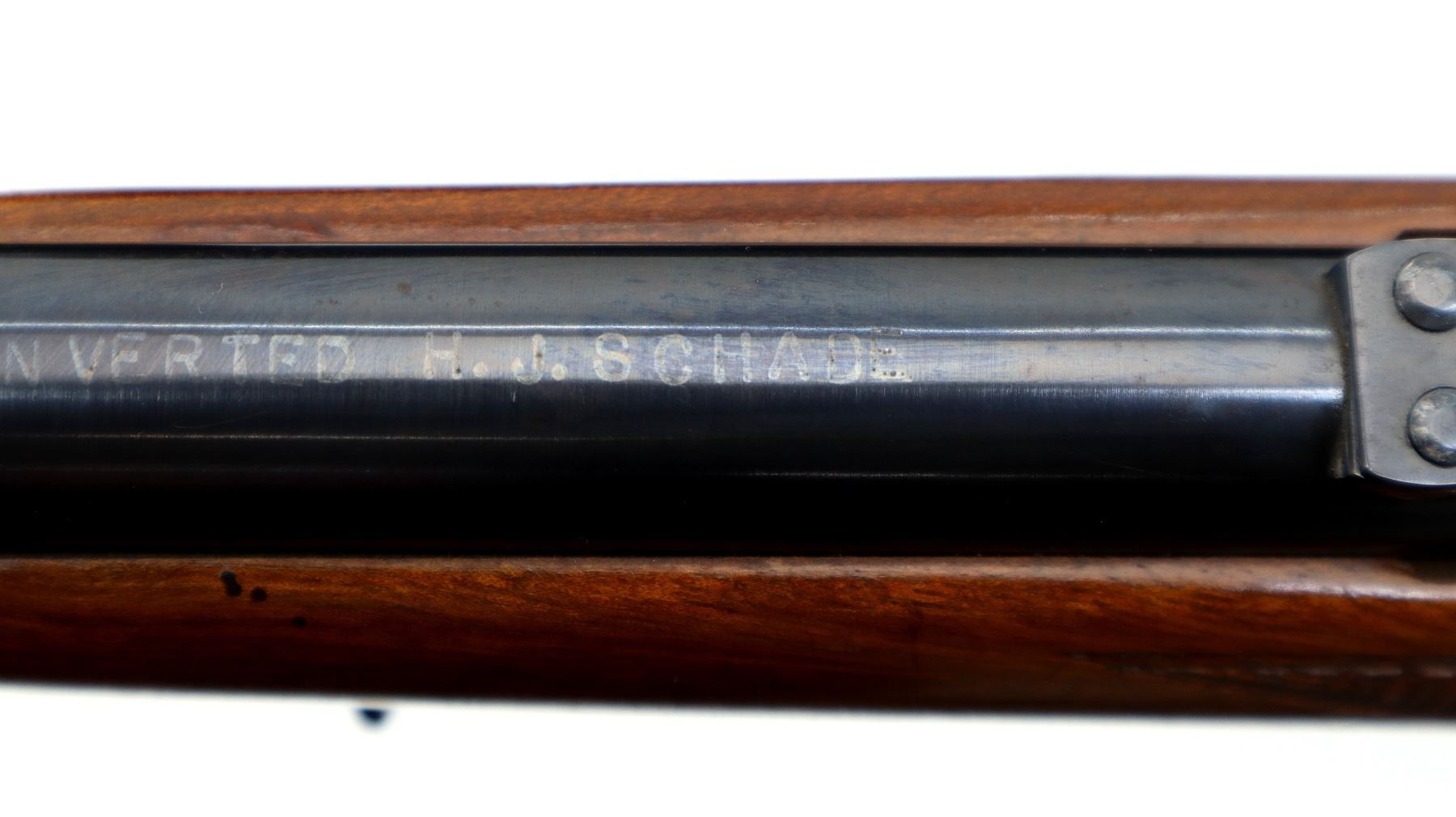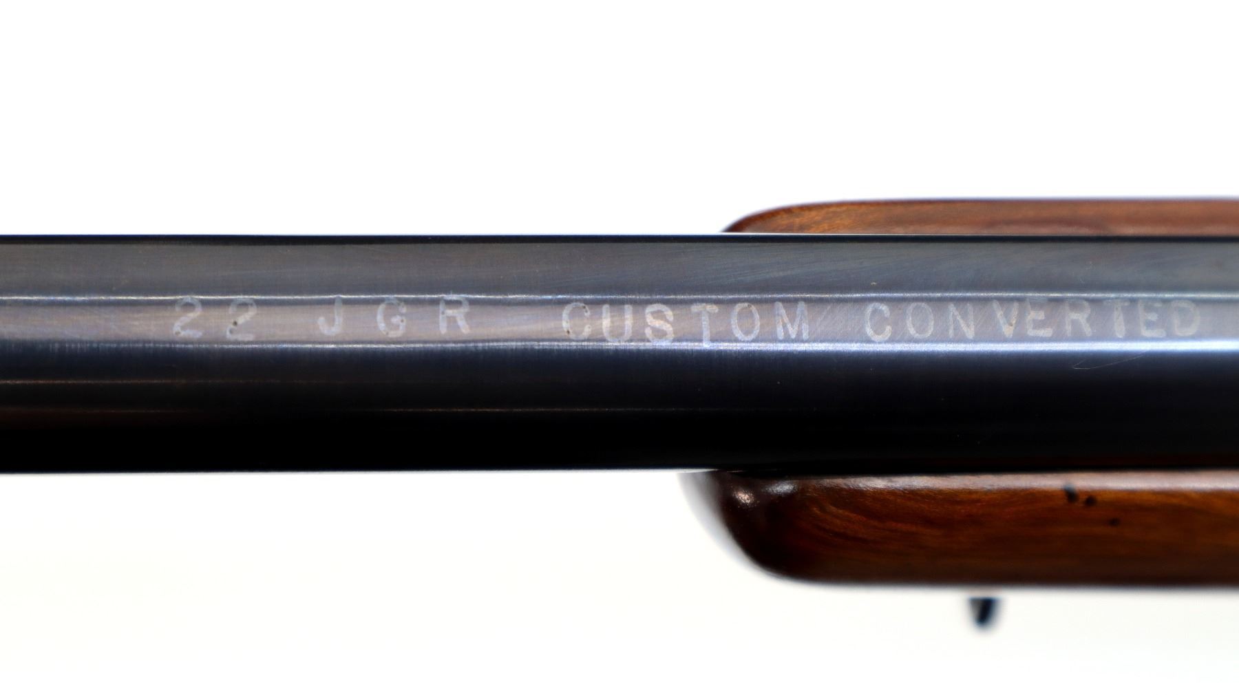 Main Description: This rifle is a custom conversion to .22 JGR Center Fire. Blade front sight with hood and ramp, adjustable u notched rear sight, metal has been polished and reblued, receiver drilled and tapped with two piece scope base installed. One piece wood stock, checkered forearm and pistol grip, European cheek rest, grooved black polymer butt plate, sling swivels.