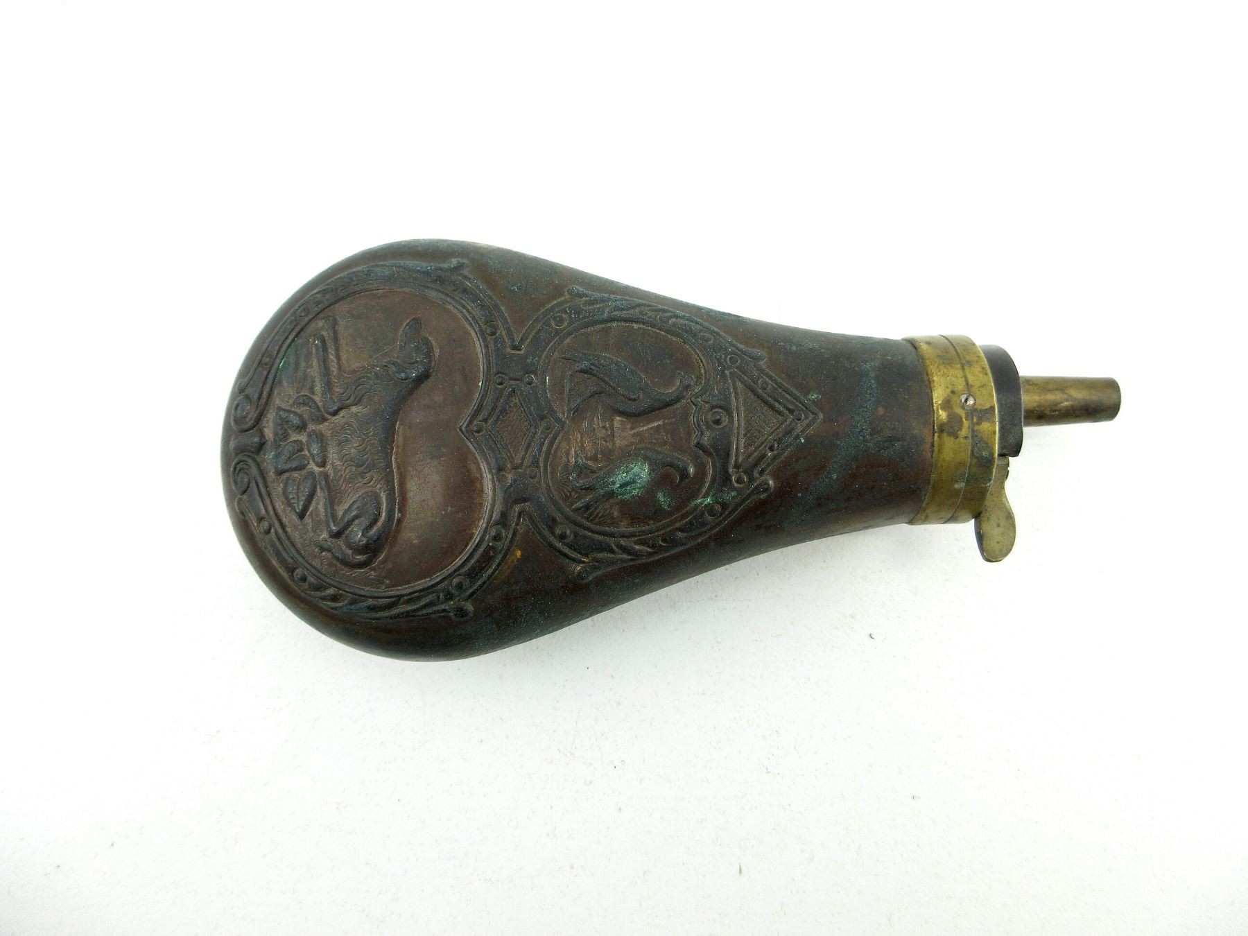 (1) COPPER & BRASS PISTOL POWDER FLASK, SPOUT MARKED: "MADE IN ITALY", DOUBLE-SIDED EMBOSSED PEACOCK & DOG MOTIFS, NO VISIBLE MARKINGS, OAL APPROX. 6". SEE PHOTOS.