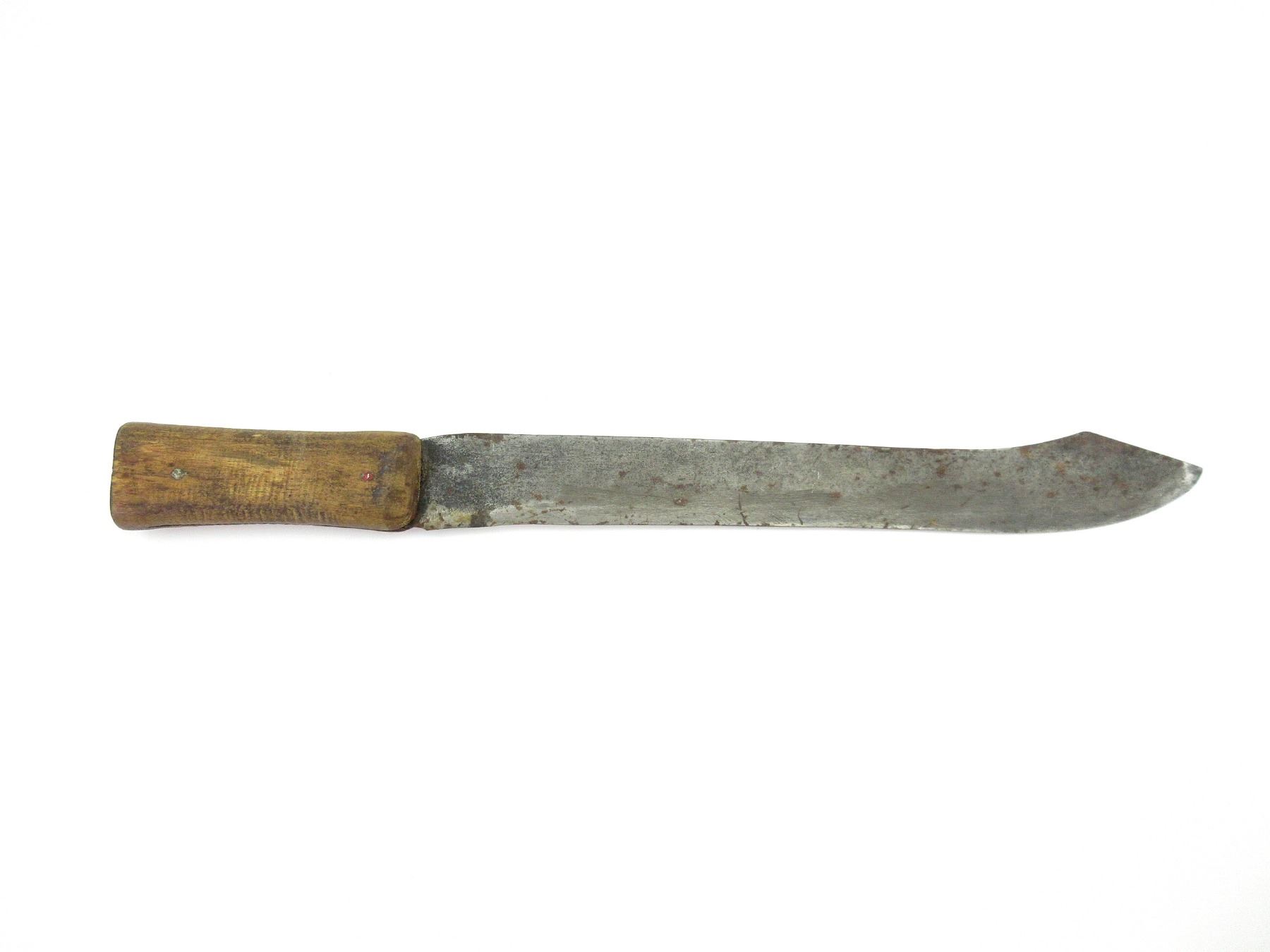 (1) FIXED BLADE KNIFE WITH 2-PIECE WOOD HANDLE (WOOD IS CRACKED), NO SHEATH, BLADE SHOWS AGE / WEAR / TEAR, BLADE APPROX. 13.25" & OAL APPROX. 17 7/8". SEE PHOTOS.
