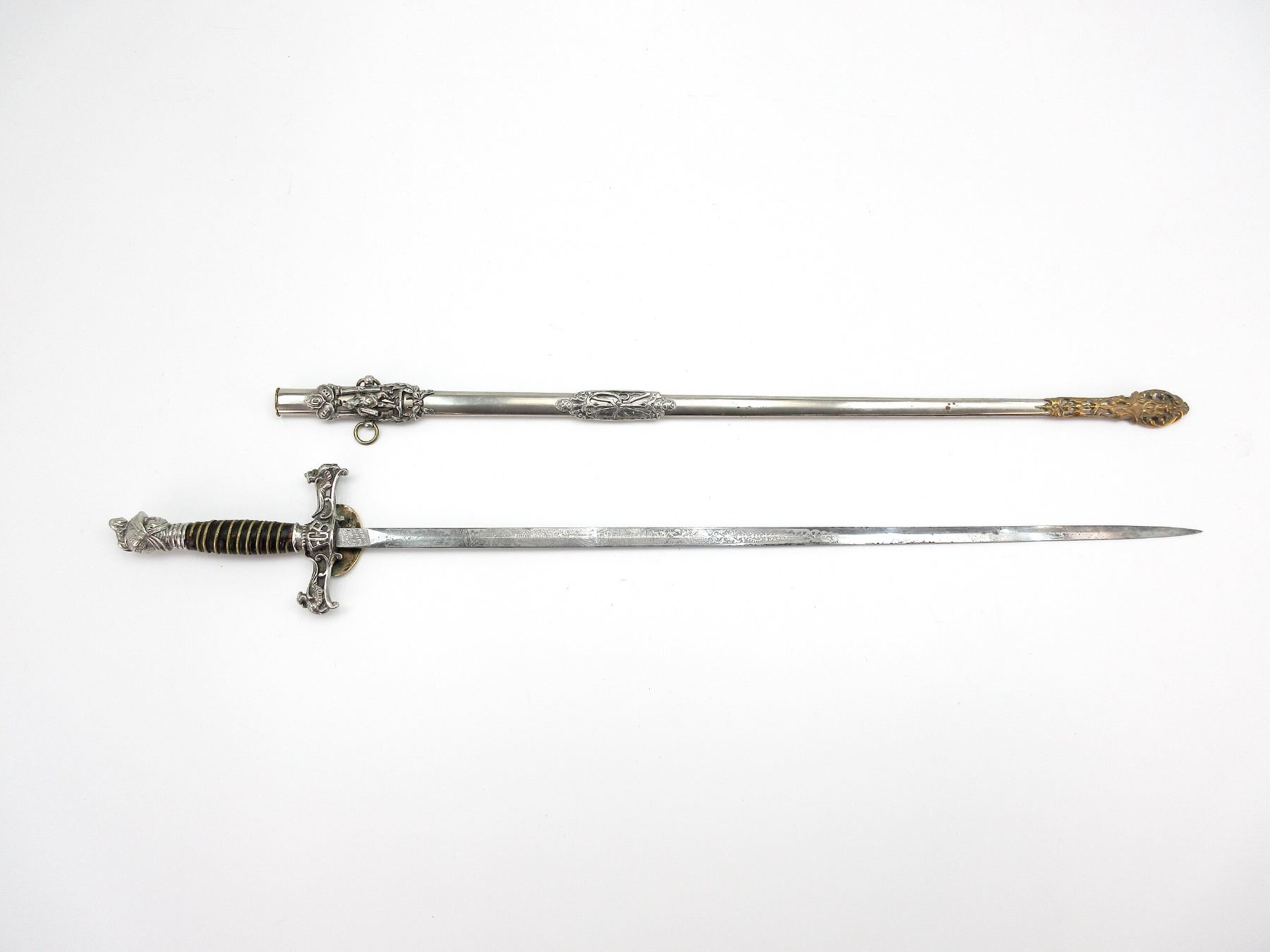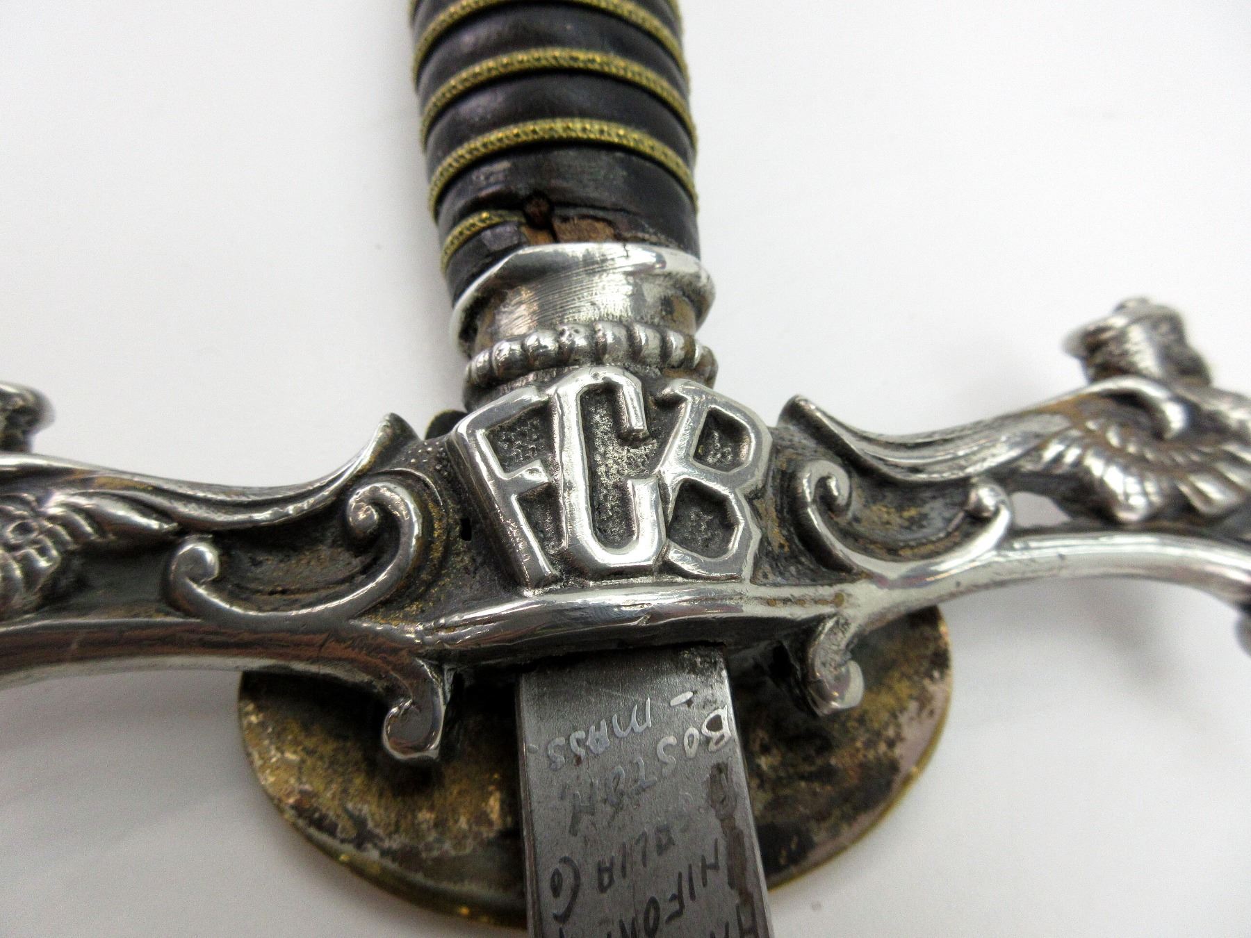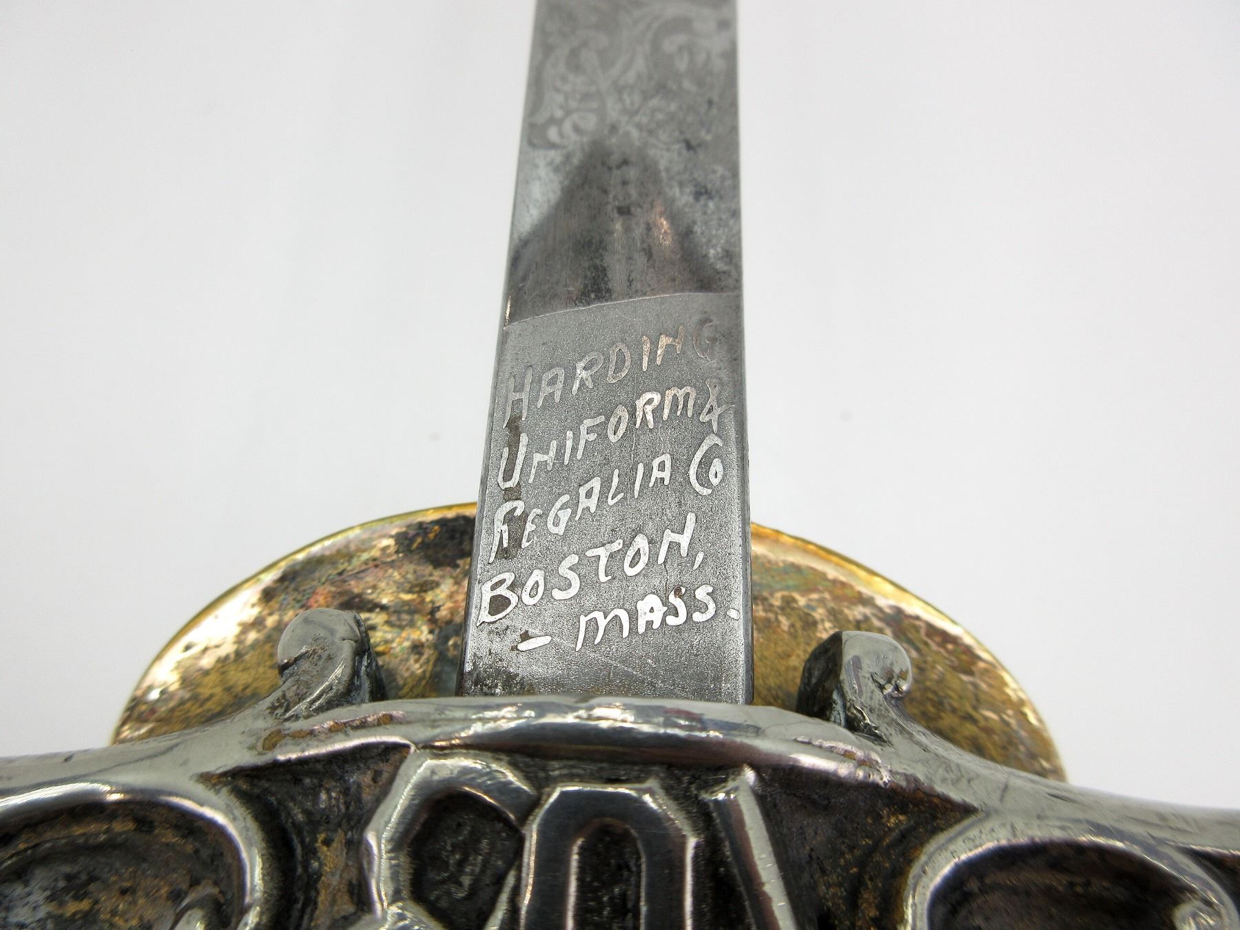 (1) STRAIGHT THIN DOUBLE-EDGED SWORD, MARKED: "HARDING, UNIFORM &, REGALIA CO, BOSTON, - MASS.", ACID ETCHED BLADE WITH VARIOUS DECORATIVE ETCHINGS, ORNATE CROSS-GUARD WHICH IS LOOSE, MARKED: "FCB", OTHER-SIDE HAS BRASS PIECE MARKED: "UR", BRASS WIRE WRAPPED LEATHER GRIP, KNIGHT'S HEAD POMMEL WHICH IS LOOSE, ORNATE NICKEL SCABBARD MARKED: "FCB", VARIOUS DECORATIVE DESIGNS, TWO HANGERS, BRASS DECORATIVE TIP, BLADE APPROX. 30" & OAL APPROX. 37 3/8". SEE PHOTOS.