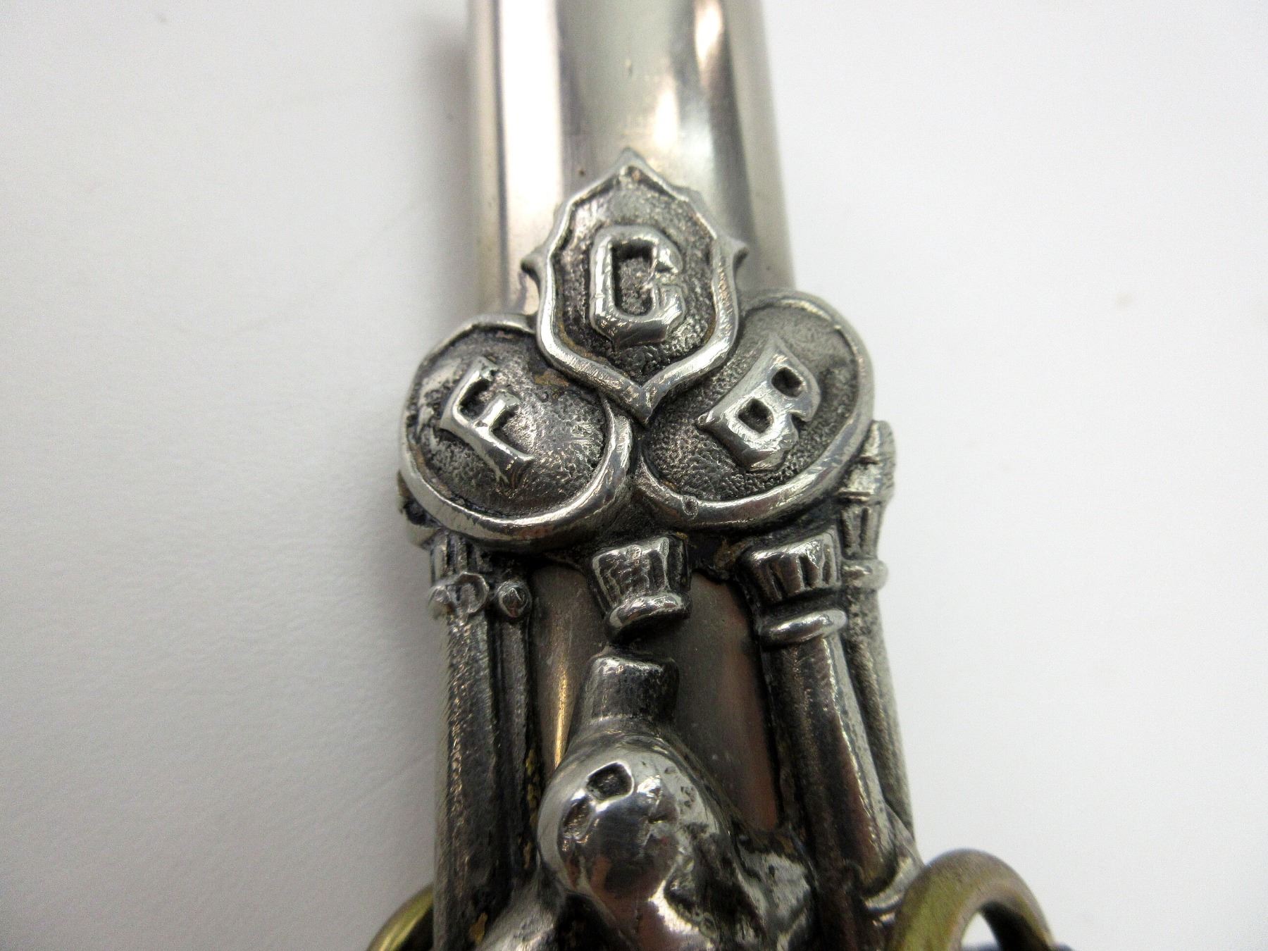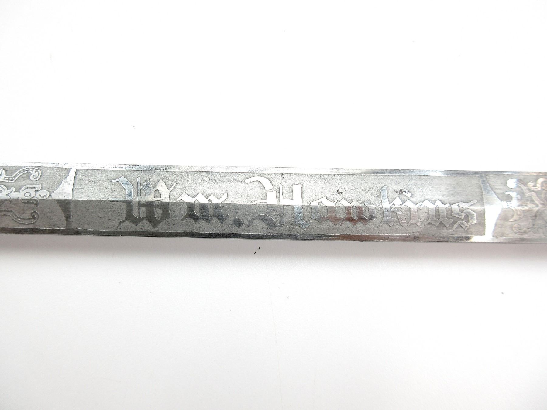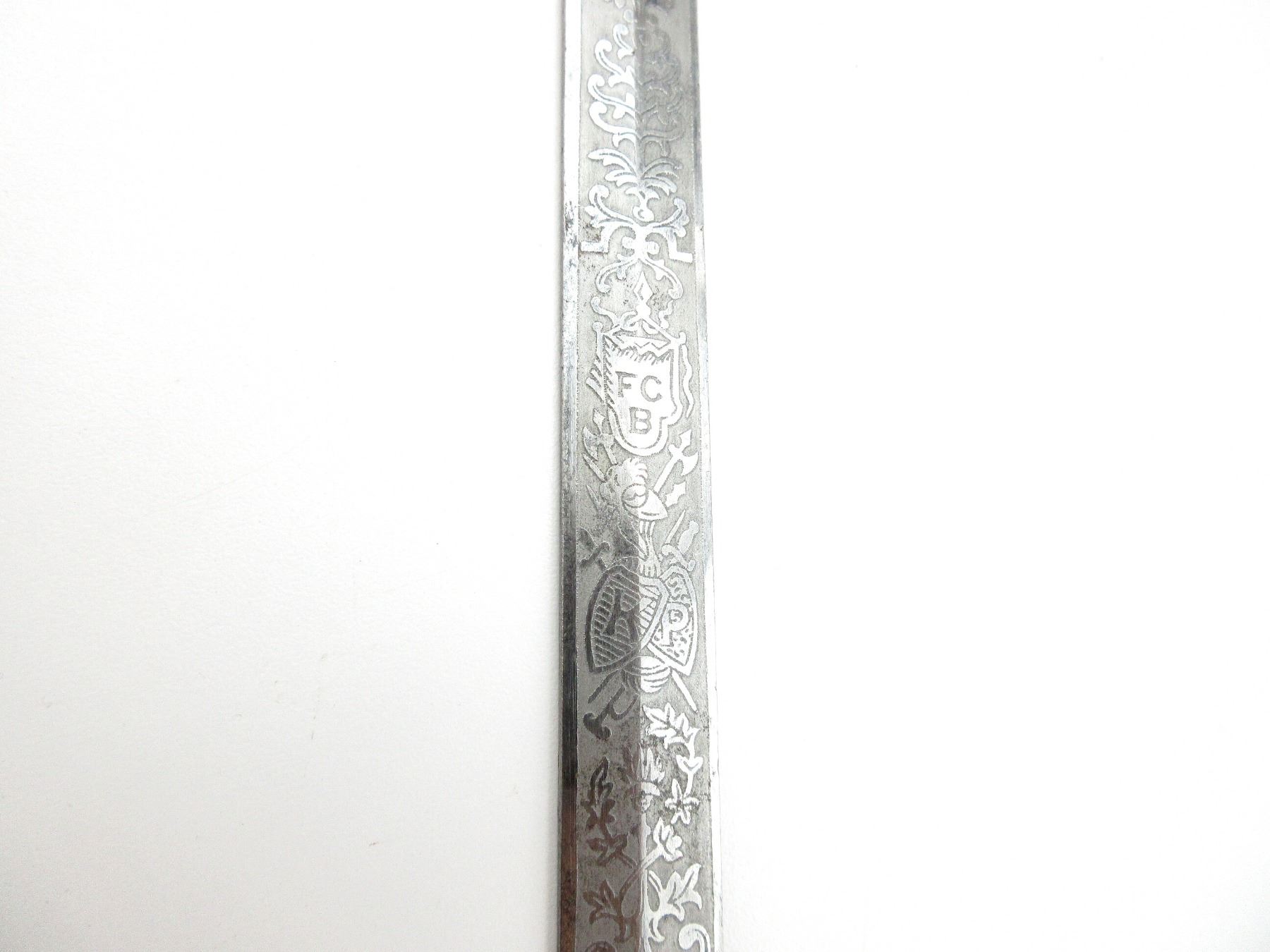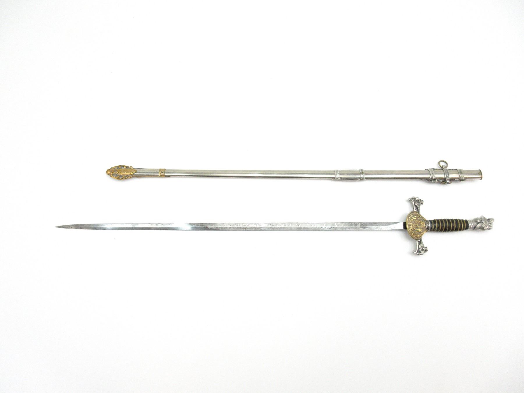 (1) STRAIGHT THIN DOUBLE-EDGED SWORD, MARKED: "HARDING, UNIFORM &, REGALIA CO, BOSTON, - MASS.", ACID ETCHED BLADE WITH VARIOUS DECORATIVE ETCHINGS, ORNATE CROSS-GUARD WHICH IS LOOSE, MARKED: "FCB", OTHER-SIDE HAS BRASS PIECE MARKED: "UR", BRASS WIRE WRAPPED LEATHER GRIP, KNIGHT'S HEAD POMMEL WHICH IS LOOSE, ORNATE NICKEL SCABBARD MARKED: "FCB", VARIOUS DECORATIVE DESIGNS, TWO HANGERS, BRASS DECORATIVE TIP, BLADE APPROX. 30" & OAL APPROX. 37 3/8". SEE PHOTOS.
