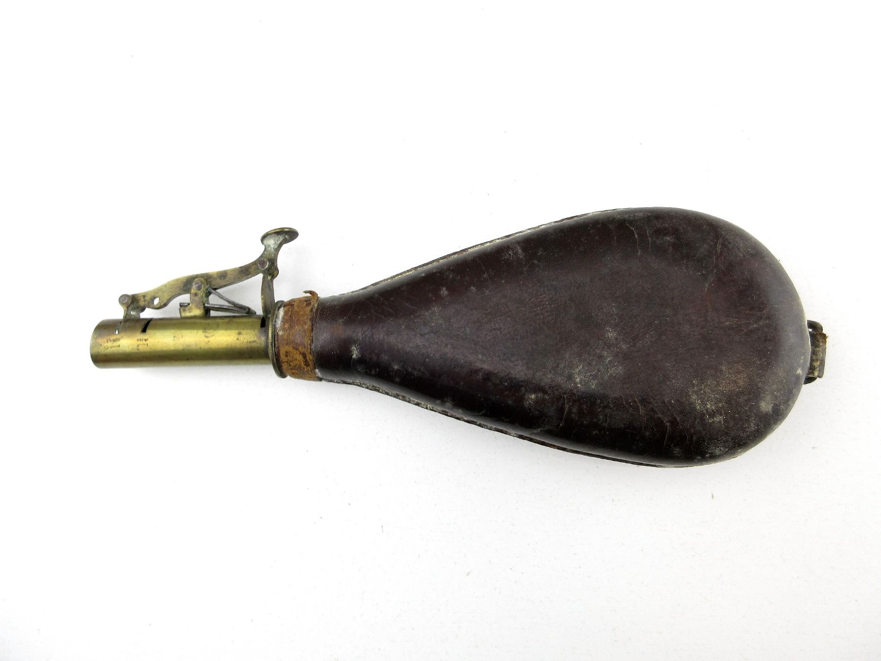 (1) BROWN LEATHER & BRASS SHOT FLASK, SPOUT HAS DRAM MARKINGS, NO OTHER VISIBLE MARKINGS, OAL APPROX. 8.25". SEE PHOTOS.