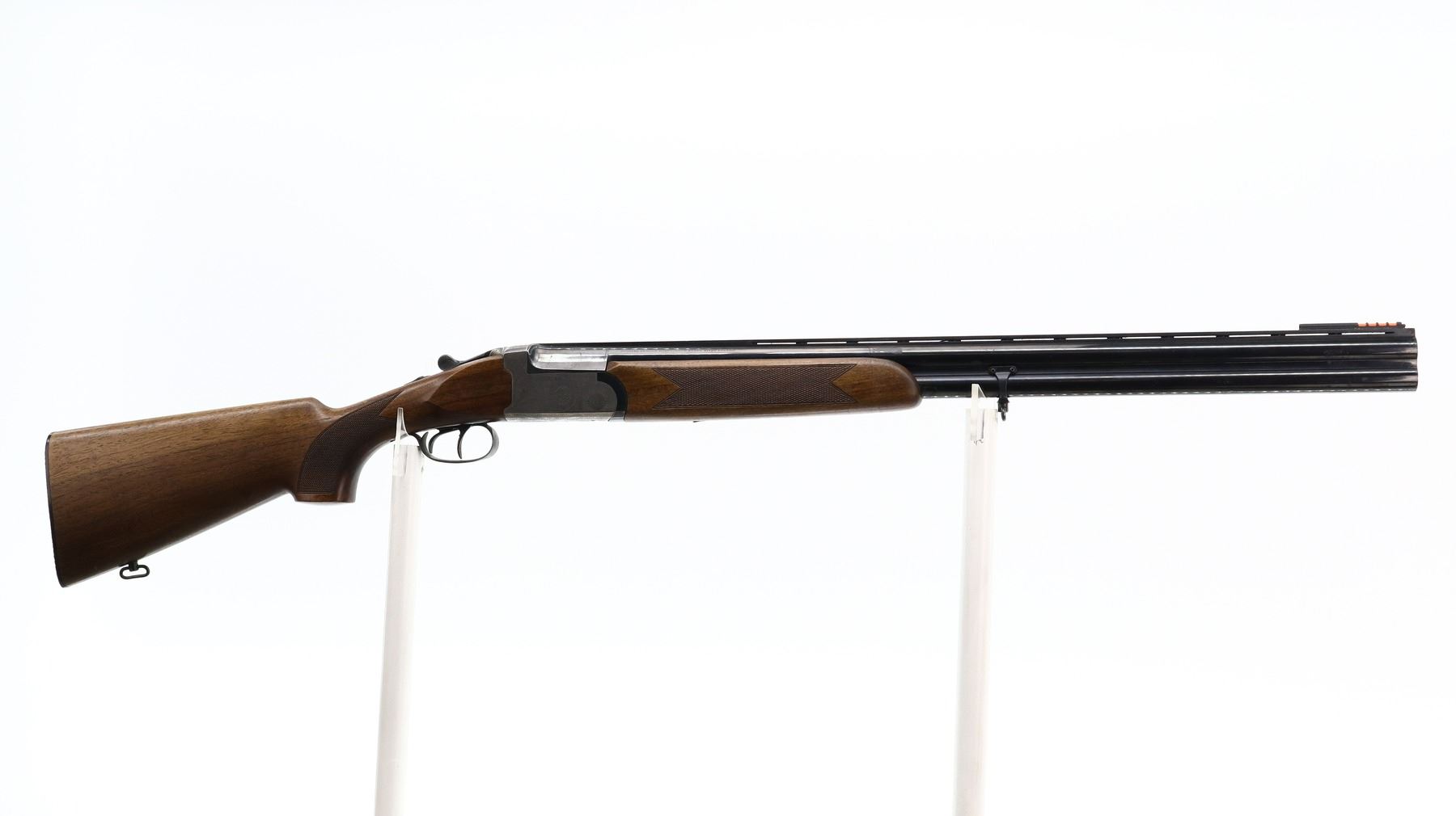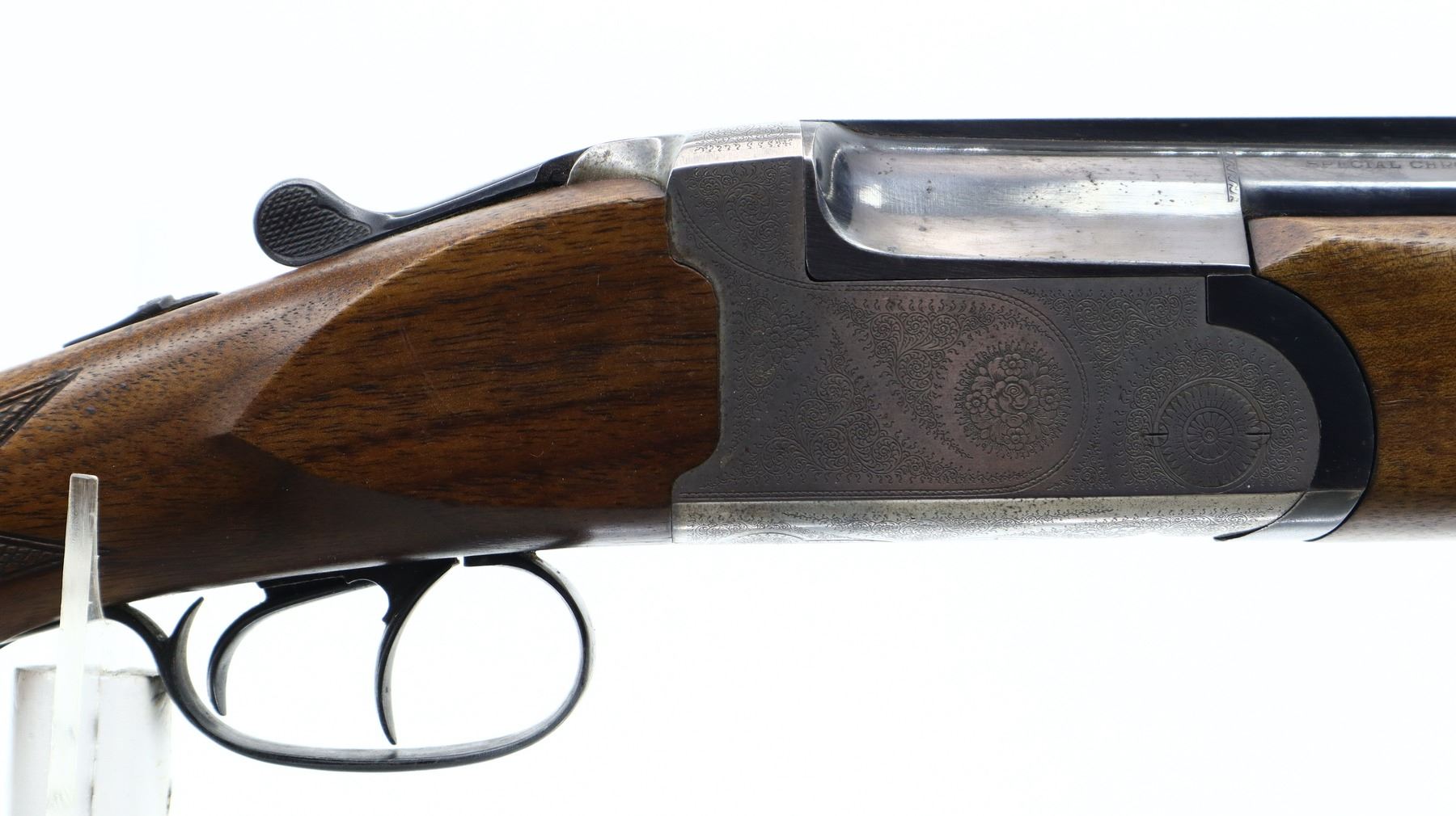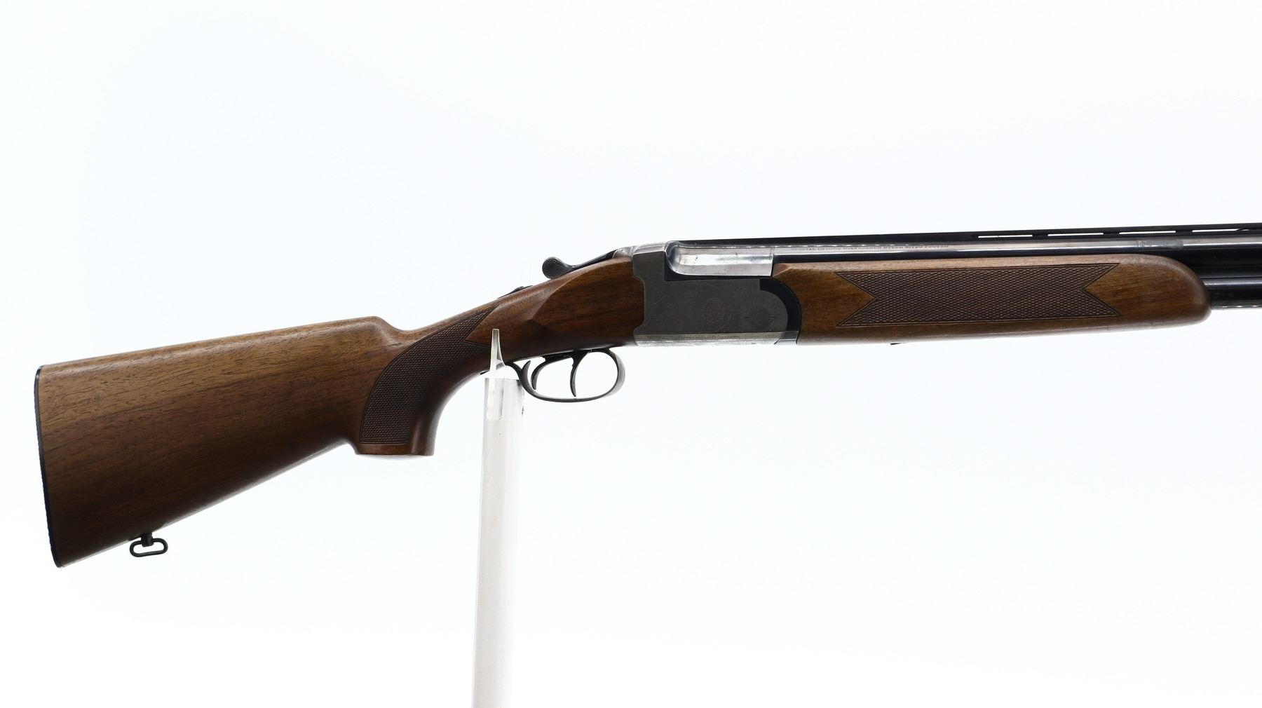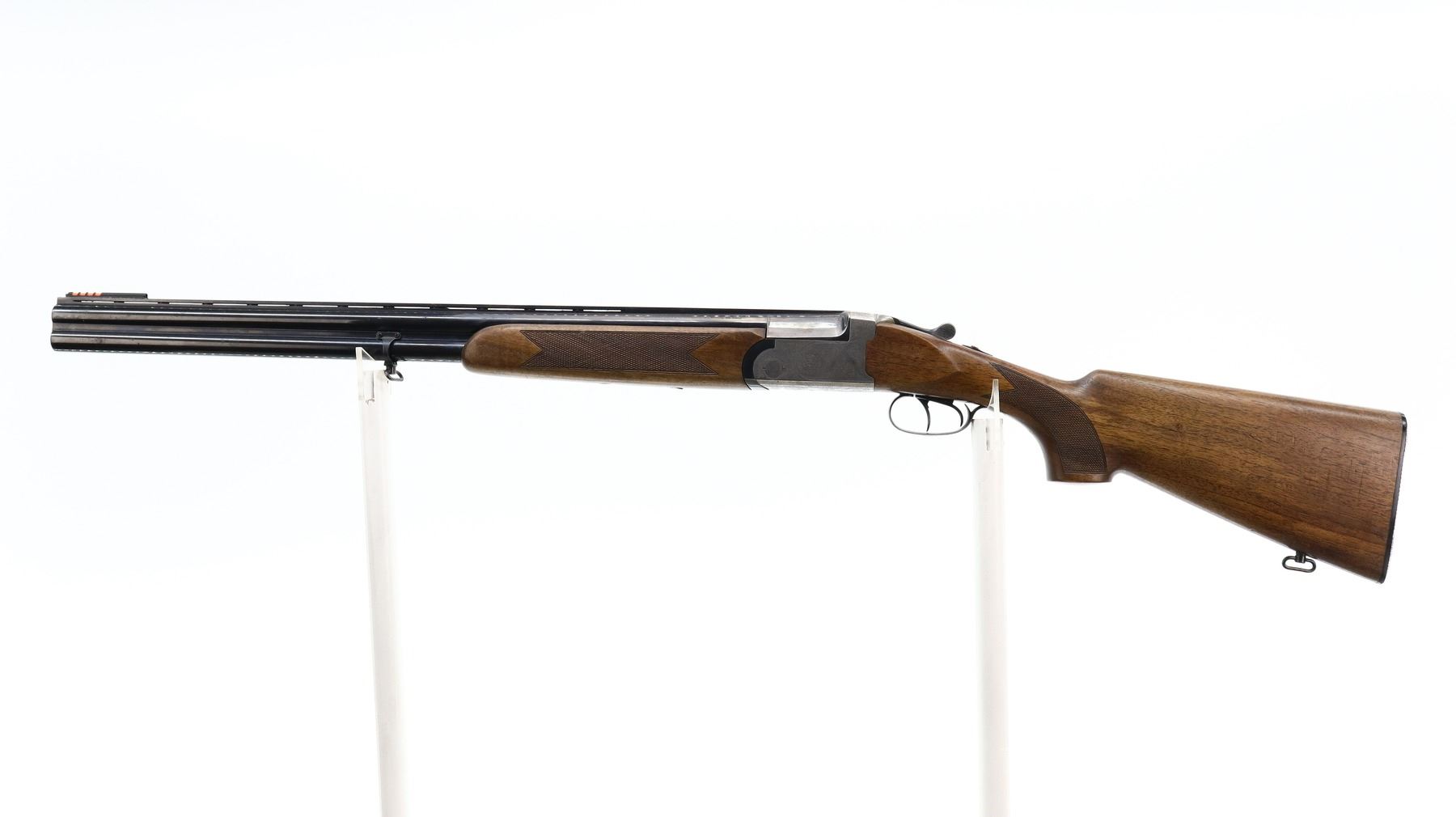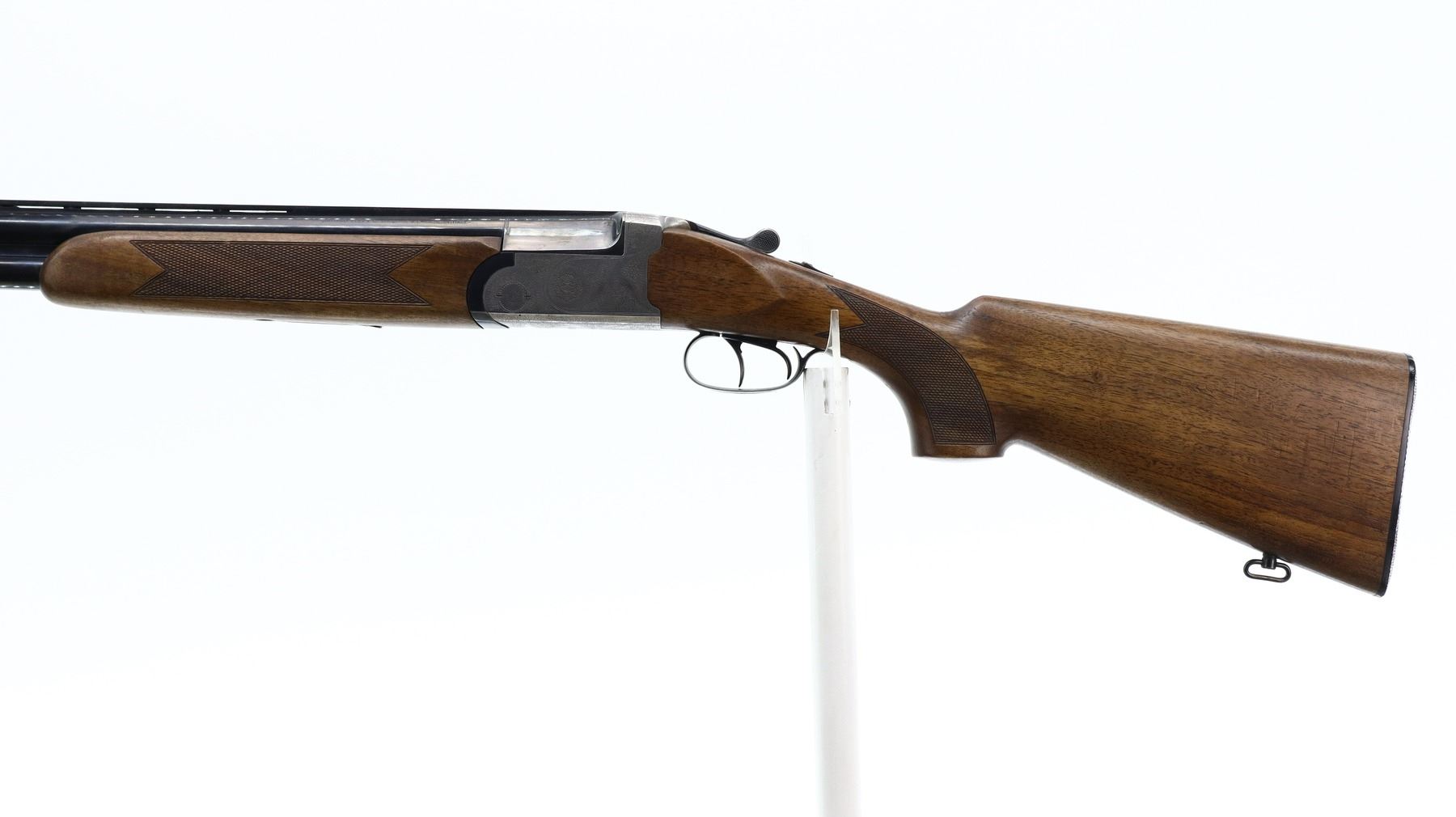 4+/10 , ANTONIO ZOLI , MODEL: OVER UNDER , CALIBER: 12 GA X 3" , BORES ARE VERY GOOD. FIXED MOD AND FULL CHOKES. RED FIBER OPTIC FRONT BEAD, POLISHED BLUE VENT RIB BARRELS, SILVER ENGRAVED RECEIVER, AUTOMATIC SAFETY, EXTRACTOR, DOUBLE TRIGGERS. TWO PIECE WOOD STOCKS, CHECKERED FOREARM HANGER/SCREW BROKEN, CHECKERED PISTOL GRIP, CHECKERED BLACK POLYMER BUTT PLATE AND SLING SWIVELS. METAL FINISH SHOWS SOME SCRATCHES, HANDLING MARKS AND WEAR. STOCKS SHOW SOME DINGS, SCRATCHES AND WEAR. . ACTION: HINGE OVER UNDER SHOTGUN. BARREL LENGTH: 26.5". CONDITION: 4+/10. SERIAL # 146885. CLASS: CANADIAN NON RESTRICTED CLASS