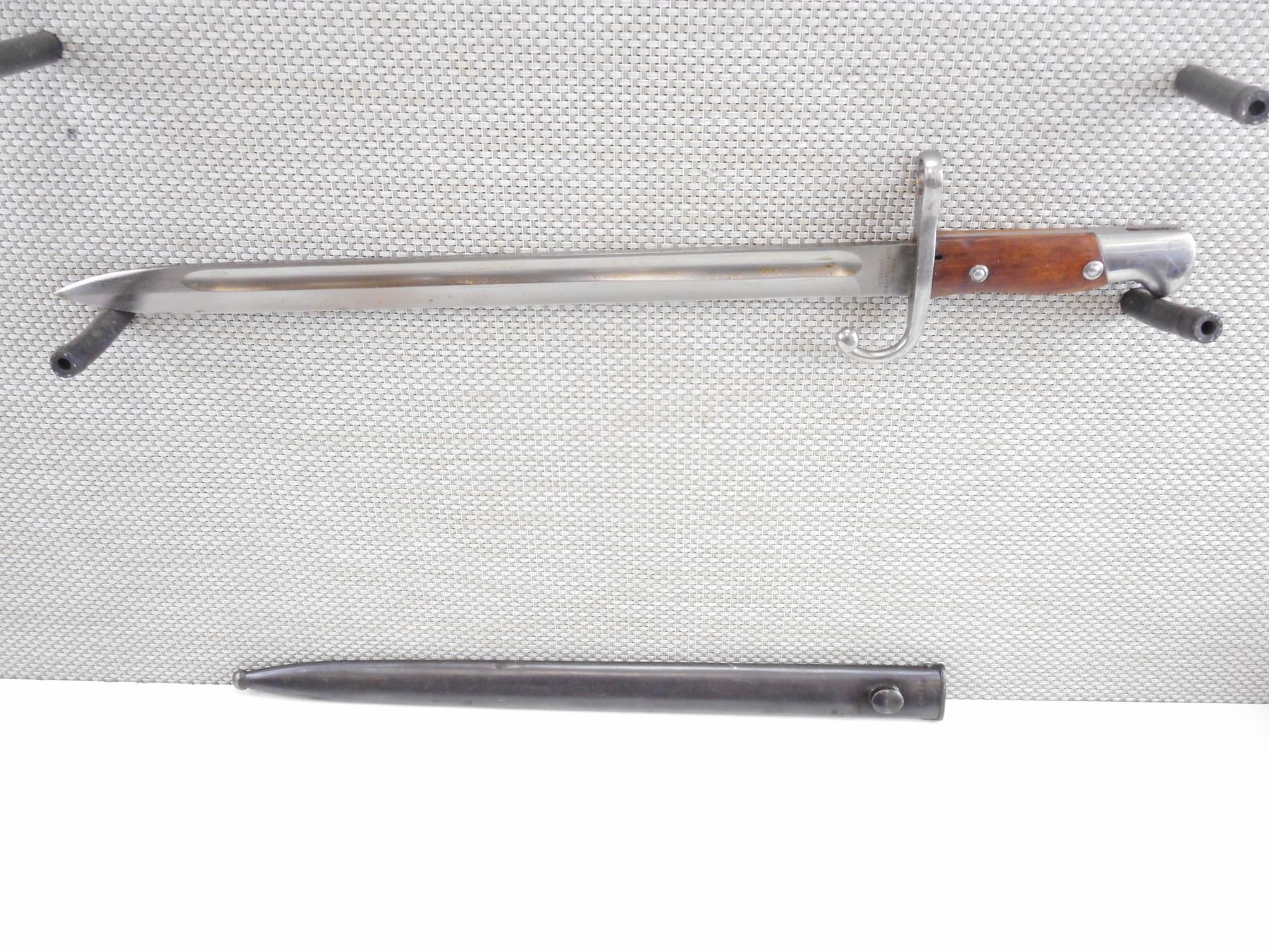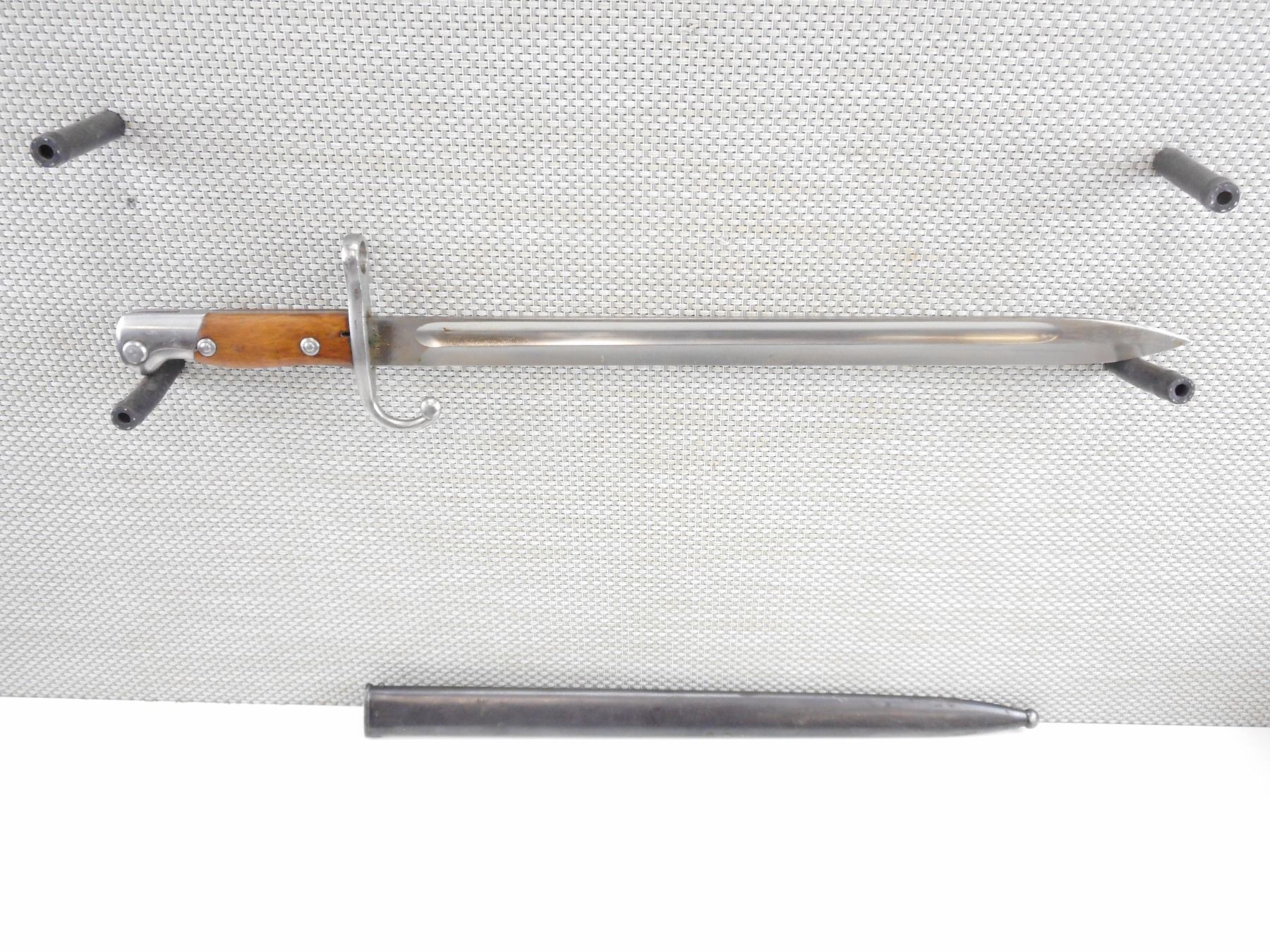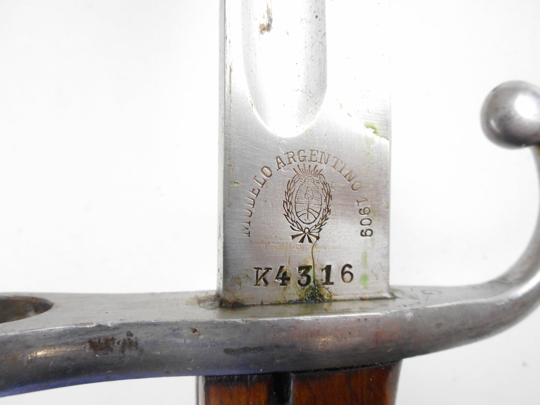 ARGENTINE 1909 BAYONET AND MATCHING SCABBARD , RICASSO MARKED K4316, MODELO ARGENTINO 1909, WEYERSBERG KIRSCHBAUM & SOLINGEN, CROSSPIECE MARKED CX, POMMEL MARKED "RA". BLADE LENGTH APPROX. 15.75" TOTAL LENGTH APPROX. 20.5". SCABBARD MARKED K4316, PROOF MARKS. TIP MARKED "RA".