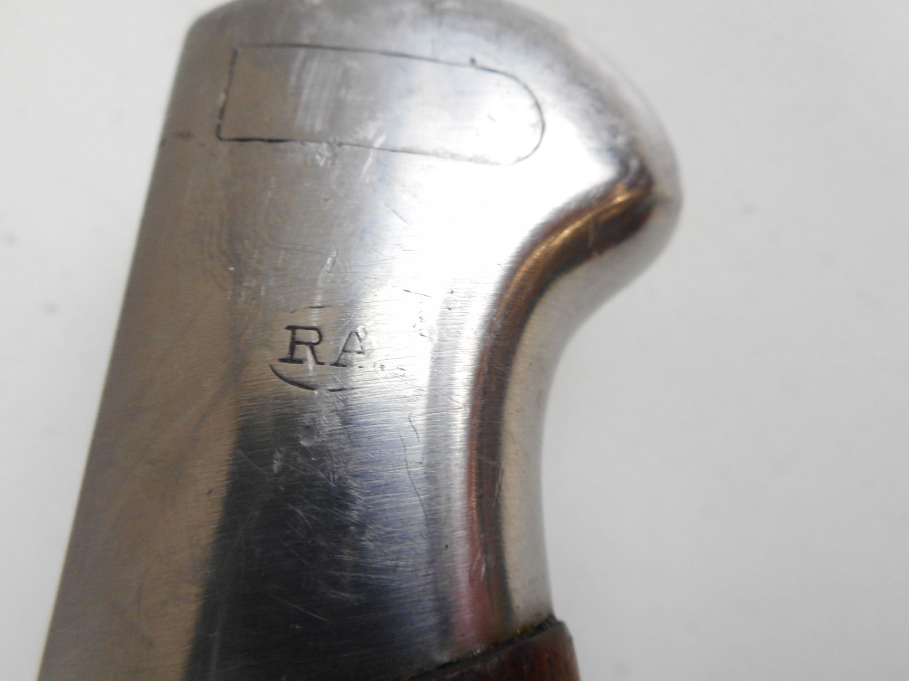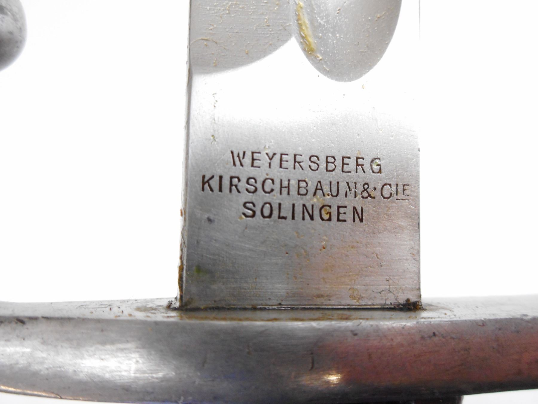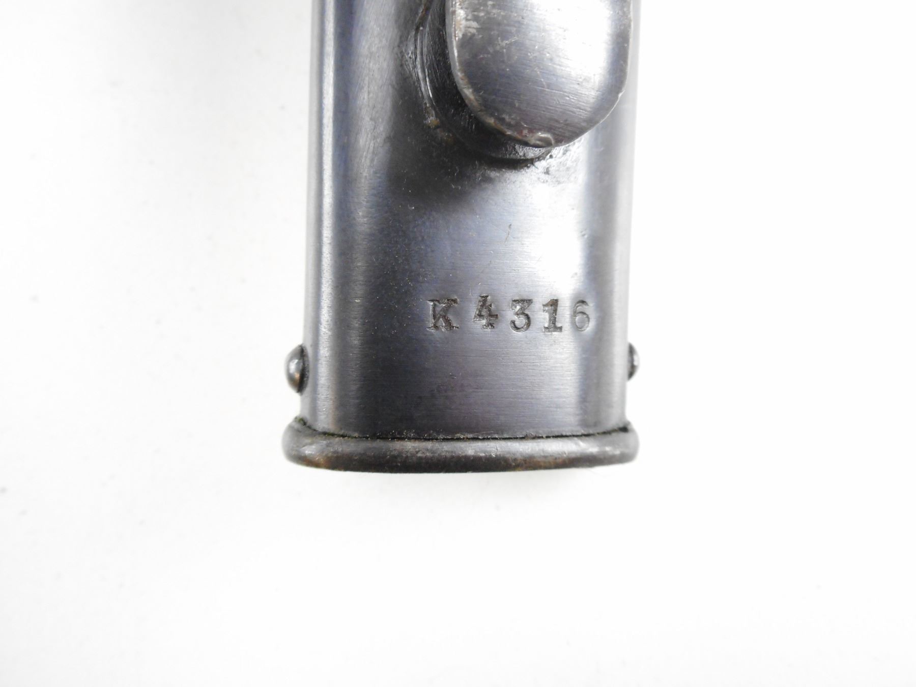 ARGENTINE 1909 BAYONET AND MATCHING SCABBARD , RICASSO MARKED K4316, MODELO ARGENTINO 1909, WEYERSBERG KIRSCHBAUM & SOLINGEN, CROSSPIECE MARKED CX, POMMEL MARKED "RA". BLADE LENGTH APPROX. 15.75" TOTAL LENGTH APPROX. 20.5". SCABBARD MARKED K4316, PROOF MARKS. TIP MARKED "RA".