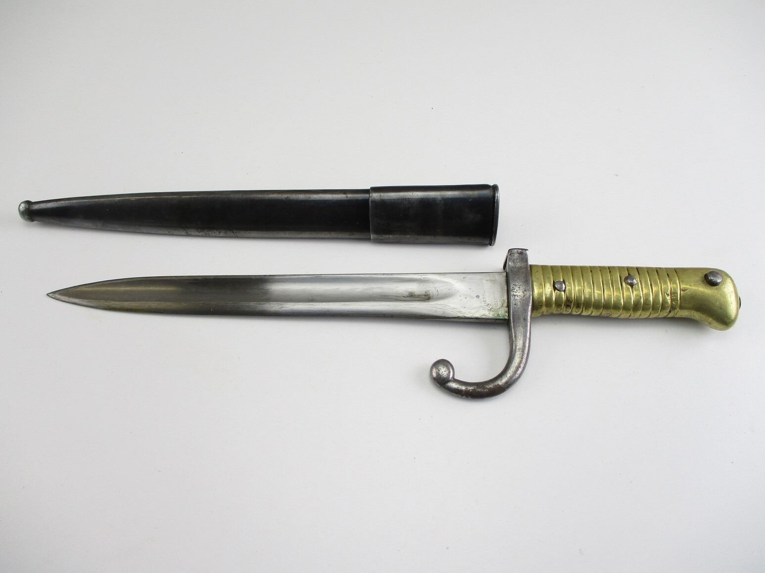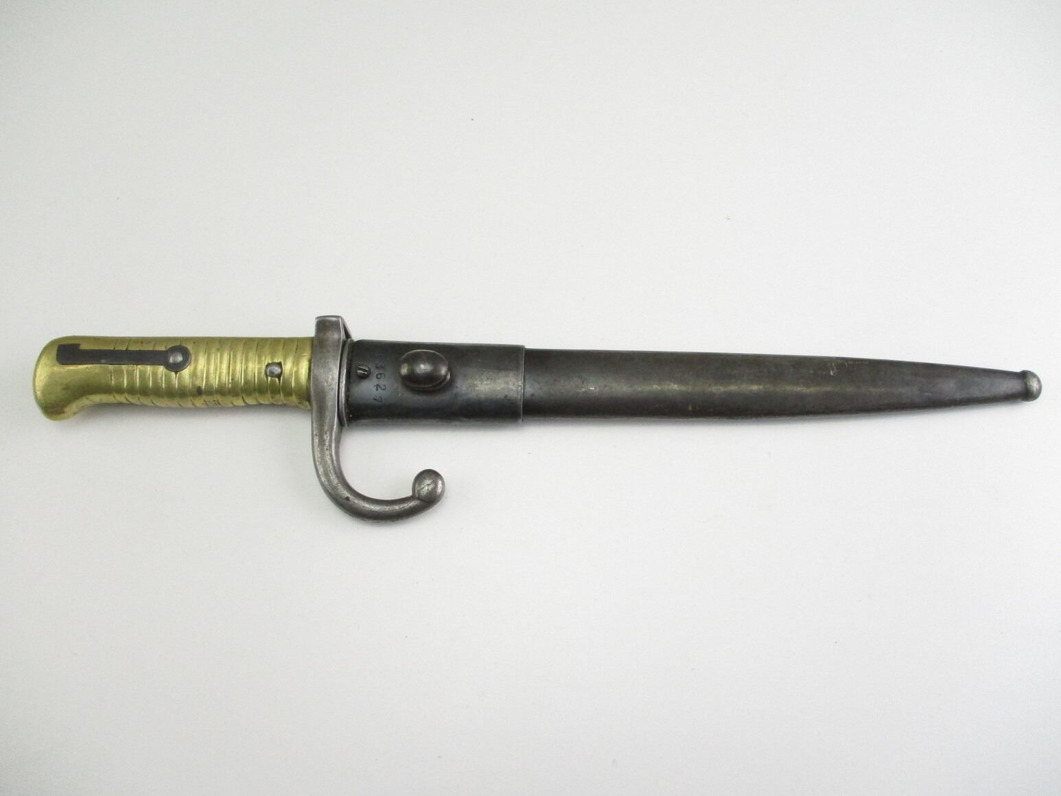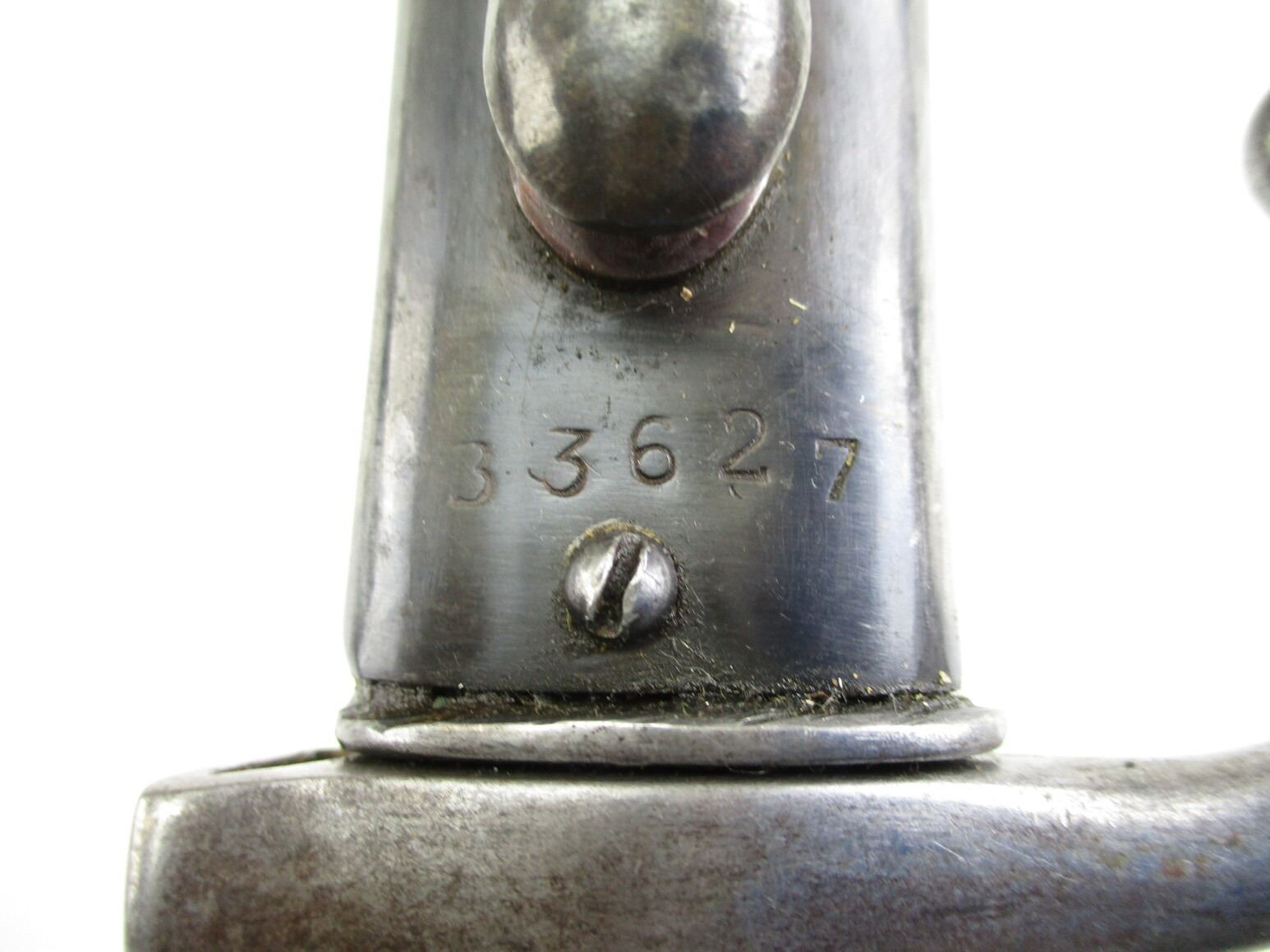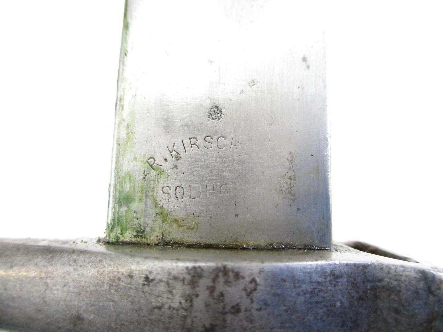 ARGENTINE M1891/31 ENGINEER'S BAYONET. (1) FITS 7.65MM M1891/31 ENGINEER'S CARBINES, RICASSO MARKED: "R. KIRSCHBAUM, SOLINGEN", OTHER-SIDE MARKED: "B3627", HOOKED QUILLON, BRASS GRIP / POMMEL, NO VISIBLE MARKINGS, METAL SCABBARD WITH MATCHING NUMBERS, MARKED: "B3627", BLADE APPROX. 10" & OAL APPROX. 14 5/8".