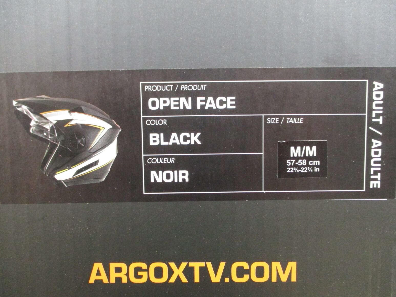 ARGO HELMET , THIS BLACK, OPEN FACE HELMET IS READY FOR ADVENTURE SIZE MEDUIM , RETAIL VALUE $180, GENEROUSLY DONATED BY AUTO NEXUS