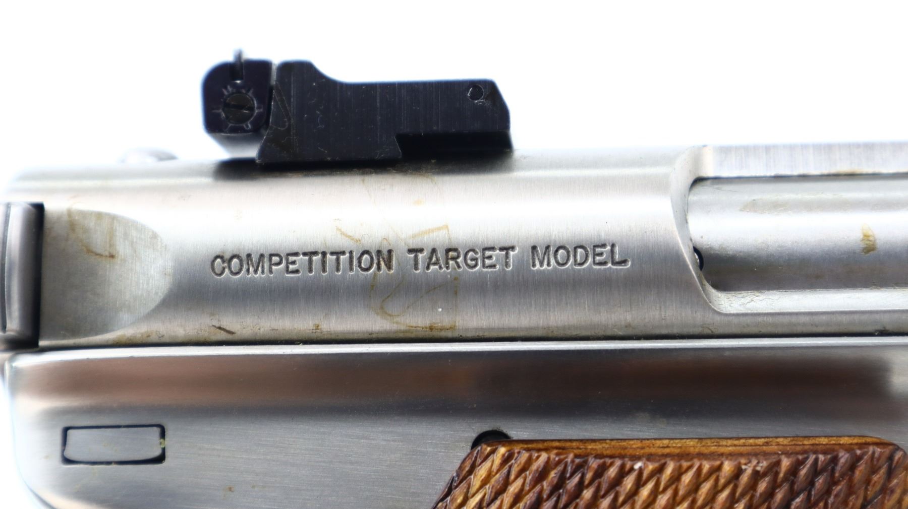 AS NEW IN CASE, RUGER, MODEL: MARK II COMPETITION TARGET, CALIBER: 22 LR , COMES WITH CASE, MANUAL, 2 MAGAZINES, BORE IS EXCELLENT, APPEARS AS NEW, MAY HAVE BEEN TEST FIRED AT THE FACTORY. BLADE FRONT SIGHT WITH RAMP. ADJUSTABLE U NOTCH REAR SIGHT STAINLESS FINISH. FLAT SIDED BULL BARREL. TOP OF RECEIVER DRILLED AND TAPPED FOR SCOPE MOUNT. HEEL MAG RELEASE. TWO PIECE CHECKERED BROWN LAMINATE WOOD GRIPS WITH THUMB REST. INCLUDES SCOPE BASE AND 1" FACTORY RINGS. SHOWS SLIGHT HANDLING MARKS OVERALL. BARREL LENGTH: 175MM, SERIAL # 22385957, CONDITION: AS NEW IN CASE, ACTION: SEMI AUTOMATIC PISTOL, CLASS: CANADIAN RESTRICTED