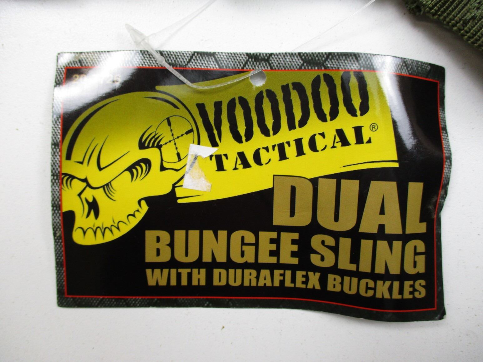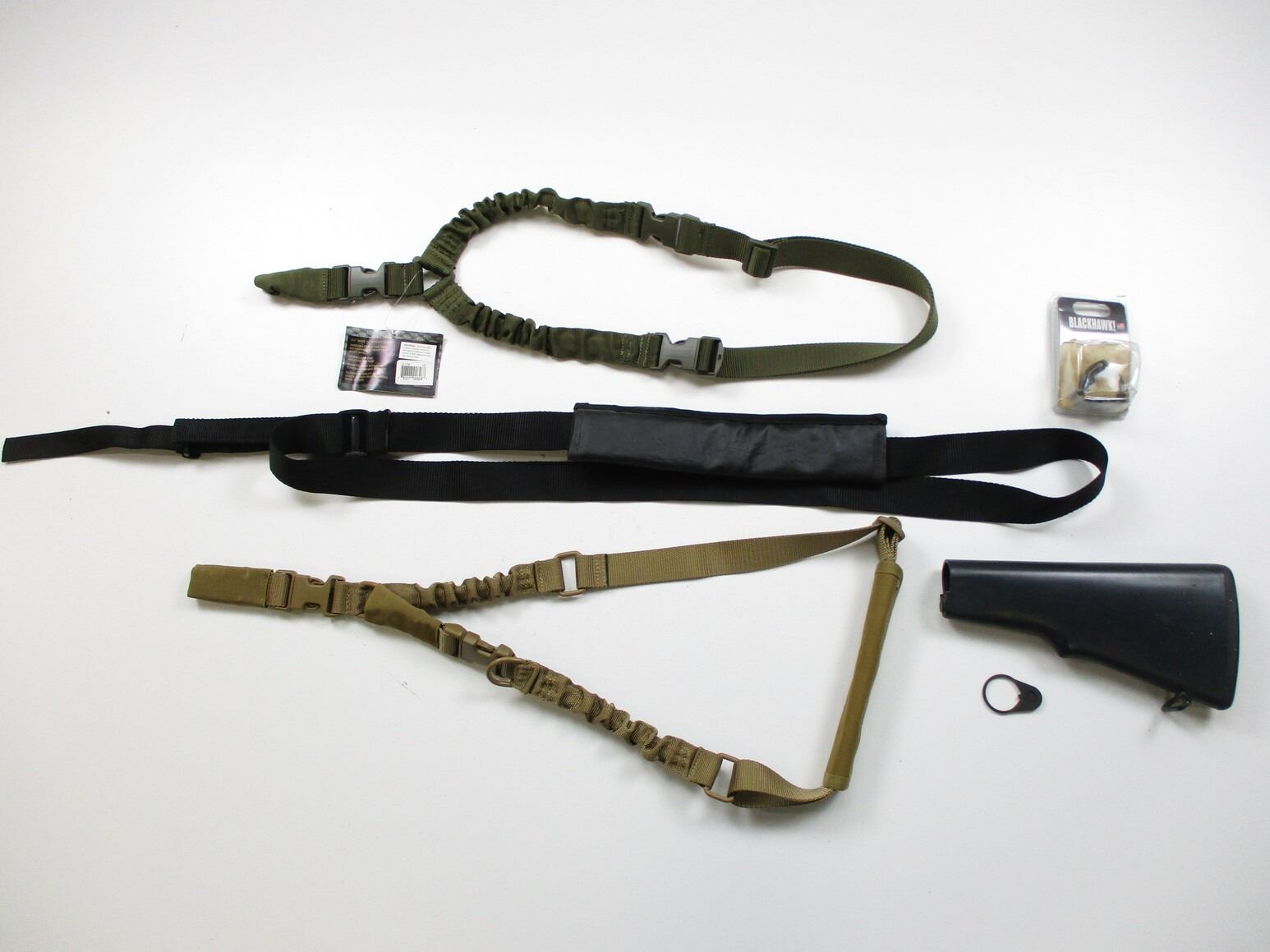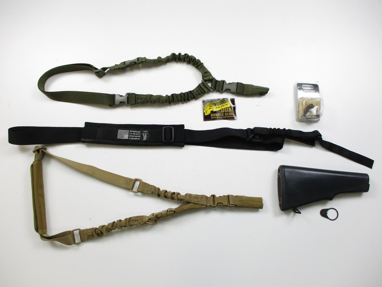 ASSORTED 1 POINT SLINGS ETC , (2) 1 POINT SLING, BUNGEE SLING, WITH NYLON STRAPPING, PLASTIC CLIPS, METAL CARABINER, 1 GREEN WITH VOODOO TACTICAL TAG, 1 TAN SLING, (1) TROY 1 POINT SLING, BLACK NYLON STRAPS, WITH BUNGEE. (1) M16A2 TYPE BUTT STOCK, WITH REAR SWIVEL, TRAP DOOR PLASTIC TAB APPEARS BROKEN. ETC.