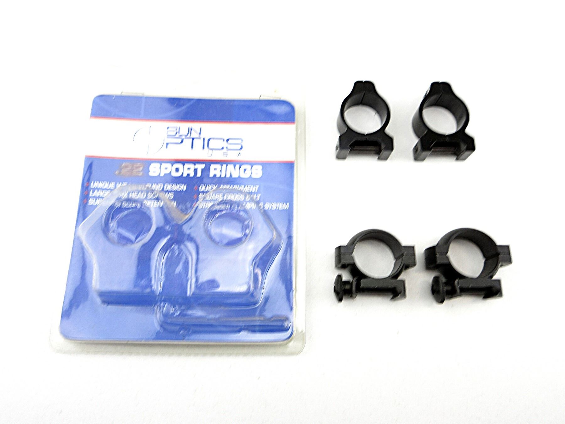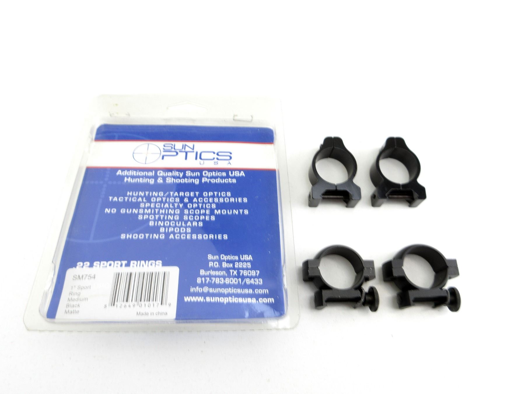 LOT INCLUDES; (1) PAIR OF SUN OPTICS 1" RINGS, BLUED STEEL, UNMARKED, IN ORIGINAL PACKAGING & (1) PAIR OF UNKNOWN 1" RINGS, BLUED STEEL, UNMARKED. MAY REQUIRE FITTING. SEE PHOTOS.