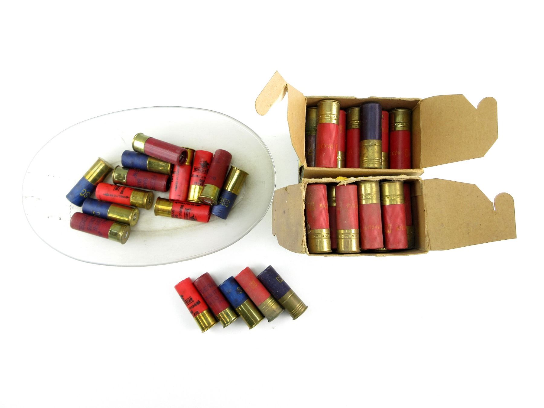 LOT INCLUDES; APPROX. (63) RNDS, VARIOUS MANUFACTURERS, ASSORTED SHOT SIZES INCLUDING; #BB, ##0 BUCK, #00 BUCK, #2, ETC., SOME WATER DAMAGE.