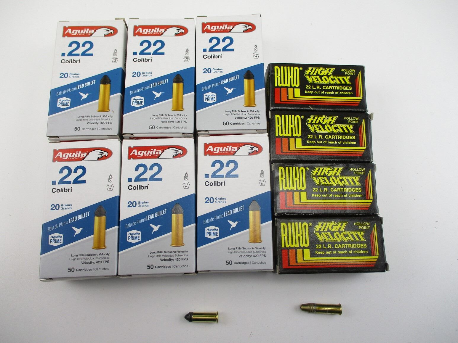 ASSORTED .22 LR AMMO , 492 RNDS. INCLUDES: (200) RUKO .22 LR, 37 GRNS (STATED ON BOX NOT CONFIRMED), HOLLOW POINT, & (292) AGUILA .22 COLIBRI LR, 20 GRNS (STATED ON BOX, NOT CONFIRMED), 420 FPS. , THERE ARE NEW SHIPPING RESTRICTIONS, PLEASE MAKE SURE YOU HAVE READ AND CONFIRMED WE CAN SHIP TO YOU BEFORE BIDDING ON THIS LOT. PLEASE SEE LOT 0 IN THIS SESSION. NO REFUNDS WILL BE ISSUED, OR BIDS RETRACTED.