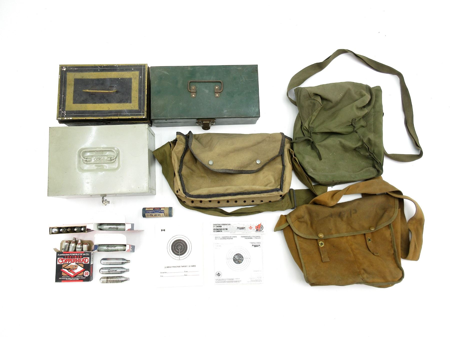 LOT INCLUDES; APPROX (45) ASSORTED AIRGUN STYLE SHOOTING TARGETS, APPROX (20) CO2 CARTRIDGES, (2) GM AC AIRCRAFT TYPE 44 LE SPARK PLUGS, , MARKED: " MERLIN", (1) KEY CHAIN, (3) ASSORTED LOCKABLE METAL CONTAINERS, TWO HAVE KEYS, ASSORTED COLOURS & SIZES, (1) GREEN CANVAS CARRYING BAG WITH SHOULDER STRAP, POSSIBLY MILITARY ISSUE ?, NO VISIBLE MARKINGS, APPROX. 8" X 4.25' X 11" & (2) BROWN CANVAS CARRYING BAGS WITH SHOULDER STRAPS, ASSORTED SIZES. SEE PHOTOS.