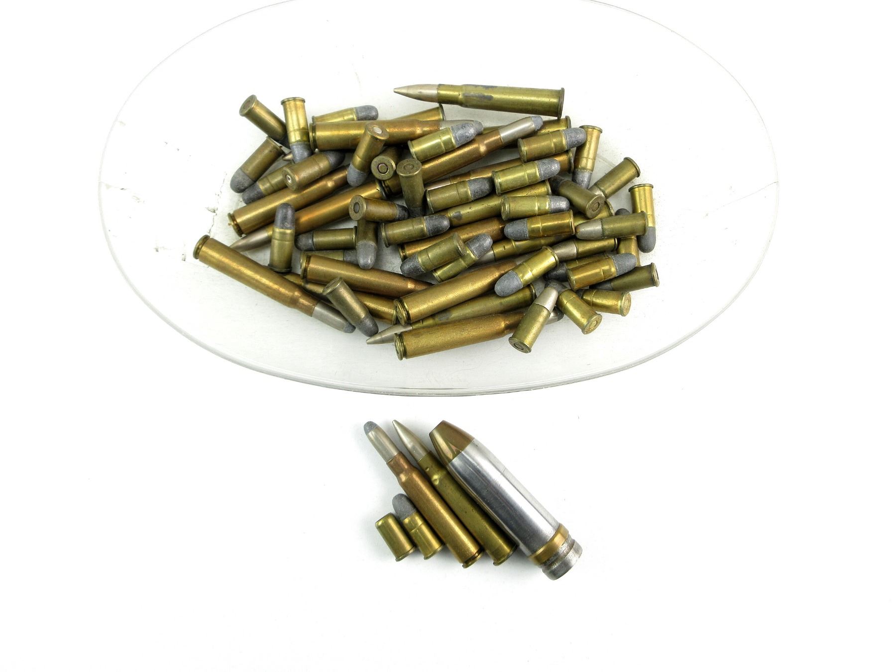 LOT INCLUDES; APPROX.(58) RNDS, VARIOUS CALIBERS INCLUDING; WWI BRITISH MILITARY .303 BR, 8X57S, .38 SHORT, .38 S&W, .380 AUTO, ETC., (1) 20 MM PROJECTILE.