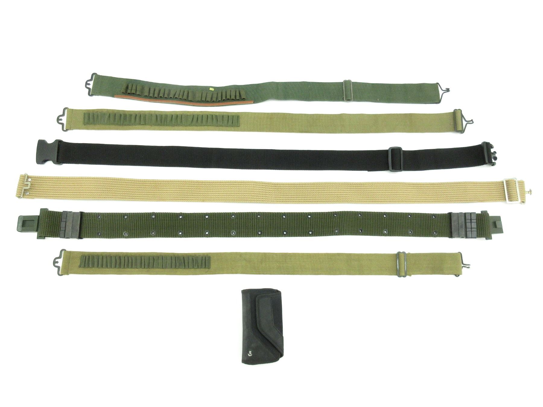 LOT INCLUDES; (2) TAN NYLON AMMO BELTS, WITH 30 ELASTIC POCKETS, HOLDS .380 ACP AMMO, SHOWS LIGHT WEAR & TEAR / USE MARKS, ADJUSTABLE, OAL APPROX. 37", (1) GREEN NYLON AMMO BELT, WITH 24 ELASTIC LOOPS, HOLDS .410 GAUGE SHOTGUN SHELLS, ADJUSTABLE, OAL APPROX. 33", (3) TACTICAL STYLE BELTS, NYLON CONSTRUCTION, ADJUSTABLE, OAL APPROX. 40" TO 47", ETC. SEE PHOTOS.