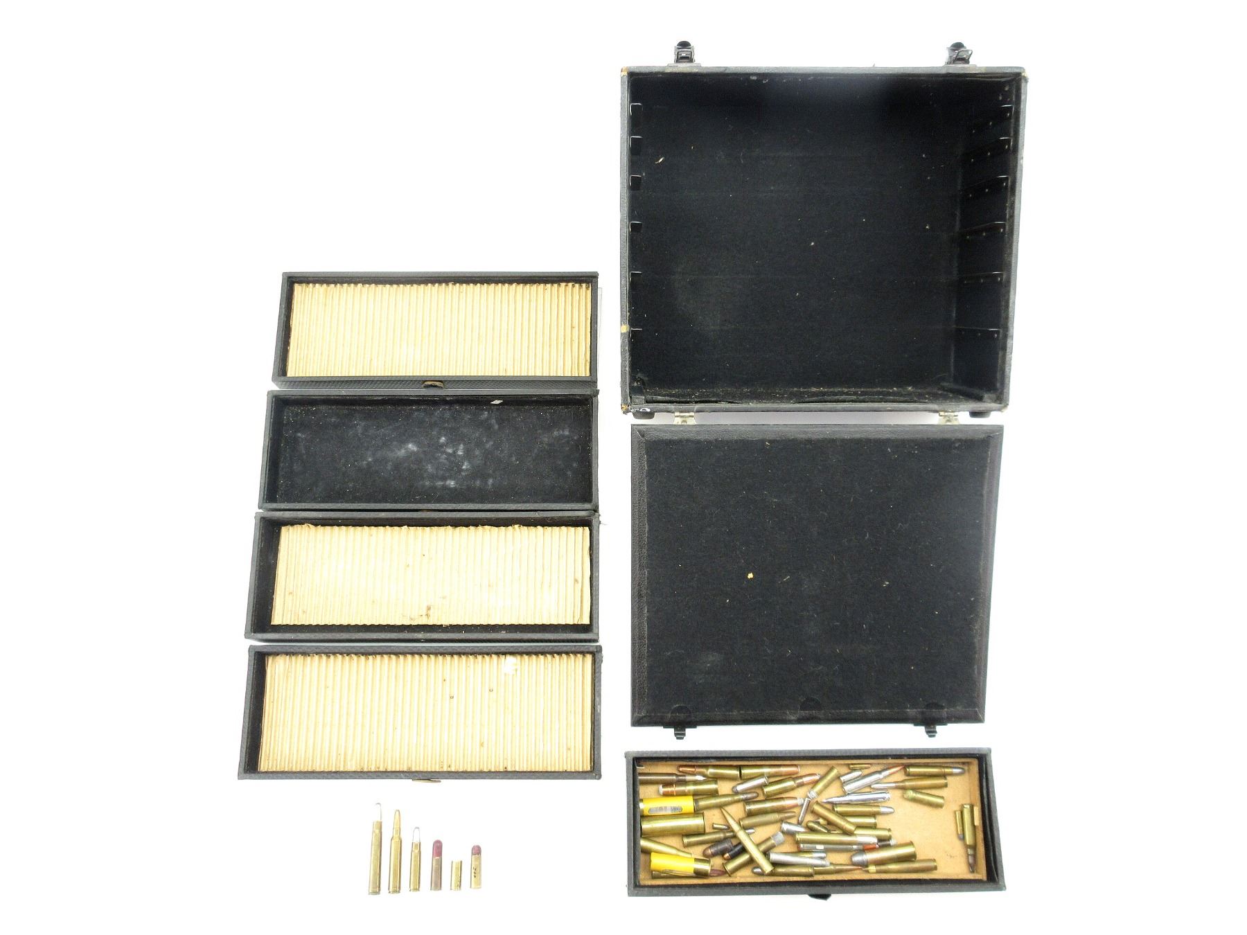 LOT INCLUDES; APPROX. (44) RNDS, VARIOUS CALIBERS INCLUDING; .44 S&W SPL, .44-40 WIN .35 REM, .375 H&H MAG.308 NORMA MAG, .44 XL, ETC., (1) BLANK, (1) WOODEN BULLET, (5) DUMMY RNDS, (1) NON-PRIMED BRASS CASE, (1) WOODEN AMMO STORAGE BOX, (5) SLIDE DRAWERS, APPROX OAL 16"X6 1/2"X14 1/2", SEE PHOTOS.