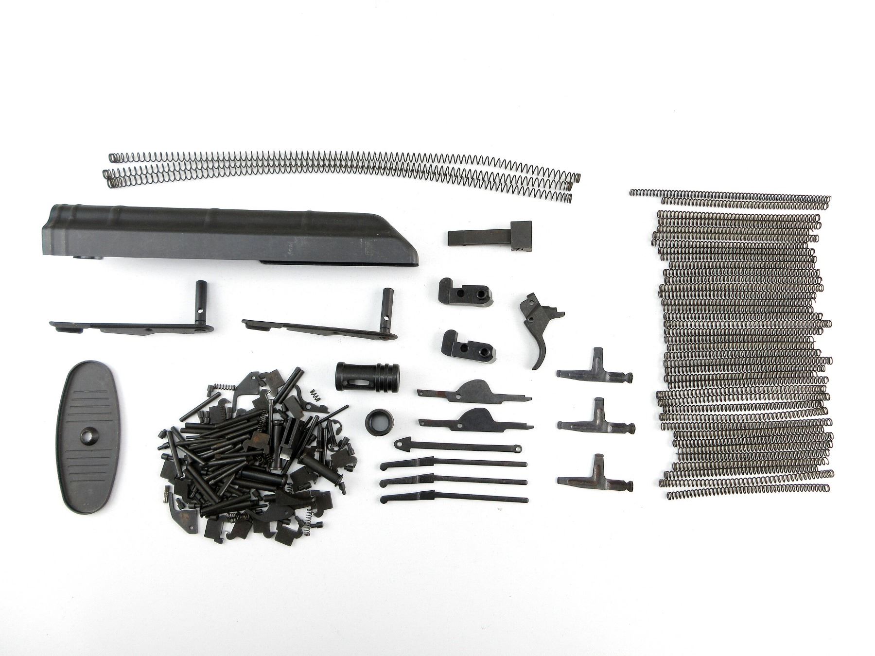 LOT INCLUDES; (1) TOP GUARD, (3) SAFETY LEVERS, (1) TRIGGER, (1) FLASHHIDER, (1) MUZZLE COVER, (1) REAR SIGHT, (2) EJECTORS, (2) EXTRACTORS, (2) HAMMERS, ASSORTED SPRINGS / SCREWS / PLUNGERS / ETC. MAY REQUIRE FITTING. SEE PHOTOS.